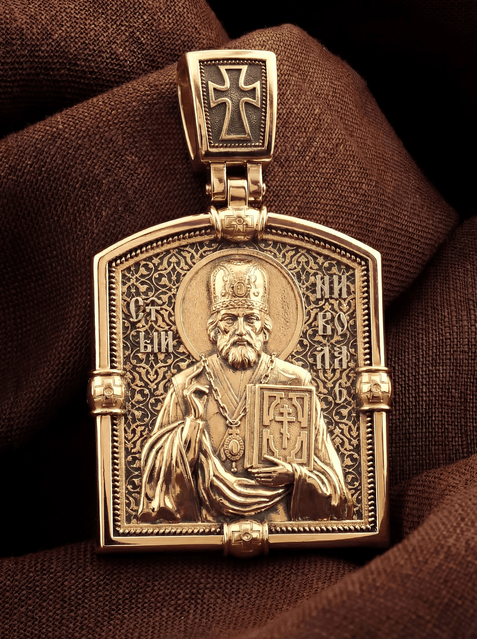 Лицевую сторону возглавляет икона Святителя Николая Чудотворца. Святитель Николай родился во второй половине III века в Малой Азии в Ликийском городе Патары. С рождения Божий Угодник проявлял необыкновенные дарования. Сохранилось Предание, что во время крещения он, никем не поддерживаемый, простоял в купели три часа. С детства святитель избегал пустых развлечений, любил молитву, прекрасно учился и проводил свободное время за чтением Священного Писания. По достижении зрелого возраста жители Патар выбрали его своим пресвитером. Несколько лет спустя Святой Николай стал епископом в городе Миры, столице Ликии.