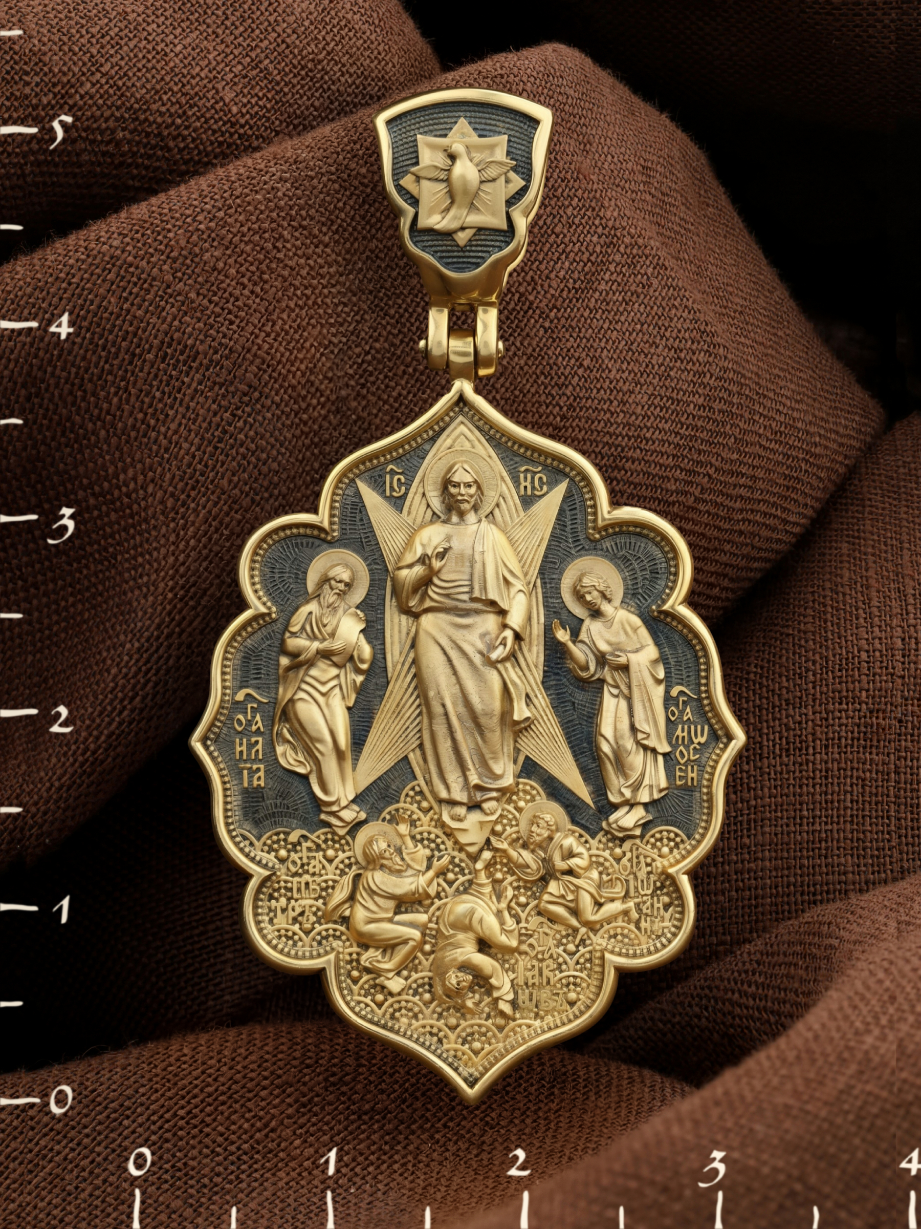 На лицевой стороне образка изображена икона «Преображения Господня». Преображение — одно из немногих Евангельских событий, которое по канону можно изображать не только там, где оно реально происходило. Преображение Господне на иконах можно увидеть на фоне посвященных ему монастырей и храмов. Это объясняется тем, что каждый христианский храм является духовным Фавором, где в церковных таинствах и молитве душа верующих приближается к своему преображению. Образ являет Господа Иисуса Христа в тот момент, когда Он предстал трем Своим ученикам: Петру, Иакову и Иоанну Богослову. Пророки Моисей и Илия предстояли рядом и беседовали с Ним. Апостолы едва могли вынести бесконечную радость, которая охватила их в присутствии Бога. Когда же на гору спустилось облако и раздался глас Божий: «Сей есть Сын Мой Возлюбленный; Его слушайте», апостолы в сильном страхе пали на землю (Лк. 9:35). На иконах «Преображение Господне» они так и изображаются — лежащими у ног Христа. Во главе образка изображен парящий голубь — символ Святого Духа и Его благодати.