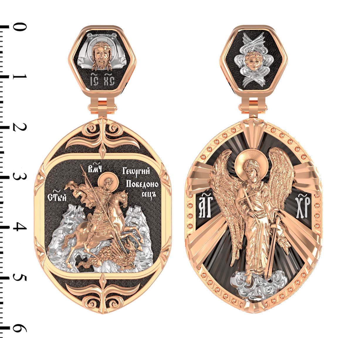 Основой композиции лицевой стороны является изображение Святого Георгия Победоносца. Святой Георгий — один из наиболее почитаемых святых в Христианской Церкви. На Руси он известен как Юрий или Егорий, покровитель воинов, помощник в крестьянском труде. На образке изображено самое знаменитое чудо святого: спасение принцессы от змея, которому она предназначалась в жертву. Чудо это имеет символическое толкование. Принцесса означает душу человеческую, а змей — дьявола, желающего ее поглотить. Св. Георгий, небесный защитник, спускается с Небес, чтобы помочь душе избавиться от гибели.
