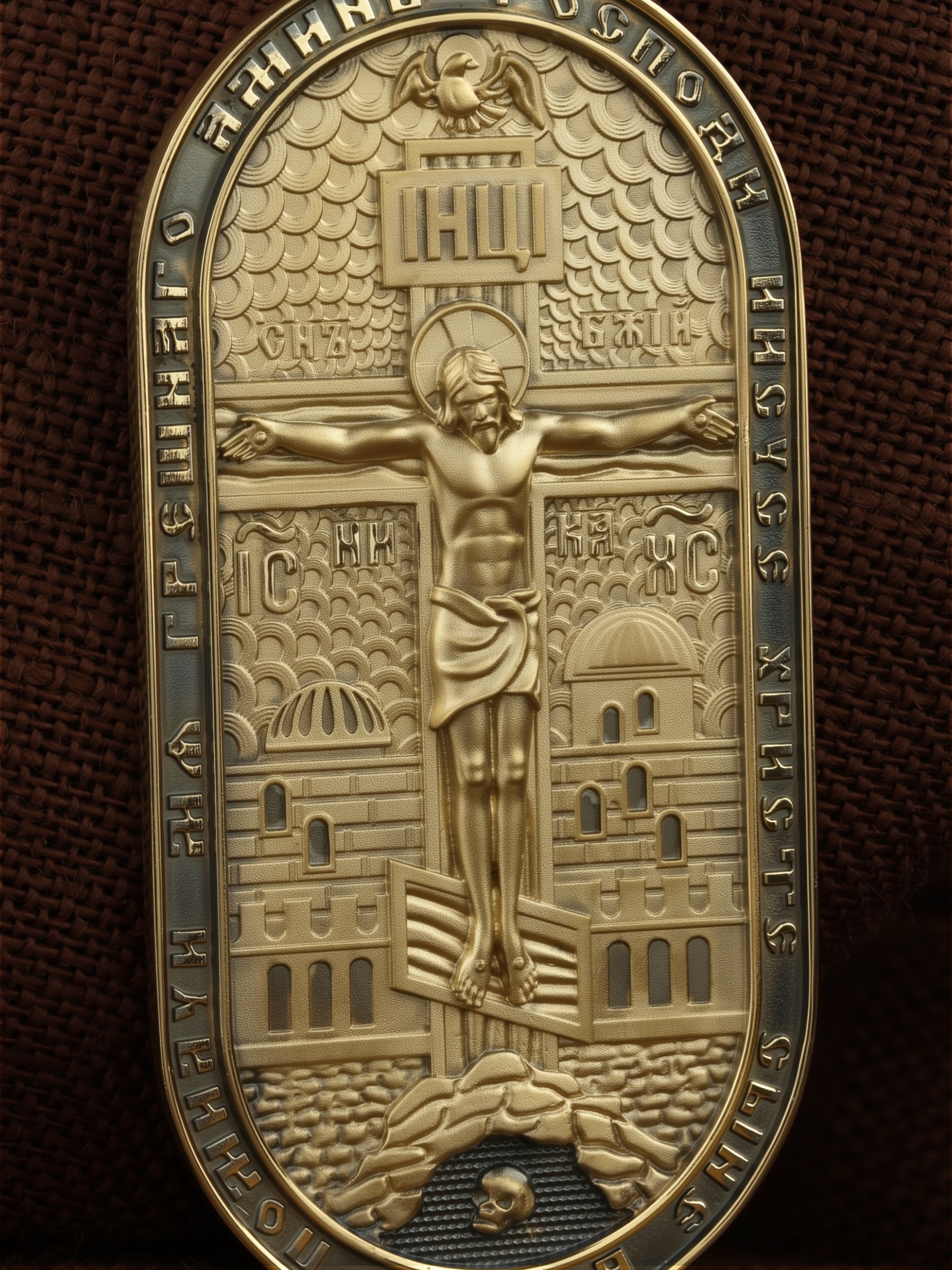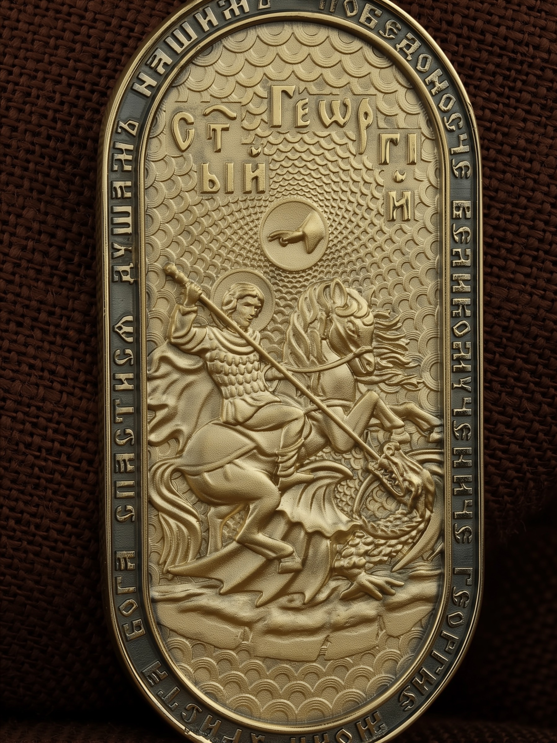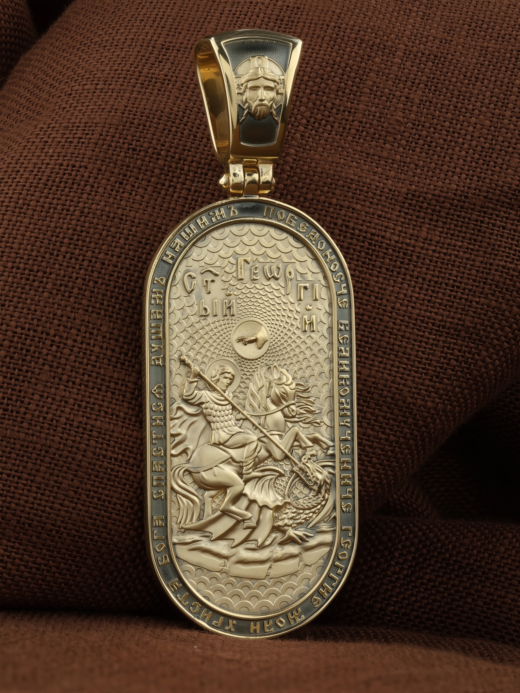 По контуру написана молитва: «Победоносче Великомучениче Георгие, моли Христа Бога спастися душам нашим». На кулонном кольце изображен Спас Нерукотворный — Символ вочеловечившегося Божества.
