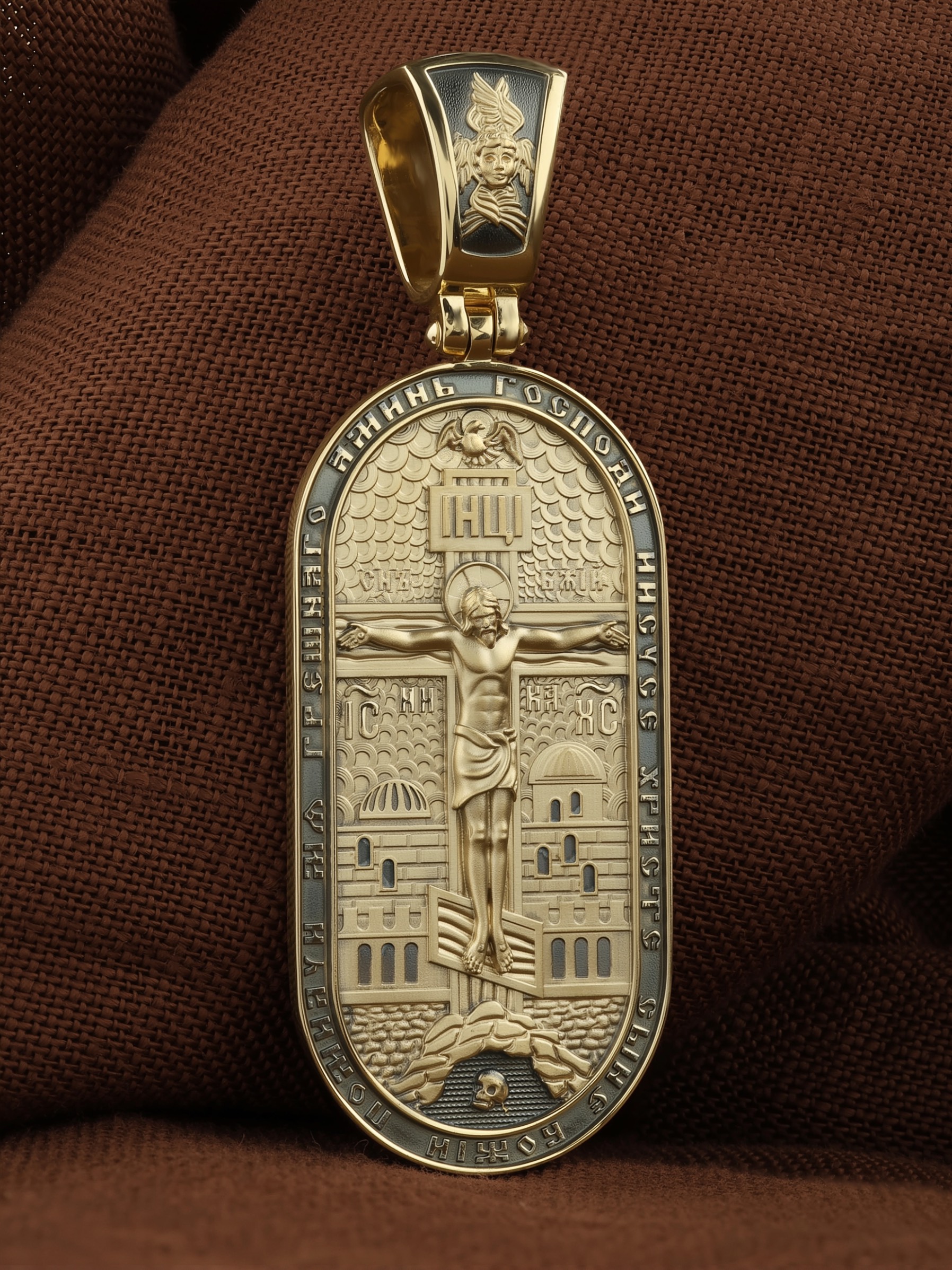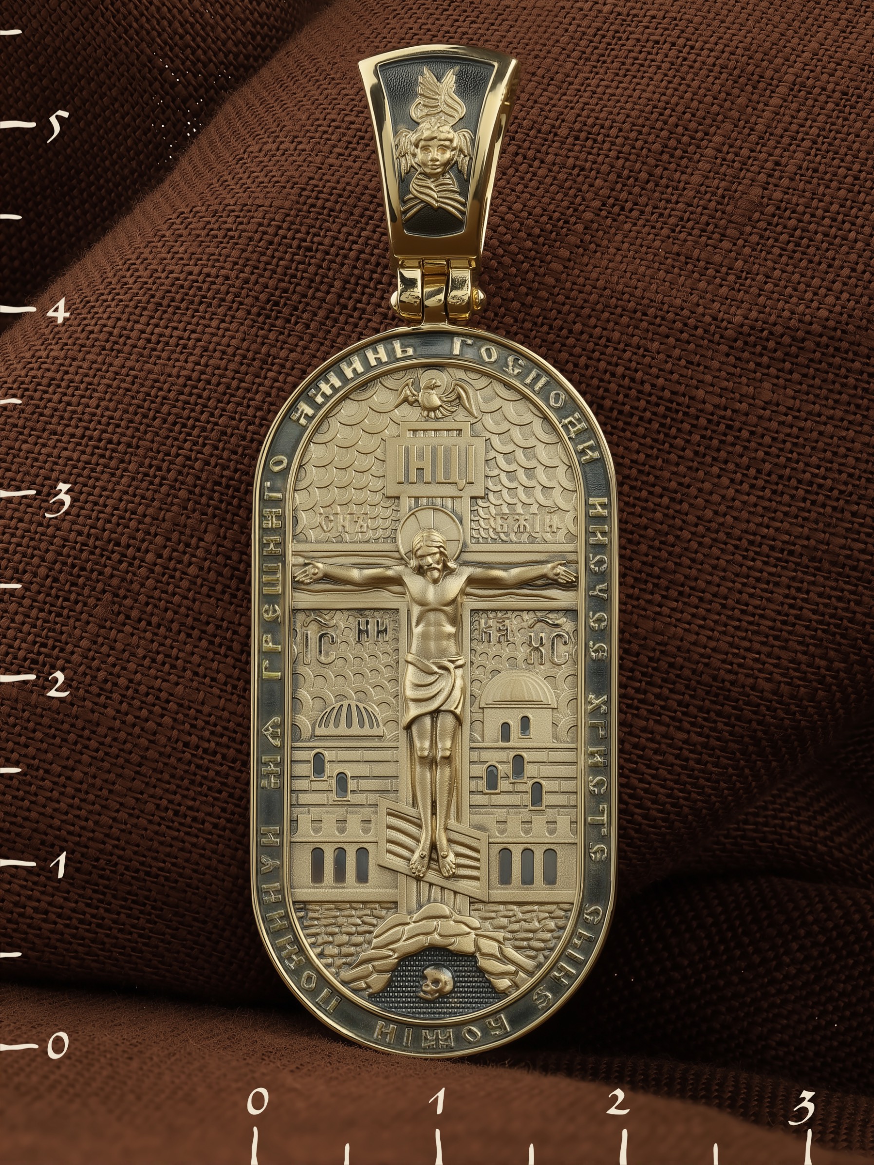 По контуру образка написана молитва: «Господи Иисусе Христе, Сыне Божий, помилуй мя грешного. Аминь». На кулонном кольце изображен шестикрылый Серафим — самый приближенный к Господу Ангел