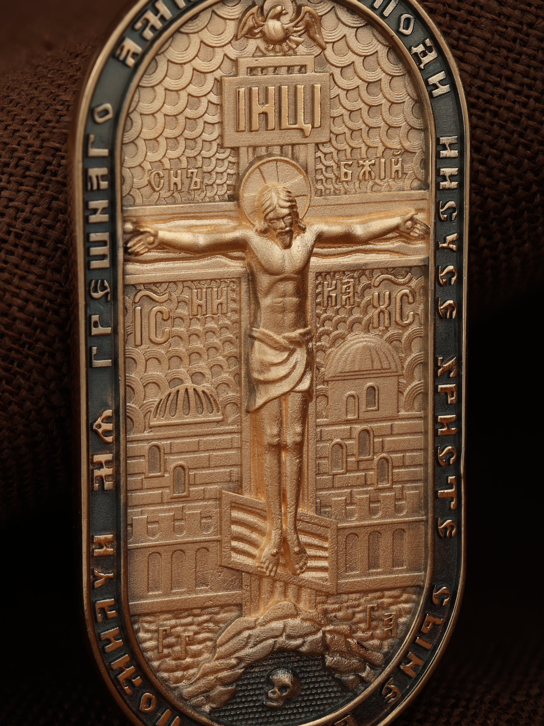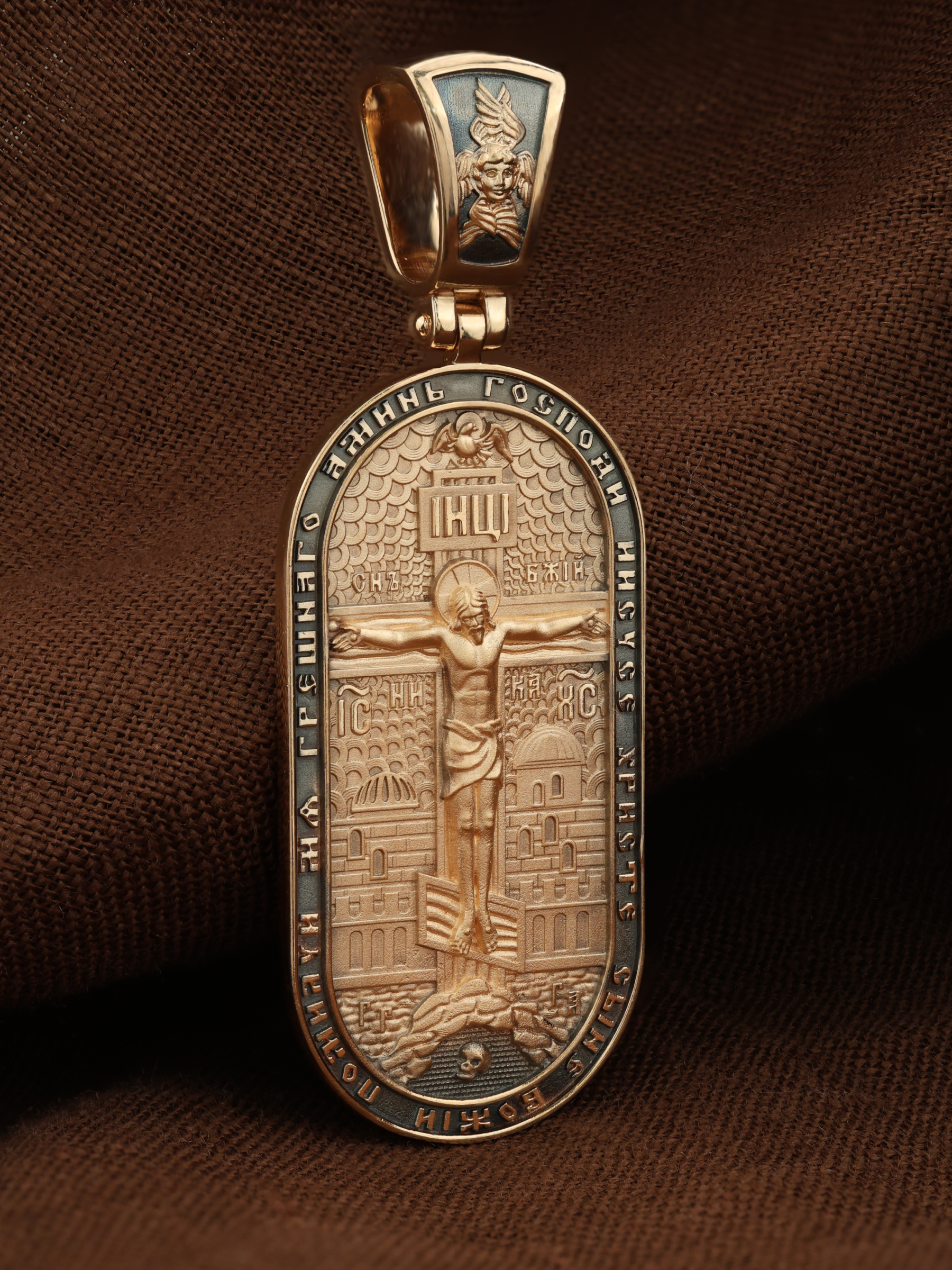 Центральную часть лицевой стороны занимает Распятие Христа — образ жертвы, принесенной Господом за грехи людей. Именно ко Христу, сошедшему на землю ради нашего спасения, возносятся все молитвы. Рядом с Его образом помещены слова — «НИКА» (греч. — Победитель) и «СЫН БОЖИЙ». Эти слова характеризуют Господа как Великого Архиерея, победителя смерти. Также Распятие сопровождается надписями, олицетворяющими Христа — это святое имя Христа «IC» (Иисус) «ХС» (Христос). Верхняя перекладина символизирует собой табличку с надписью «IHЦI» — Иисус Назарянин Царь Иудейский. Возвышение, на котором стоит Крест, символизирует гору Голгофу, на которой произошло Распятие. У подножия Креста изображают прах Адама, обозначенный черепом. На кулонном кольце изображен шестикрылый Серафим — самый приближенный к Господу Ангел. По контуру образка написана молитва: «Господи Иисусе Христе, Сыне Божий, помилуй мя грешного. Аминь»