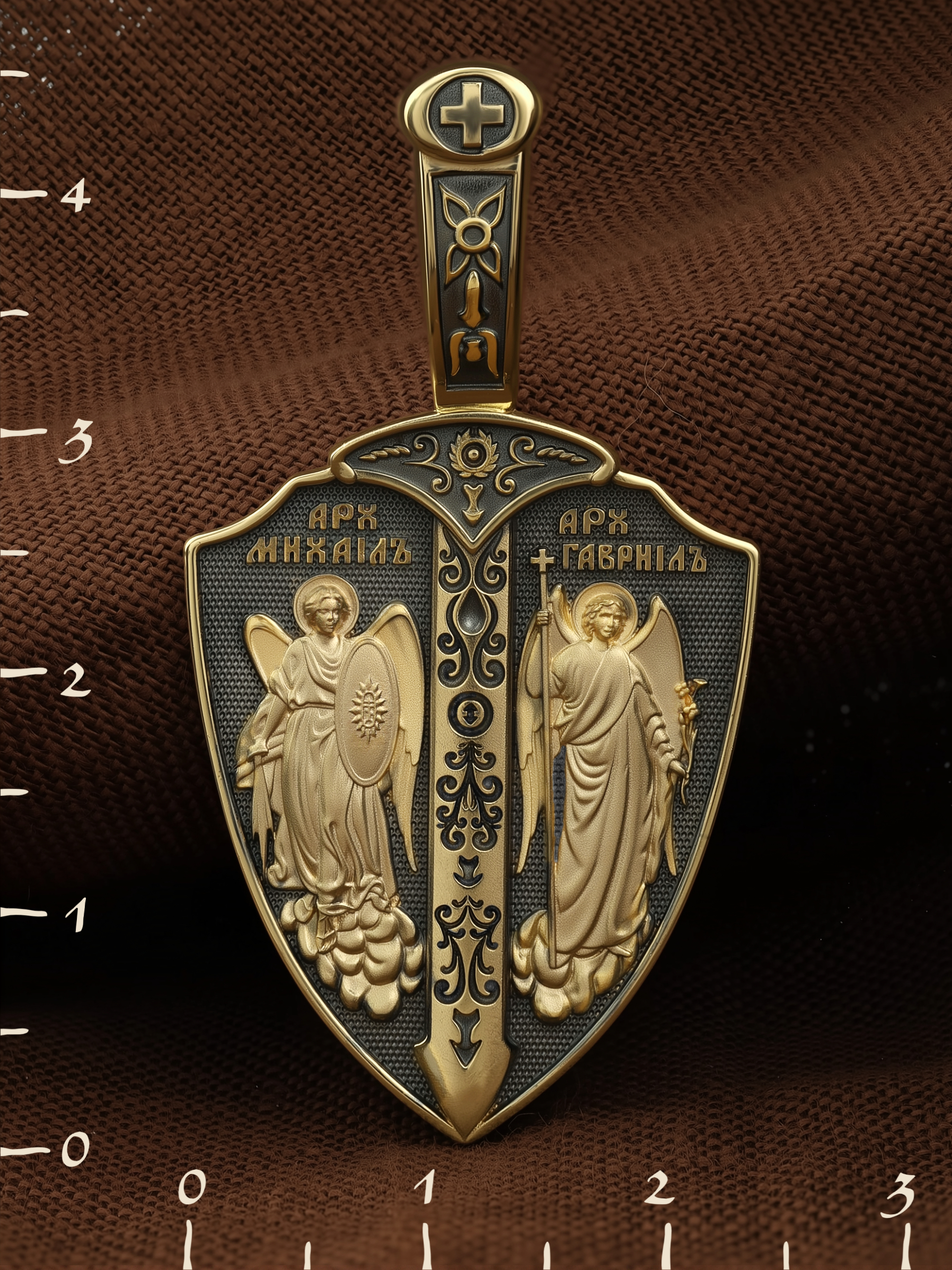 Образок выполнен в виде воинского щита и меча. На лицевой стороне образка изображены Архангел Михаил и Архангел Гавриил. Архангел Михаил изображен в воинственном виде с огненным мечом в правой руке и щитом в левой руке. Архангел Михаил — верный служитель Божий, который низринул с Неба возгордившегося денницу с другими павшими духами. В Православии его называют Архистратигом, что означает глава святого воинства Ангелов и Архангелов. Архангел почитается как покровитель воинов и всех верных Богу и ведущих борьбу против сил зла, борец против ересей, а также защитник душ умерших, страж райских врат. Архангел Гавриил изображен с крестом в правой руке и цветком лилии в левой руке. Он несколько раз упоминается в Писании, как Небесный вестник, которого Бог посылает, чтобы возвестить людям Свои планы о спасении рода человеческого. Так, Архангел Гавриил несколько раз являлся пророку Даниилу и раскрывал ему тайны пришествия Мессии, гонений антихриста и конца мира (Дан. 8, 16, 9−21). Перед пришествием Сына Божия в мир архангел Гавриил явился в храме старцу Захарии и сообщил ему о чудесном зачатии Предтечи. Через шесть месяцев он явился в Назарете Деве Марии с вестью об избрании Ее быть Матерью Христа Спасителя (Лк. 1). Когда Господь перед Своими страданиями молился в Гефсиманском саду до кровавого пота, на укрепление Его, по Церковному Преданию, был послан с Небес Архангел Гавриил. (Лк.22:43). Жены мироносицы услышали от Архистратига радостную весть о Воскресении Христовом.