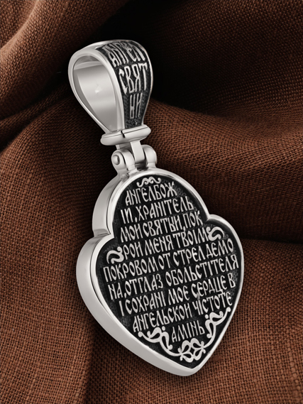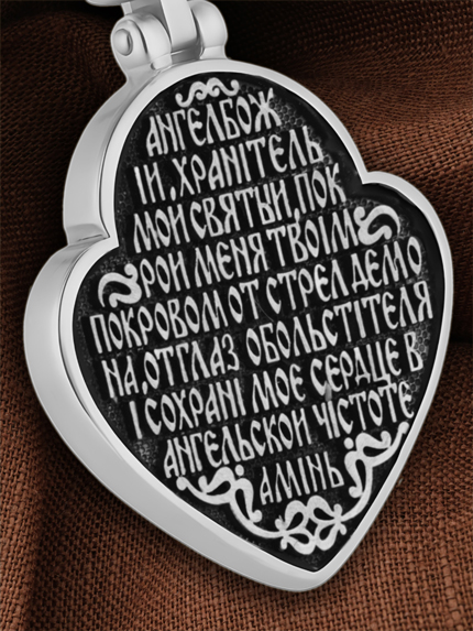 На оборотной стороне образка написана молитва: «Ангеле Божий, Хранитель мой Святый, покрой меня твоим покровом от стрел демона, от глаз обольстителя и сохрани мое сердце в ангельской чистоте. Аминь».