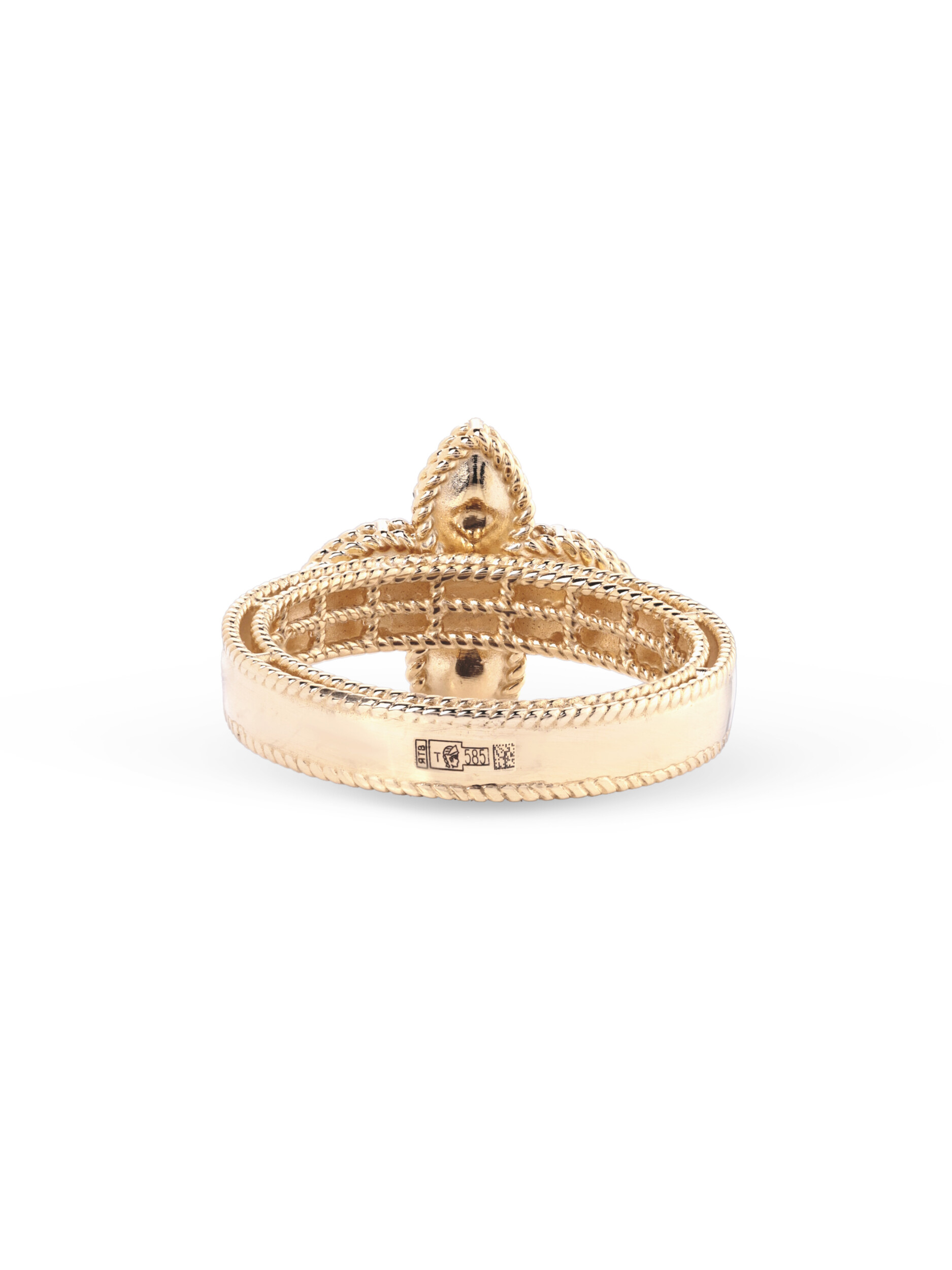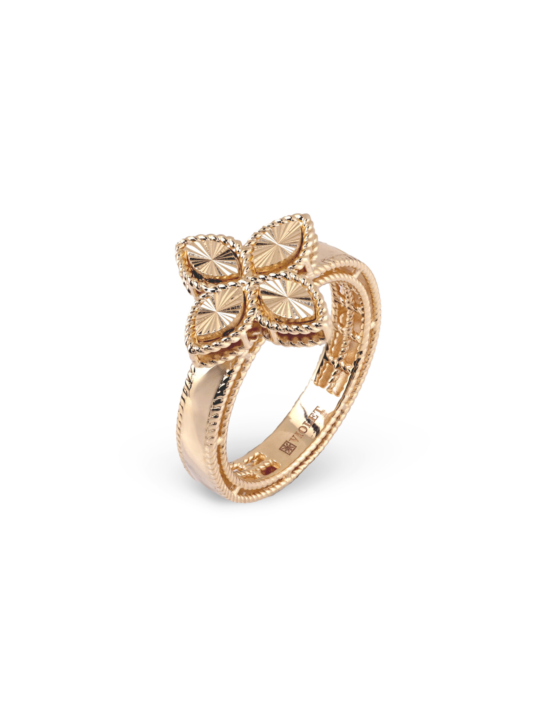 Элегантное кольцо из красного золота 585 пробы из коллекции De Luxe — Венецианская принцесса станет безупречным акцентом вашего образа. Дизайн изделия, вдохновленный классическим мотивом клевера, притягивает взгляд своей утонченностью и вниманием к деталям. Каждый элемент декора тщательно проработан, создавая неповторимую игру света на поверхности благородного металла, а оригинальное плетение шинки подчеркивает статус и высокое качество ювелирной работы.