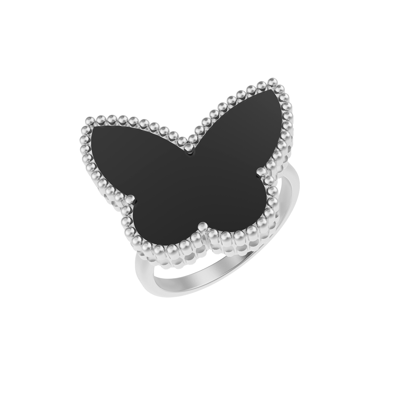 Элегантное кольцо из белого золота 585 пробы из коллекции De Luxe — Бабочки станет утонченным акцентом вашего образа. Дизайн украшения воплощает легкость и изящество, обыгрывая популярную тему бабочек. В центре композиции находится одна крупная вставка черного оникса, глубокий цвет которой создает эффектный контраст с благородным блеском металла.