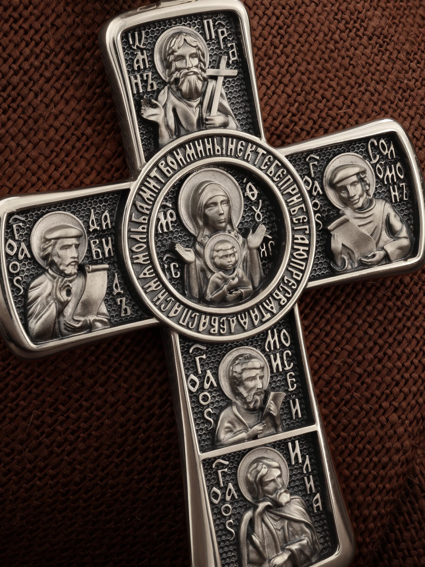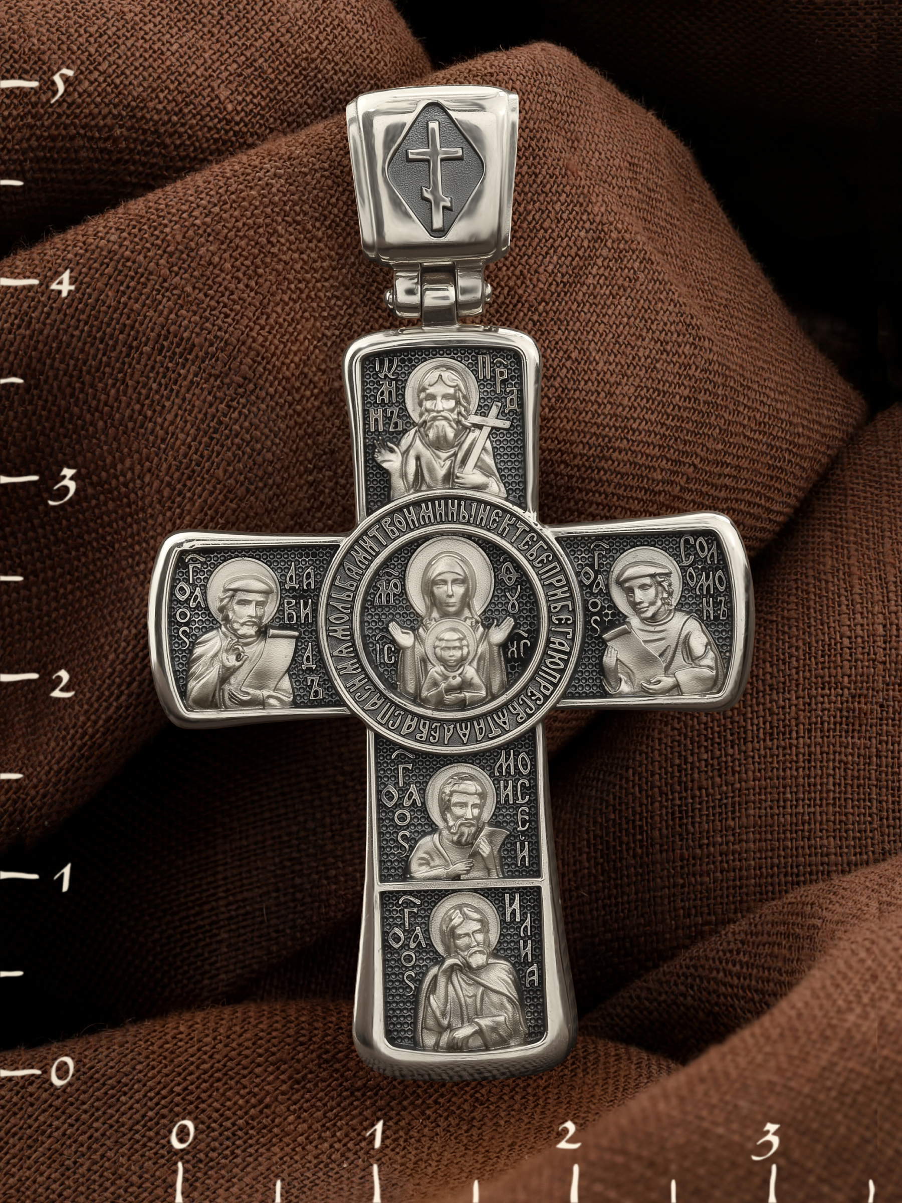 Центральную часть оборота креста украшает икона Божией Матери «Знамение». Вокруг Ее образа написана молитва: «Ныне к Тебе прибегаю, Пресвятая Дева, спаси мя мольбами Твоими».