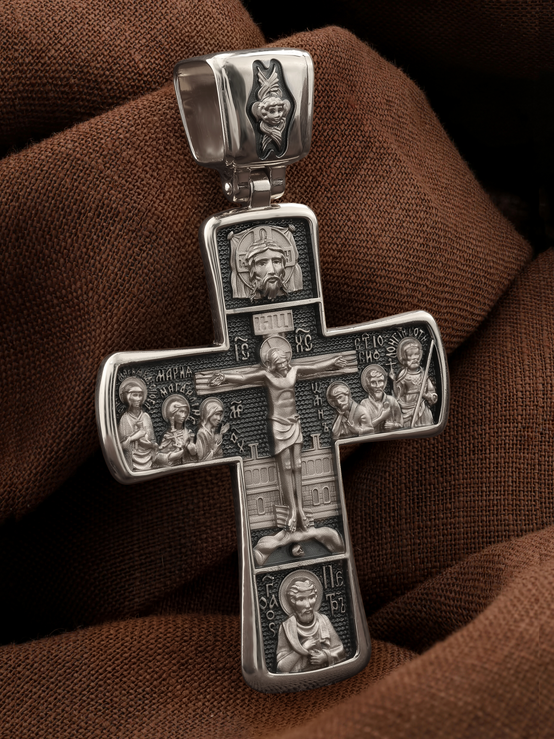 На лицевой стороне креста изображено Распятие Господа Иисуса Христа с предстоящими Ему святыми, которые, по преданию, находились у Креста Господа во время Его казни. Слева — Пресвятая Богородица и жены-мироносицы — равноапостольная Мария Магдалина и святая Мария Клеопова, справа — апостол Иоанн Богослов, прав. Иосиф Аримофейский и мч. Лонгин Сотник.