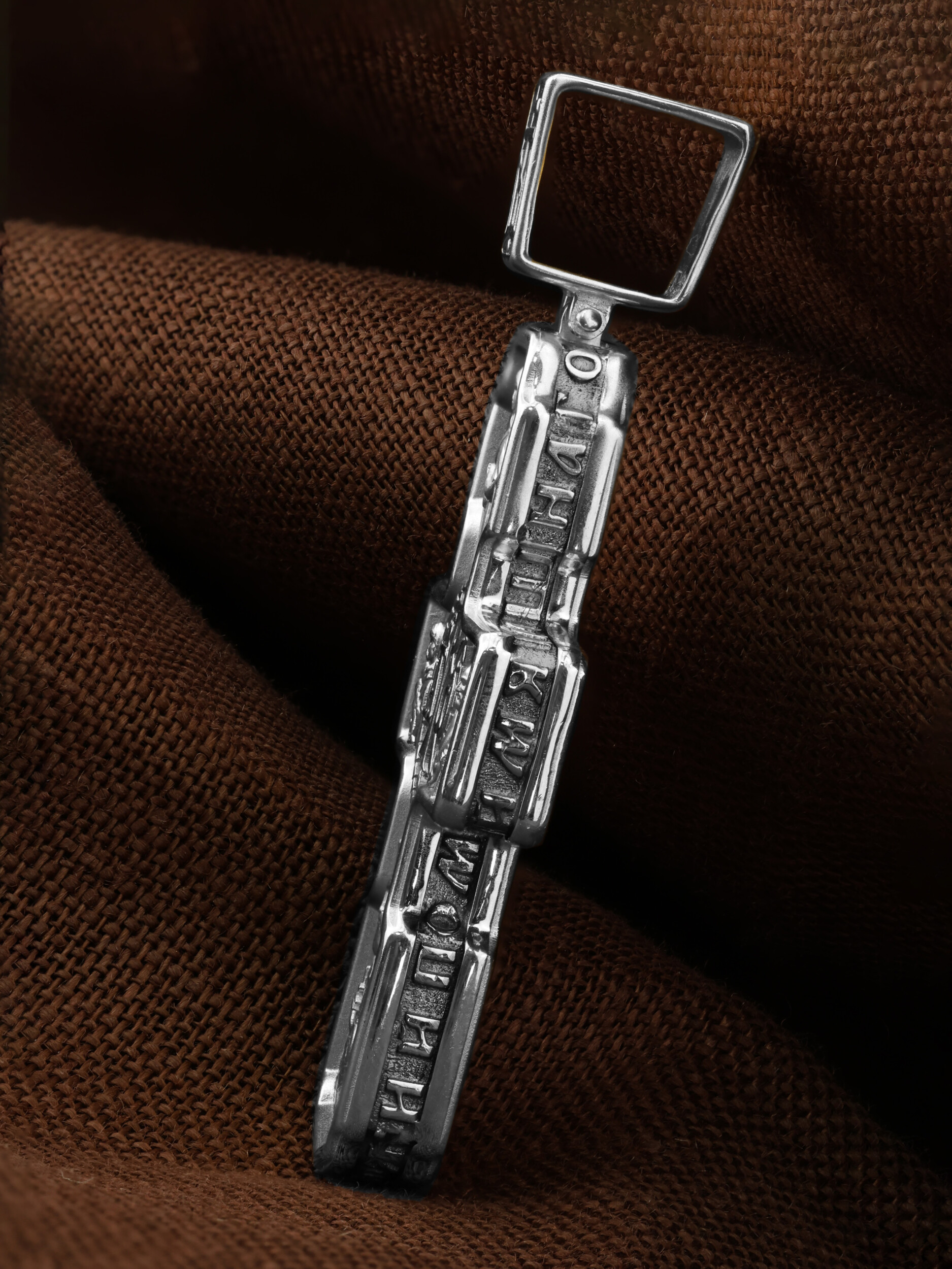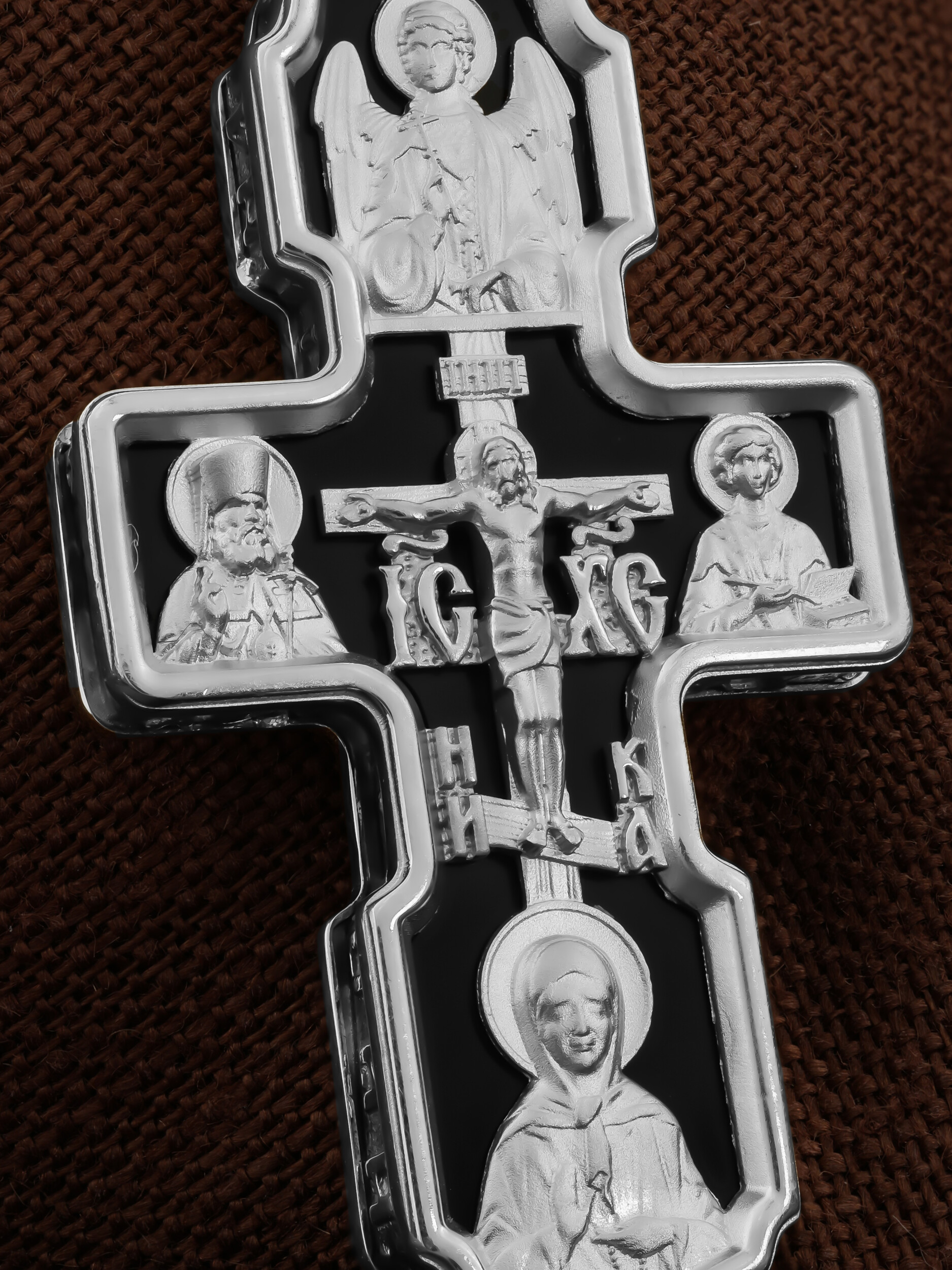 На лицевой стороне креста изображено Распятие Господа и Спасителя нашего Иисуса Христа. Христос, подвергнутый на кресте мучительной казни, своими страданиями искупил нас от древнего греха и даровал нам жизнь вечную. Без Распятия не было бы Воскресения Христова, и поэтому Крест из орудия казни обратился в святыню, в которой действует Благодать Божия. На верхней табличке, выше головы Иисуса, расположена надпись, составленная Понтием Пилатом на трех языках — «IНЦI». Она означает «Иисус Назорей, Царь Иудейский». Надпись «IС ХС» означает Иисус Христос и помещается на разных сторонах поперечной (большой) перекладины креста. На нижней перекладине находится надпись –«НИКА», что означает победитель. Над Распятием изображен Святой Ангел-Хранитель держащий крест в правой руке. Ниже Распятия — образ Святой блаженной старицы Матроны Московской. Справа — образ Свя¬того ве¬ли¬ко-му¬че¬ника и це¬ли¬теля Пан¬те¬ле¬и¬мона, а слева — образ Святителя Луки (Войно-Ясенецкого). На кулонном кольце находится надпись «ХВ», что означает Христос Воскрес. На торцевой стороне креста размещены слова Иисусовой молитвы: «Господи Иисусе Христе, Сыне Божий, помилуй мя, грешного».