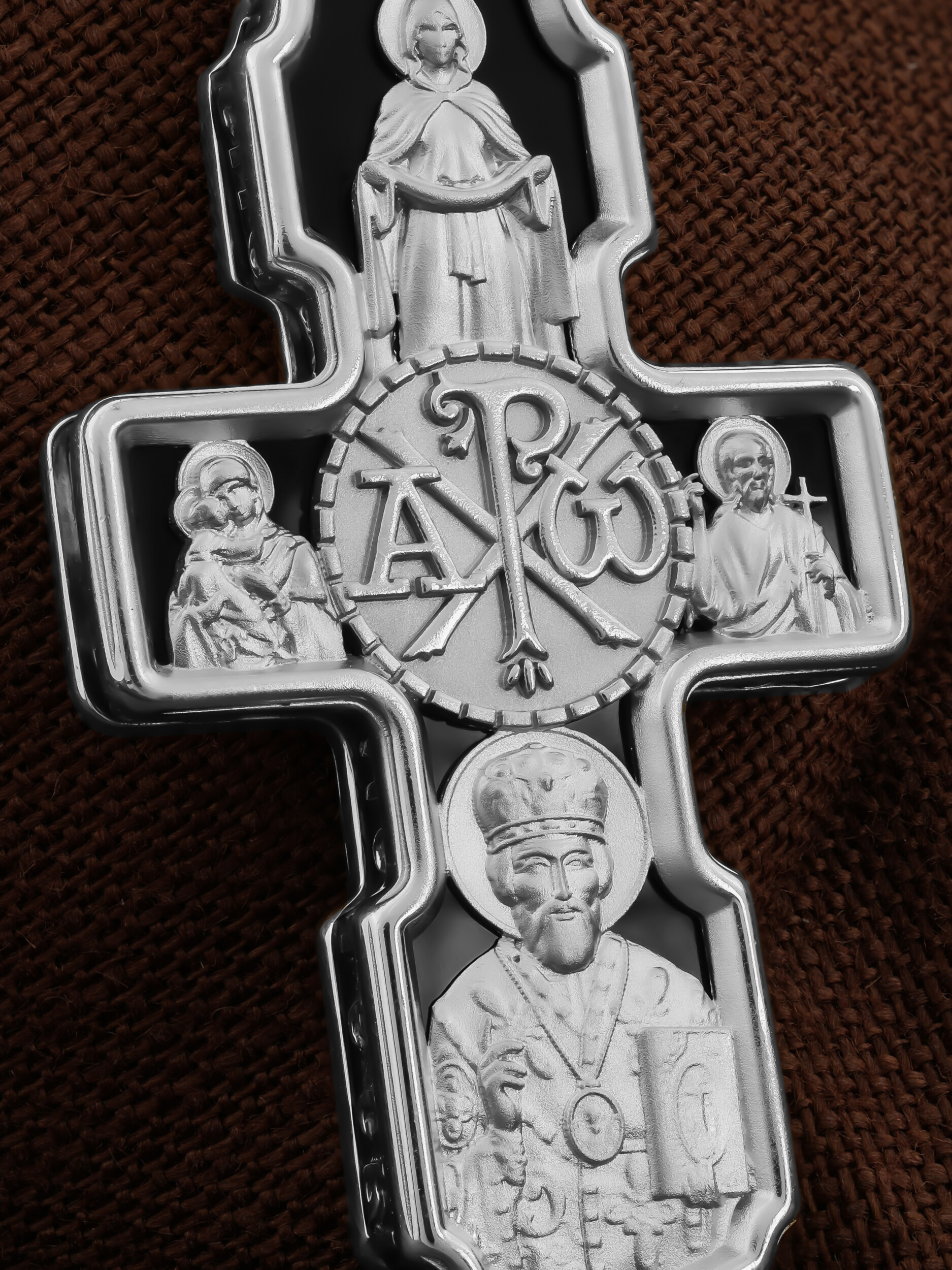 На центральной части оборотной стороны креста размещена Хризма — монограмма имени Христа, которая состоит из двух начальных греческих букв имени — X (хи) и P (ро), скрещённых между собой. По краям монограммы находятся греческие буквы? и ?, иллюстрирующими отрывок из Апокалипсиса: «Я есть Альфа и Омега, начало и конец…» и обозначающими Божественную безначальность и безконечность. Над Хризмой изображена икона Божией Матери «Покров Пресвятой Богородицы», ниже — образ Святителя Николая Чудотвореца, архиепископа Мир Ликийских. Слева — образ Владимирской иконы Божией Матери. Справа изображен Пророк Предтеча и Креститель Господень Иоанн. На торцевой стороне креста размещены слова Иисусовой молитвы: «Господи Иисусе Христе, Сыне Божий, помилуй мя, грешного».