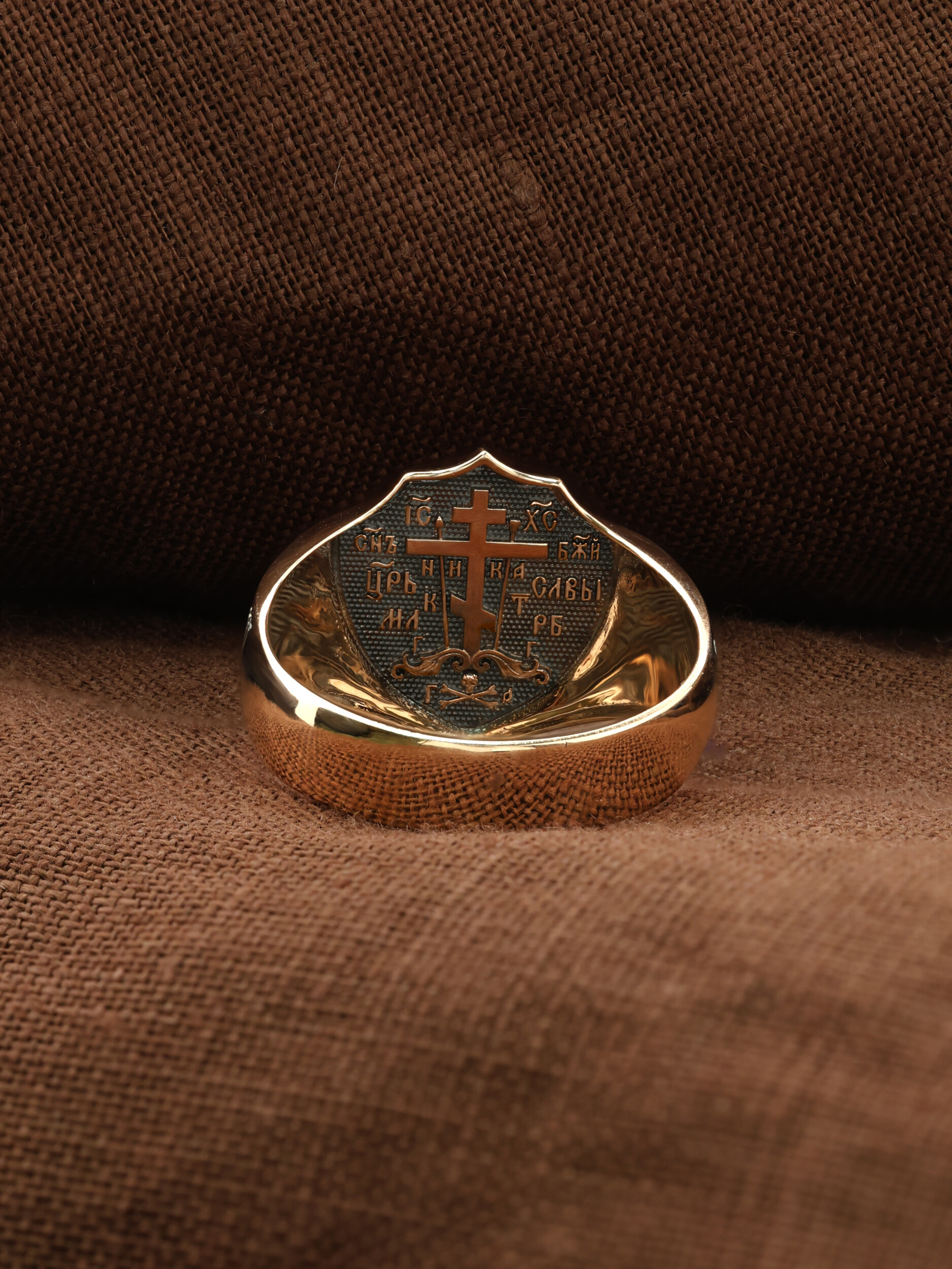 Кольцо «Святой Великомученик Георгий Победоносц» выполнено в древних христианских традициях. Основой композиции является изображение Святого Великомученика Георгия Победоносца — одного из самых почитаемых и удивительных святых. Георгий родился в Каппадокии (Малая Азия) в семье богатых и знатных горожан. Юношей поступил на службу к римскому императору Диоклетиану, за отличное знание военного дела и проявленную в боях и походах храбрость был приближен к императору и удостоен высокого воинского звания. Во время начавшихся гонений на христиан, перешел на сторону гонимых и, отвергнув человеческий страх, стал ярым проповедником учения Христа. Мучители подвергли опального воеводу жесточайшим восьмидневным пыткам и казнили его (обезглавили) в возрасте около тридцати лет в 303 году. На Руси он известен как Юрий или Егорий, заступник для верующих, чья жизнь имеет какое-либо отношение к военным делам, помощник в крестьянском труде. Георгий изображен как воитель, сидящий на вздыбленном коне и поражающий копьем огнедышащего змея. Справа над образом изображена благословляющая Божия десница. Змей символизирует собою сатанинские силы. Молитвами вознесенными к Всевышнему и своей непреклонной верой он смог одолеть чудовище. Святой убил змея, спас царскую дочь, принесенную в жертву, и жителей города, их души от влияния дьявола, породив в них надежду и веру в Господа, призывая людей принять христианскую веру.