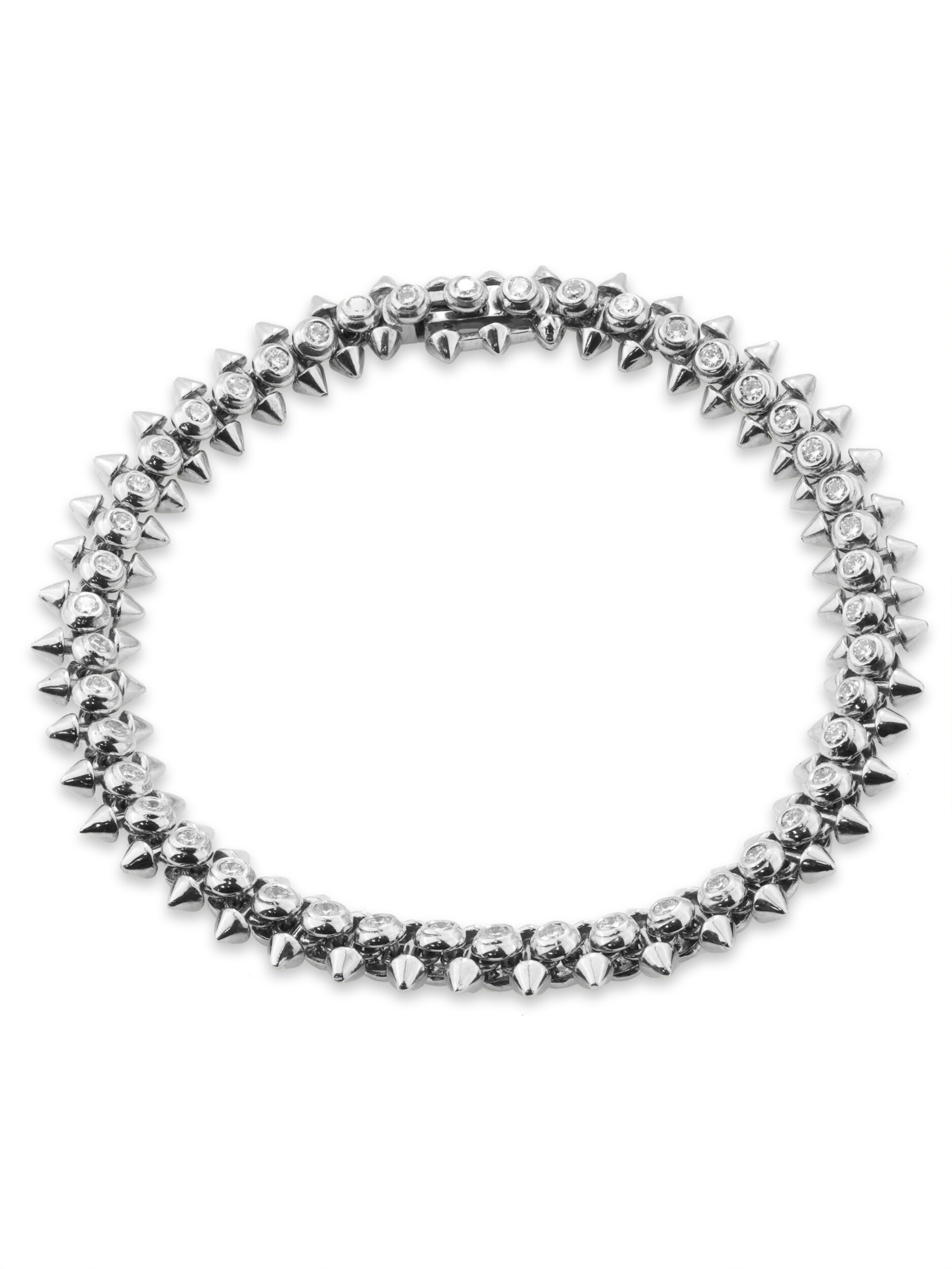 Мы предлагаем данную модель в широкой размерной сетке, включающей варианты 16, 16.5, 17, 17.5, 18, 18.5 и 19. Выберите идеальный размер, чтобы браслет комфортно сидел на руке и радовал своим сиянием каждый день. Это украшение создано для тех, кто ценит сочетание классических материалов, таких как белое золото, и провокационных дизайнерских решений, воплощенных в форме шипов и множестве сияющих бриллиантов.
