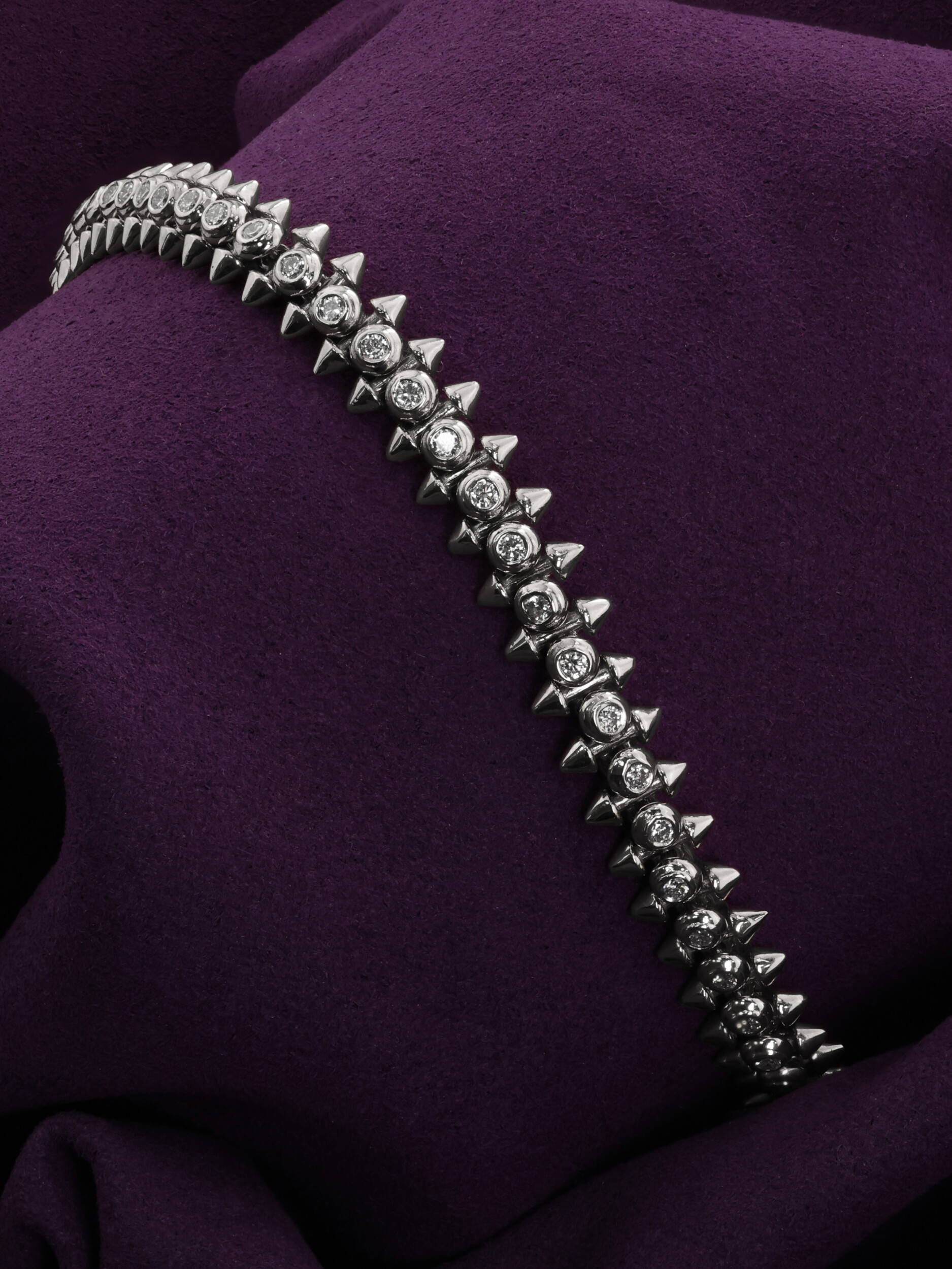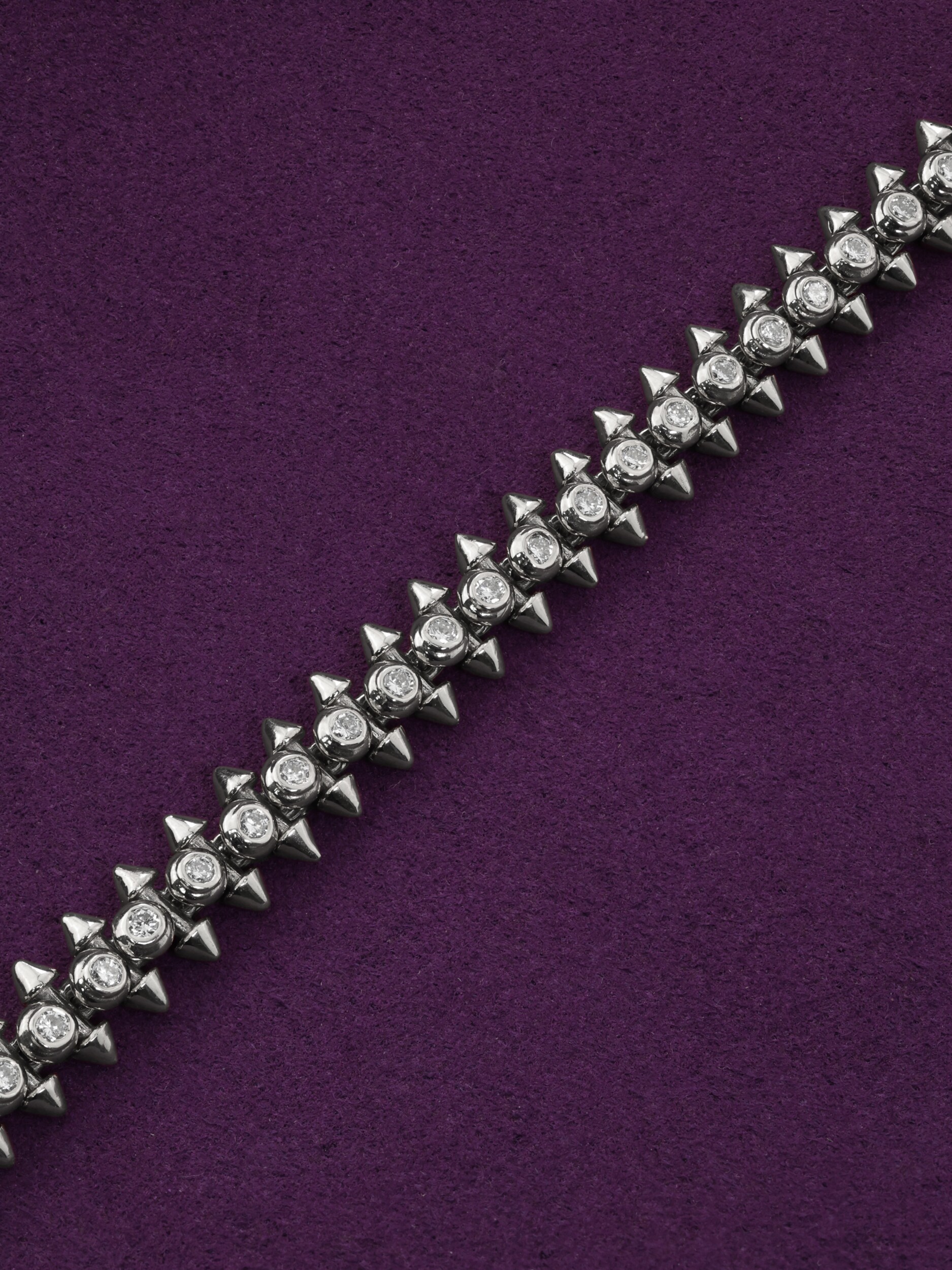 Этот роскошный браслет из белого золота 585 пробы станет центральным элементом вашего образа, подчеркивая безупречный вкус и смелость стиля. Ювелирное изделие из коллекции De Luxe — Дерзость выполнено в дерзком дизайне с элементами в форме шипов, что придает украшению современный и выразительный характер. Благородный холодный блеск белого металла эффектно дополнен россыпью драгоценных камней: в модели использовано 326 бриллиантов круглой формы с чистым белым цветом вставок.