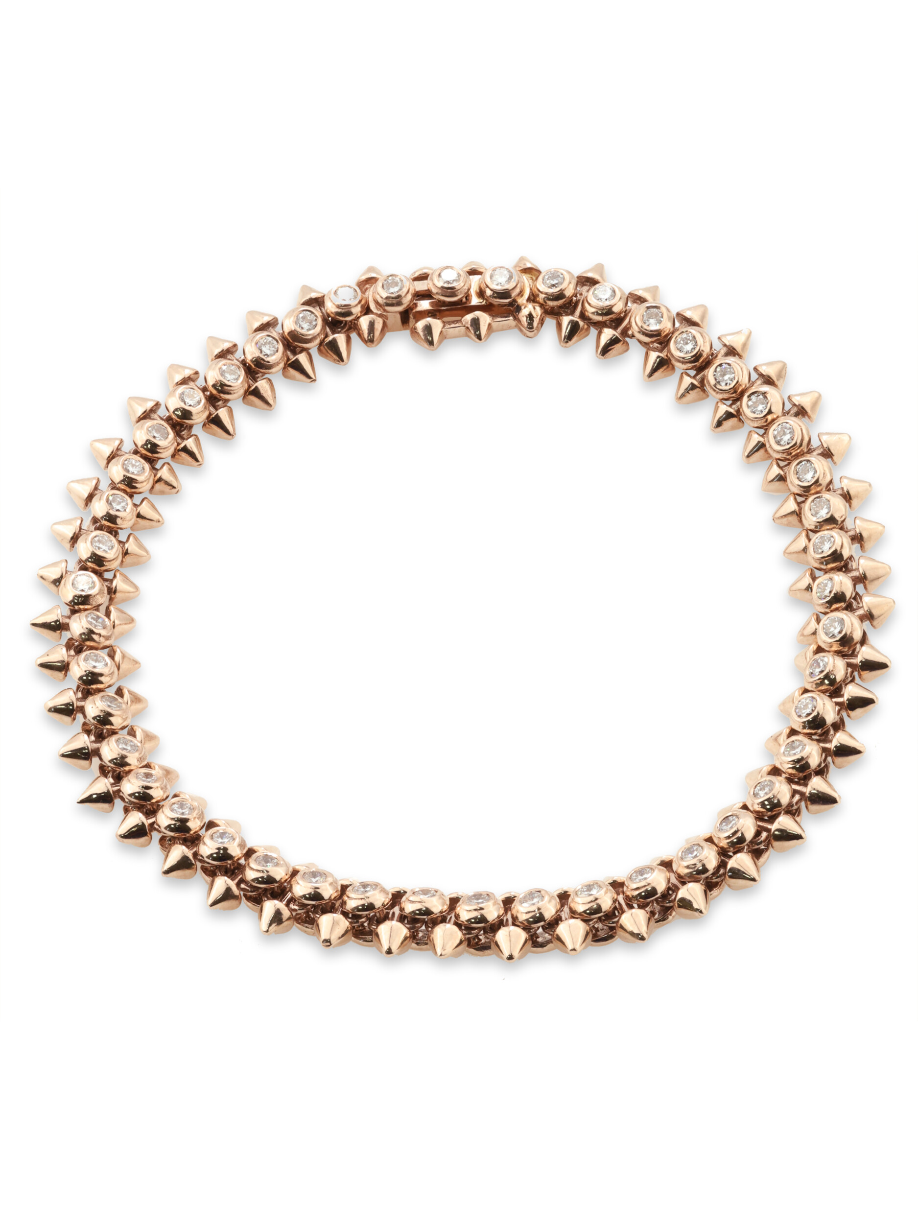 Роскошный браслет из красного золота 585 пробы из коллекции De Luxe — Дерзость — это украшение для тех, кто не боится заявлять о себе. Дизайн изделия сочетает в себе дерзость и утонченную элегантность, где центральным декоративным элементом выступают акцентные шипы, придающие образу характер и выразительность. Этот аксессуар станет идеальным дополнением вашего стиля, подчеркивая индивидуальность и уверенность в себе.