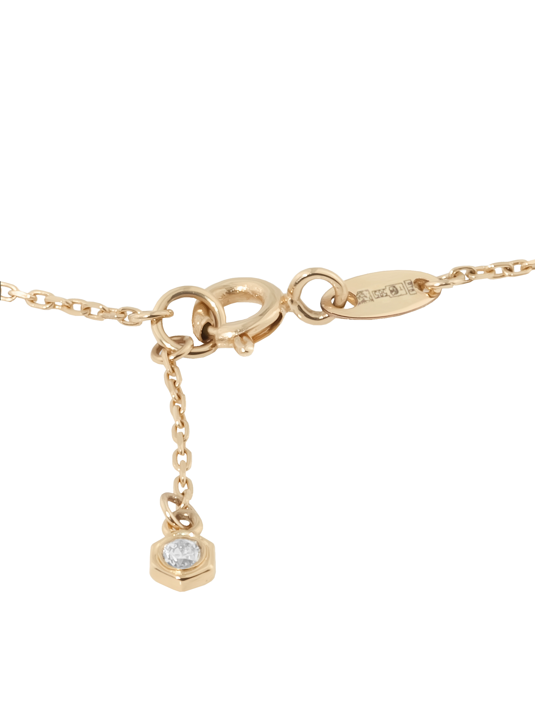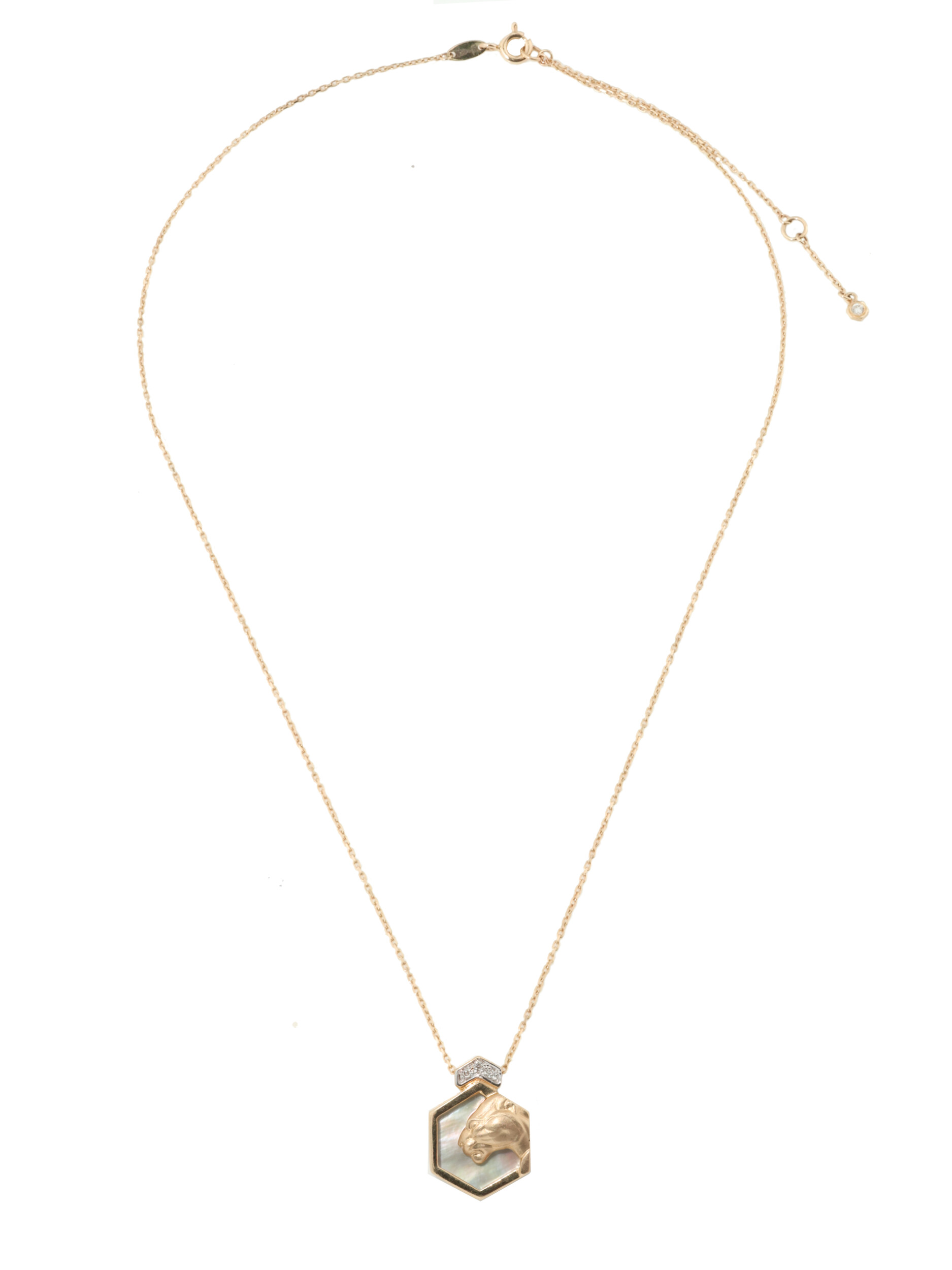 Колье из красного золота 585 пробы из коллекции De Luxe — Гексагон воплощает в себе дерзость и утонченную элегантность. Центральным элементом украшения стал выразительный дизайн в виде головы пантеры, который придает образу нотки хищной грации и уверенности. Ювелиры выбрали для композиции необычную форму вставок — основу в виде шестигранника дополняет изысканный перламутр, создающий мягкое сияние. В верхней части декоративного элемента расположены бриллианты круглой формы белого цвета, которые добавляют благородного блеска и роскоши.