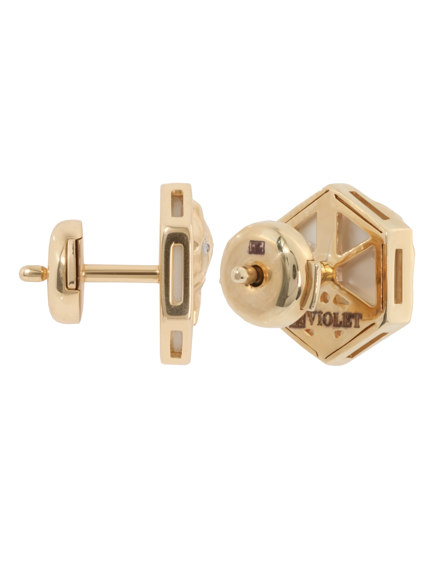 Серьги дополнены контрастной вставкой из нежного перламутра, имеющей оригинальную форму шестигранника. Этот природный материал придает украшению мягкое, переливающееся сияние. В качестве финального штриха выступает яркий акцент — по одному бриллианту круглой формы на каждой серьге, чья чистота и блеск создают эффектную игру света. Всего в украшении использовано 2 драгоценные вставки. Общее количество вставок подчеркивает лаконичность и выверенность дизайна.