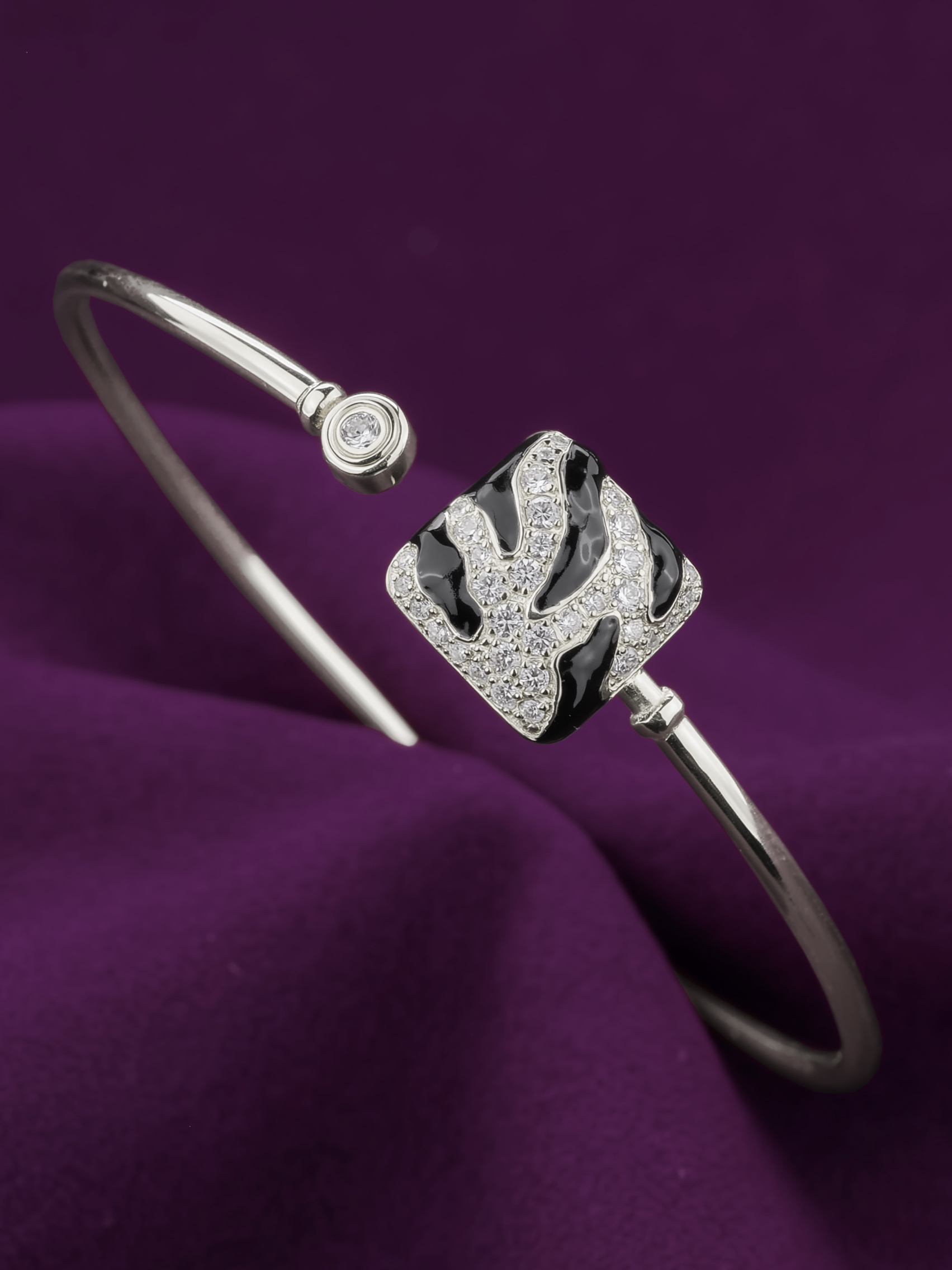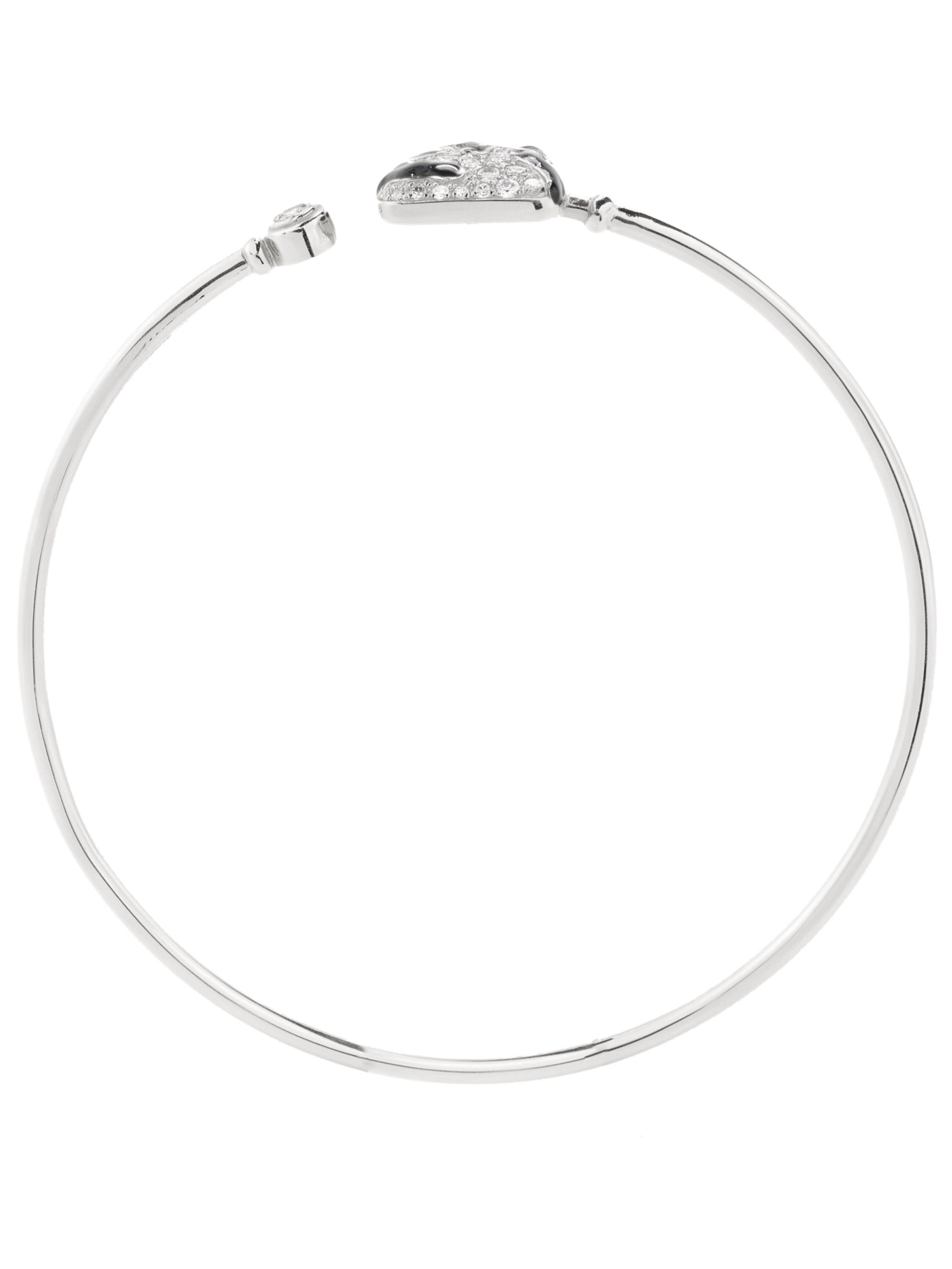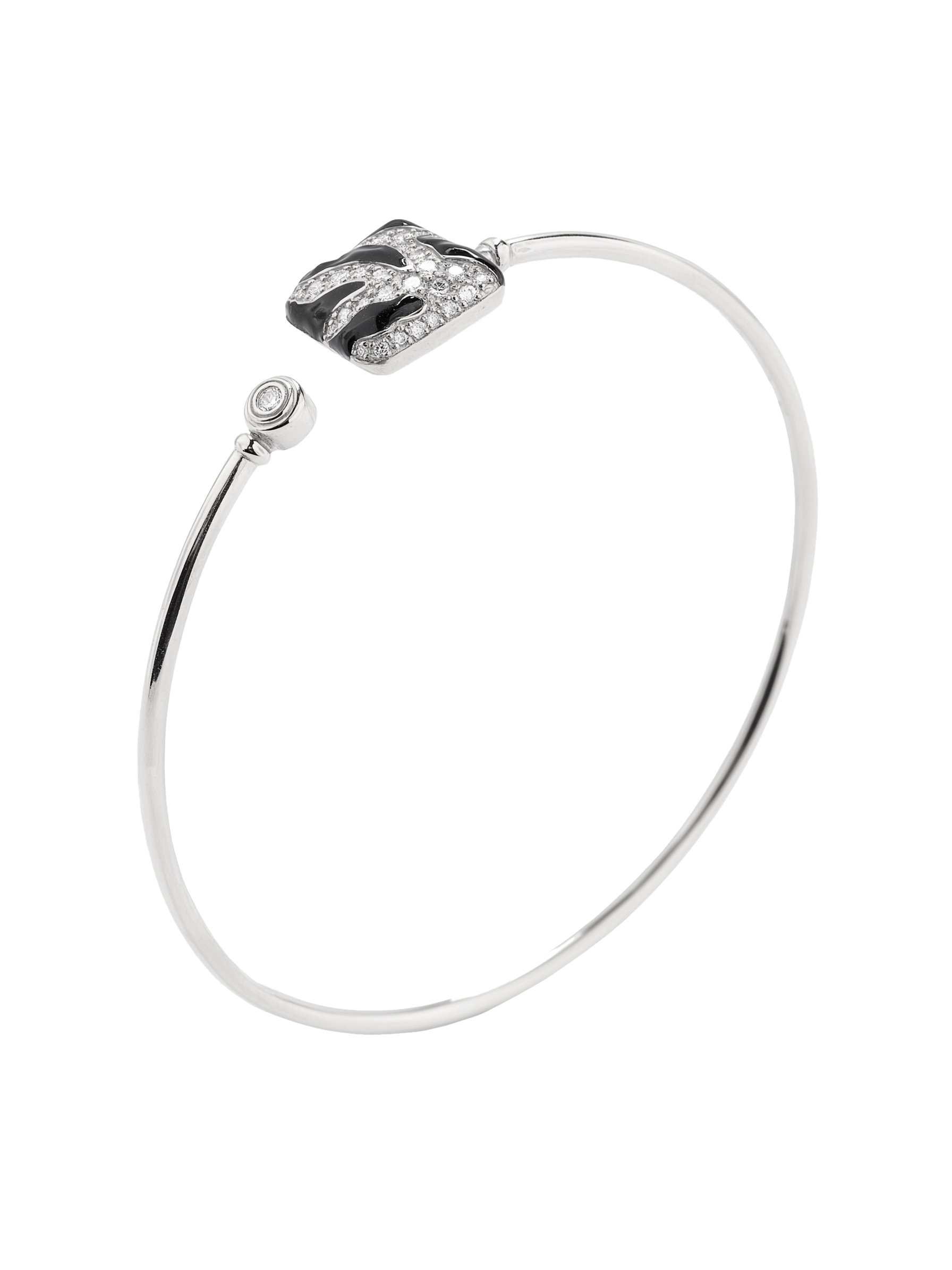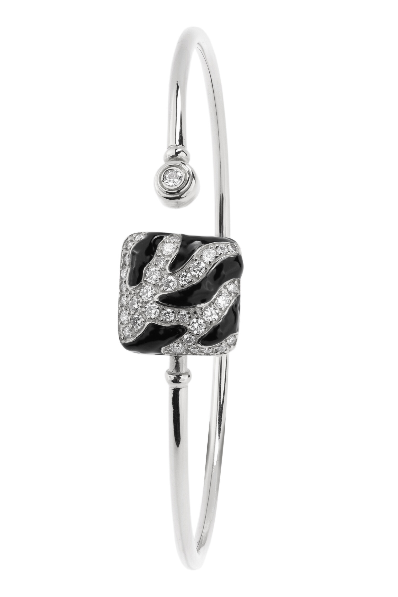 Ювелиры украсили композицию 35 бриллиантами круглой огранки, чье сияние подчеркнуто глянцевой эмалью. Холодный блеск металла гармонично сочетается с драгоценными камнями, придавая браслету современный и статусность вид. Белый цвет материала подчеркивает чистоту линий и изысканность работы.