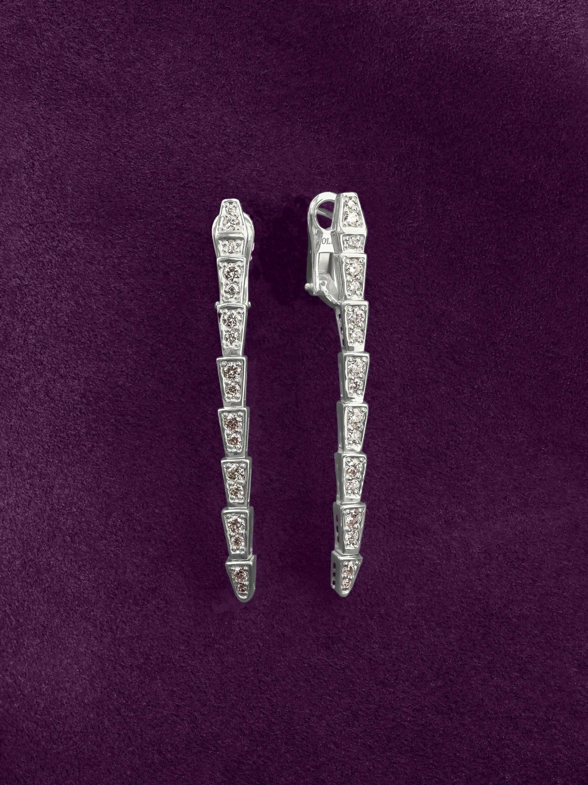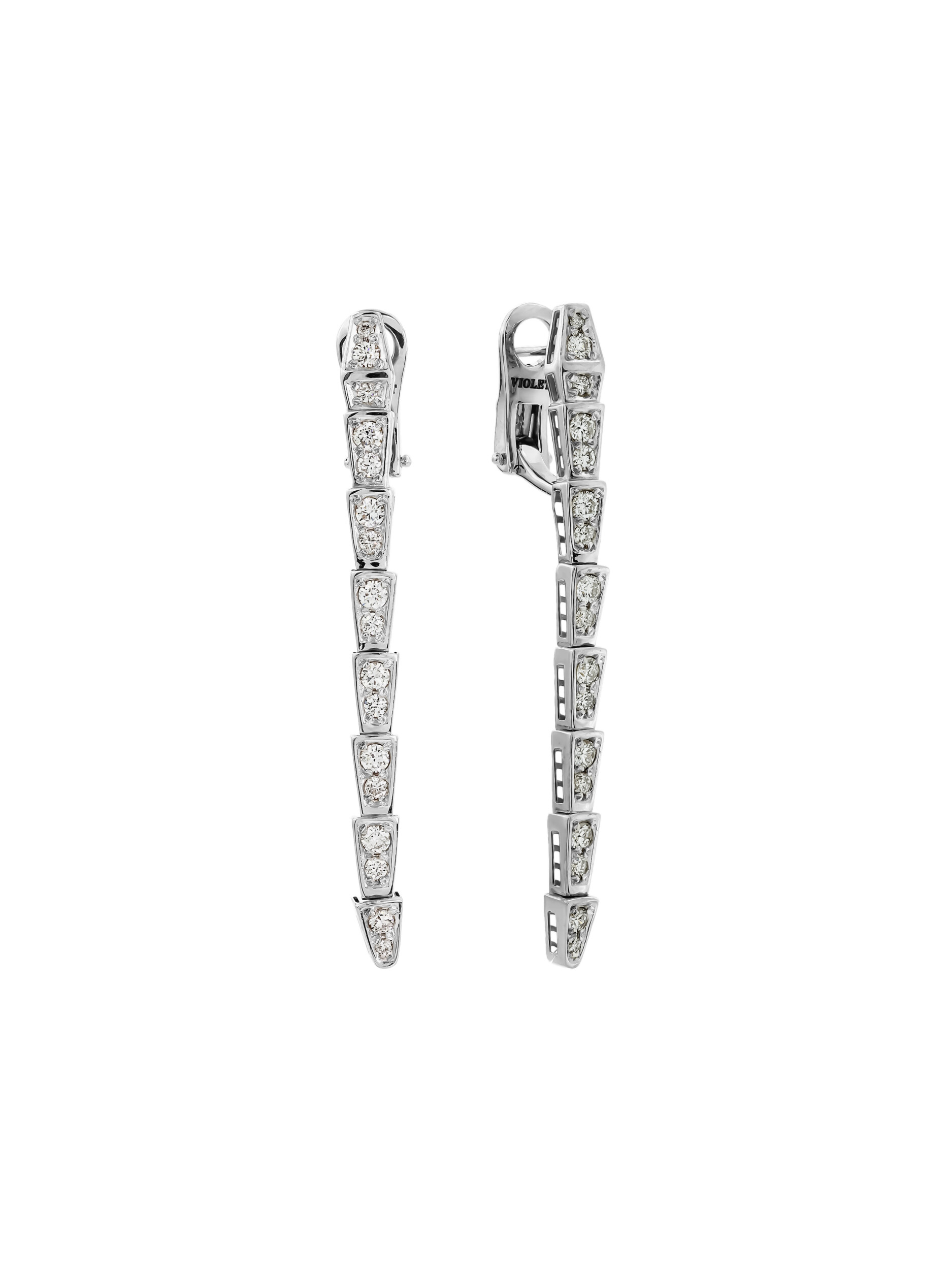 Серьги из белого золота 585 пробы из коллекции De Luxe — Серпенти представляют собой воплощение дерзкой эстетики и ювелирного мастерства. В дизайне изделия угадываются грациозные линии скорпионов, чье тело сегментировано и плавно изгибается, подчеркивая динамику форм. Лаконичный и холодный блеск белого металла идеально сочетается с драгоценными вставками.