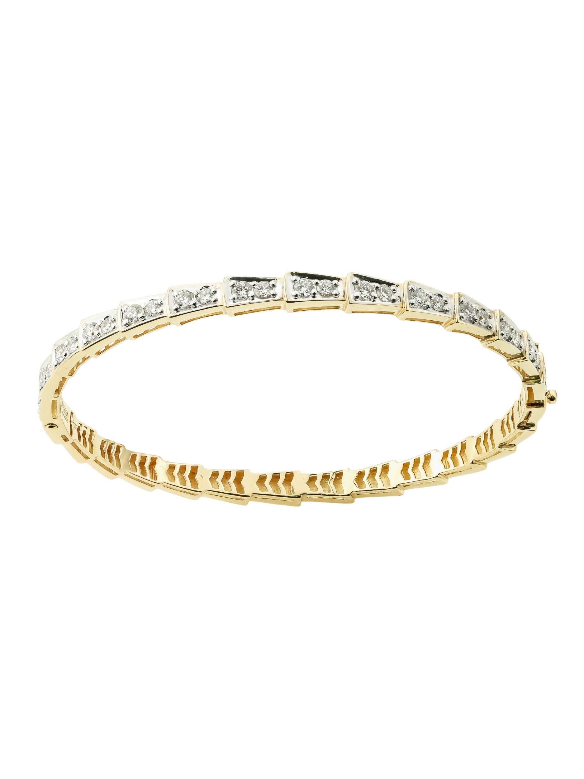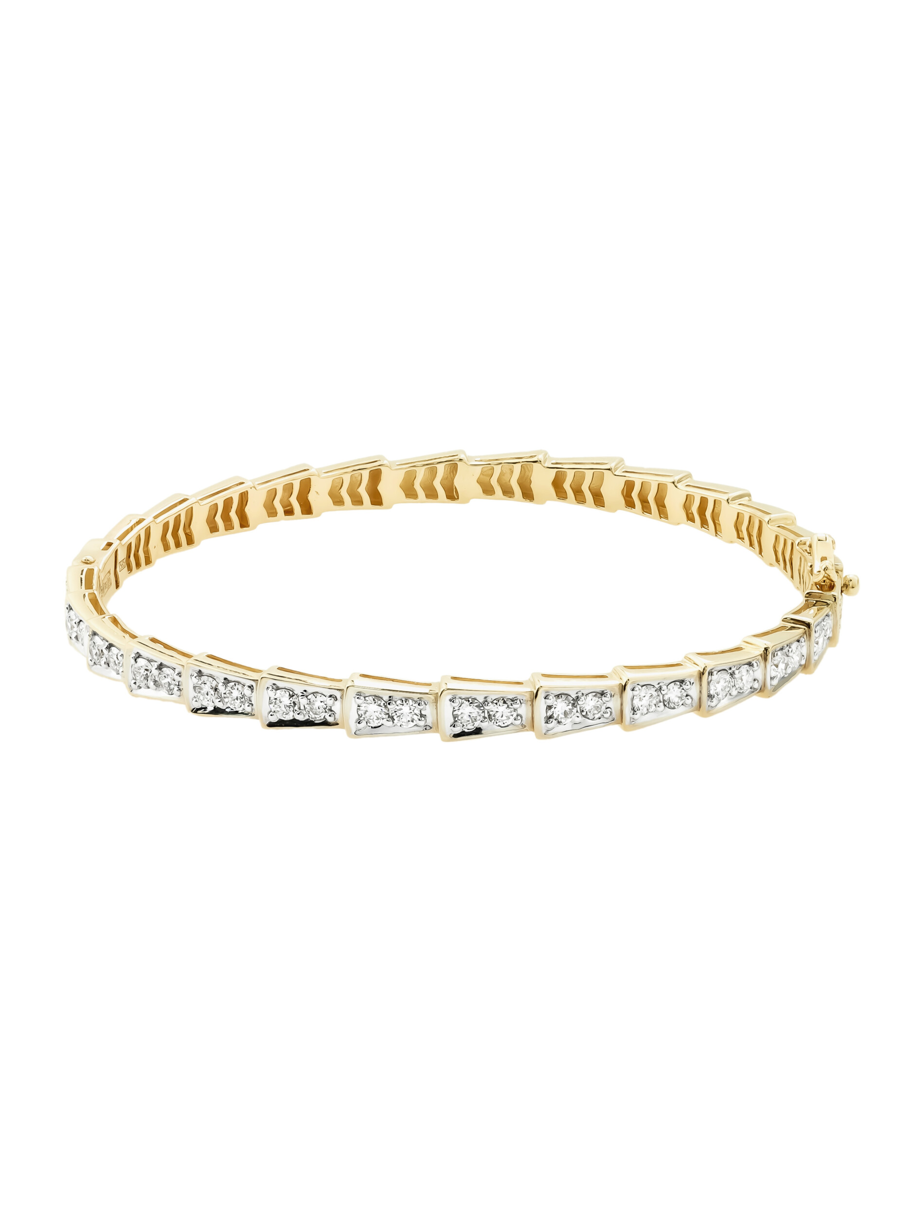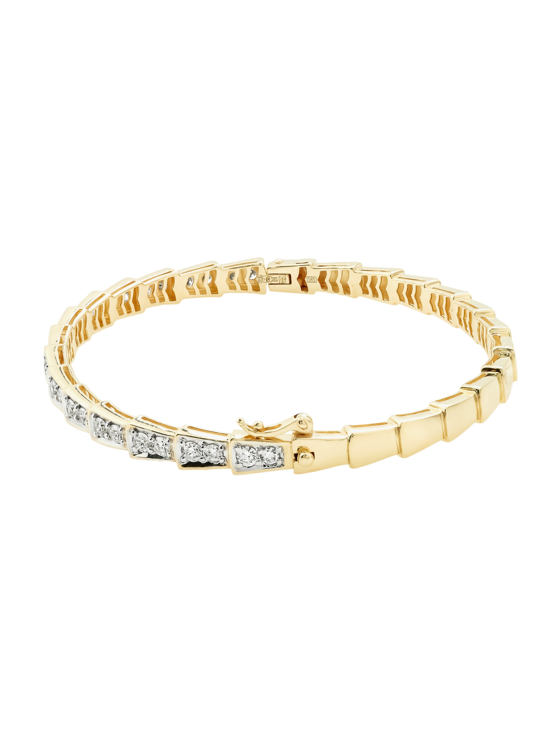В центре внимания — великолепная инкрустация. Браслет украшен 28 бриллиантами круглой огранки. Белый цвет вставок эффектно контрастирует с теплым оттенком красного золота, создавая завораживающую игру света при каждом движении. Общее исполнение изделия отличается лаконичностью и чистотой линий, что позволяет гармонично сочетать его с другими украшениями. При желании вы можете дополнить этот браслет другими изделиями из комплекта, создавая завершенный и стильный ансамбль.