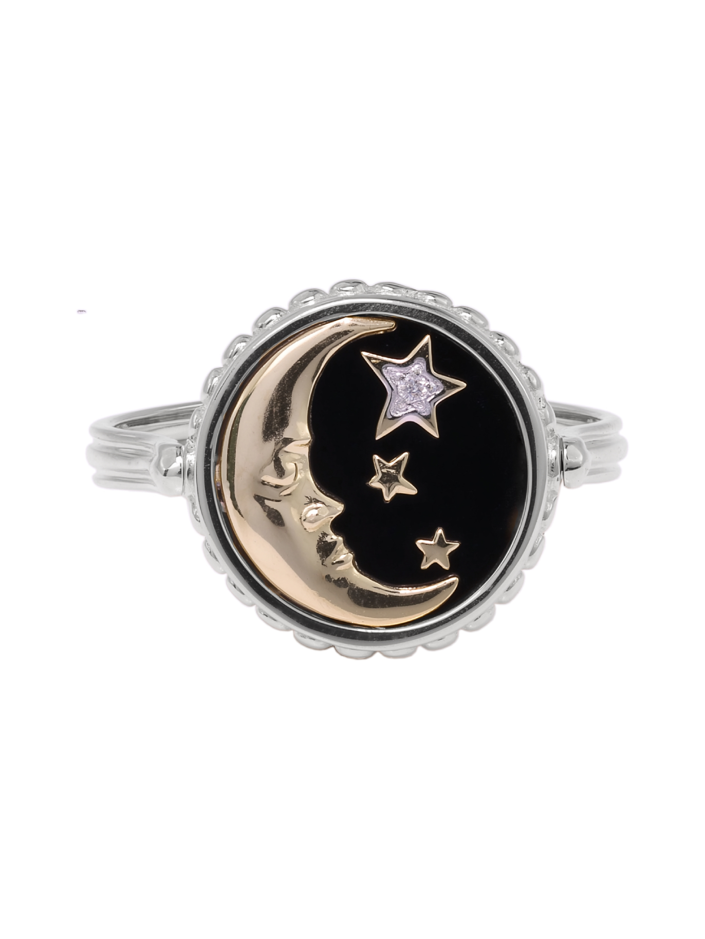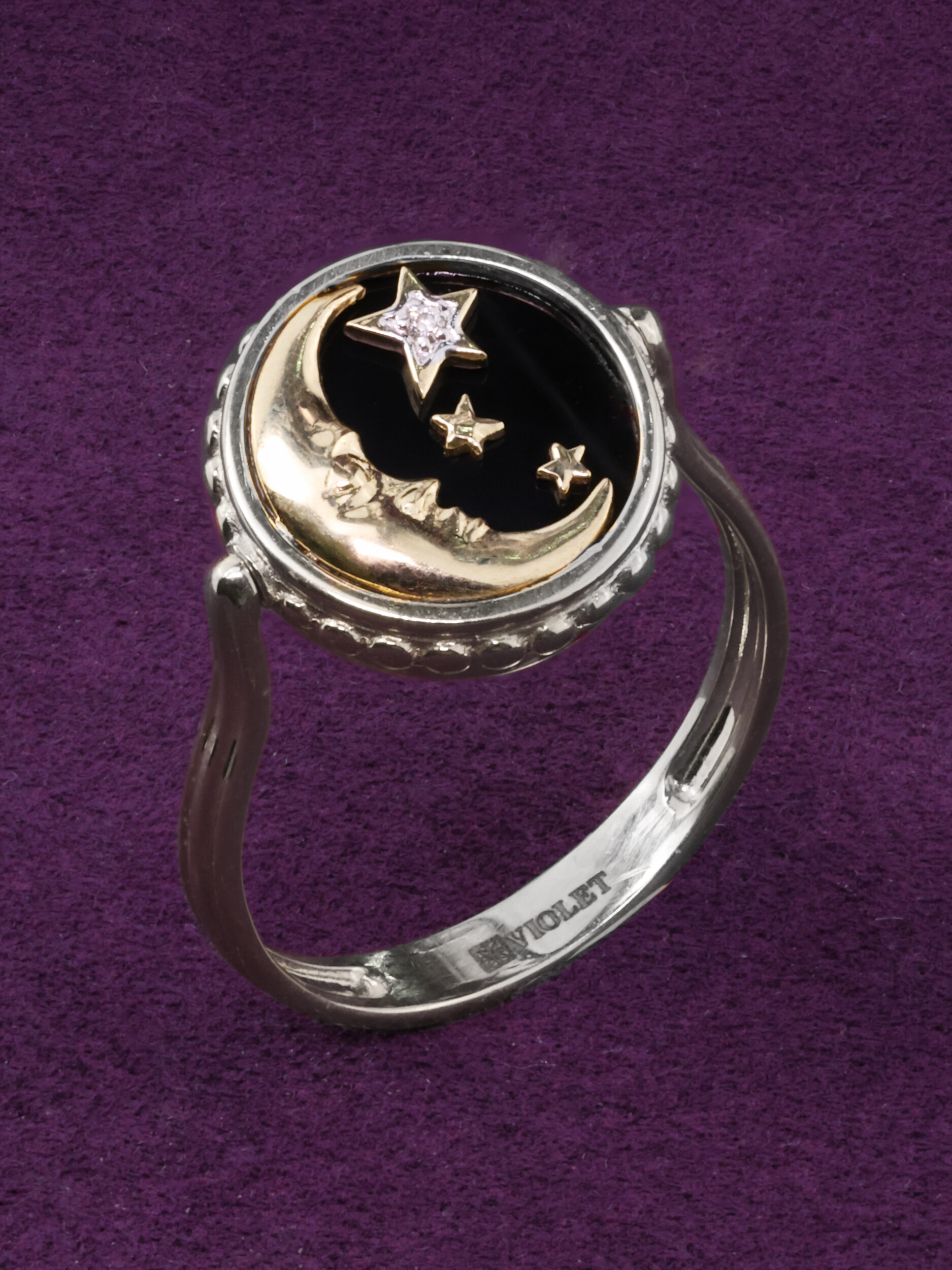 Основу композиции составляет контрастное сочетание материалов. Глубокий чёрный оникс служит эффектным фоном для декоративных элементов, создавая ощущение бесконечного космоса. На нём изящно располагаются фигурки небесных тел: изысканный полумесяц и сверкающие звёзды. Инкрустация бриллиантами круглой огранки добавляет благородного сияния, создавая яркий акцент на фоне тёмного камня. В изделии гармонично переплетаются вставки: белый перламутр, чёрный оникс и искристые бриллианты, что подчеркивает высокий статус украшения.
