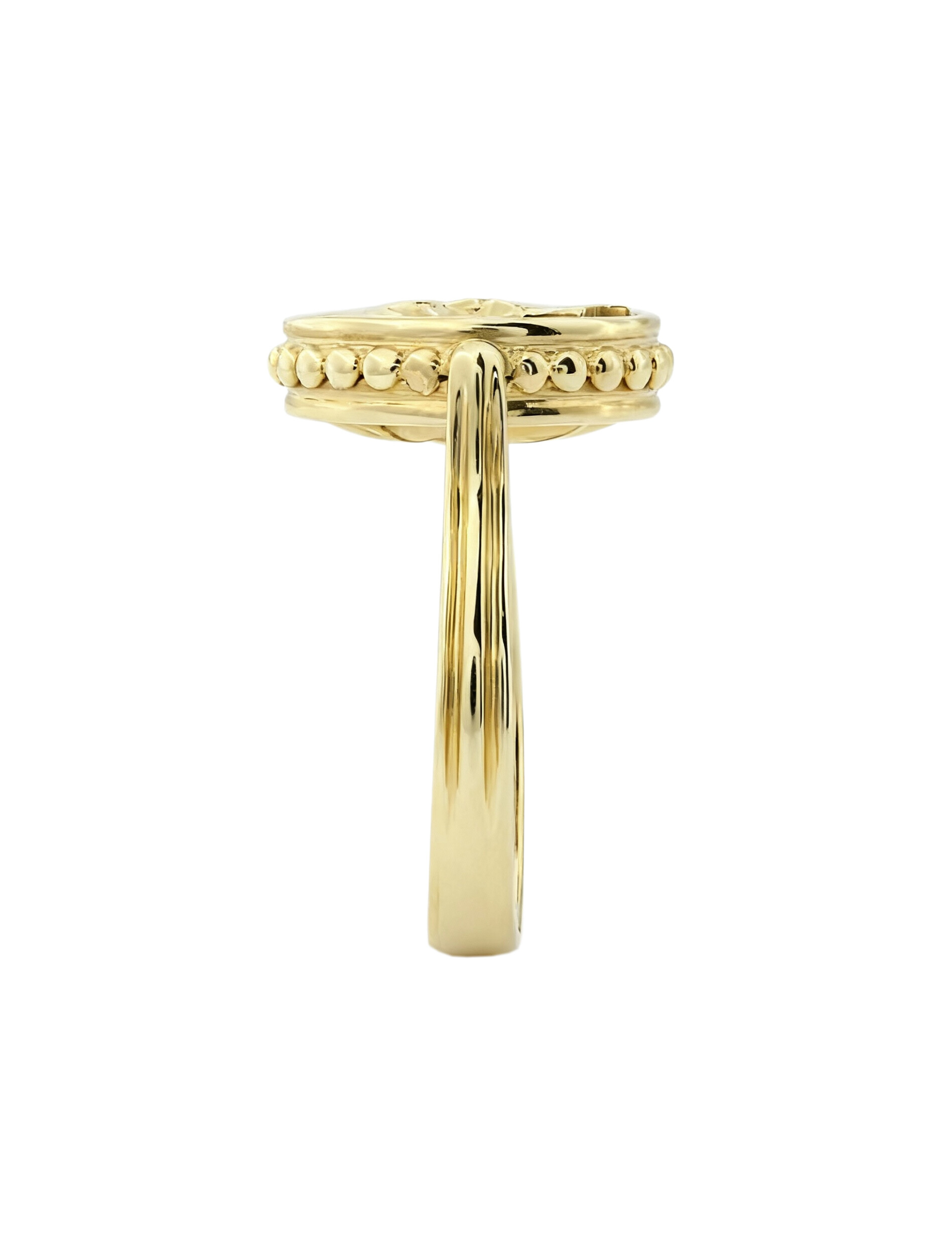 Это роскошное изделие привлекает внимание своей символичностью и мастерством исполнения. Три вставки круглой формы гармонично дополняют композицию, создавая завершенный образ. Лимонный оттенок золота придает кольцу благородное сияние, делая его идеальным акцентом как для женских, так и для мужских образов. Ювелирное украшение станет великолепным подарком или самостоятельным дополнением вашей коллекции.