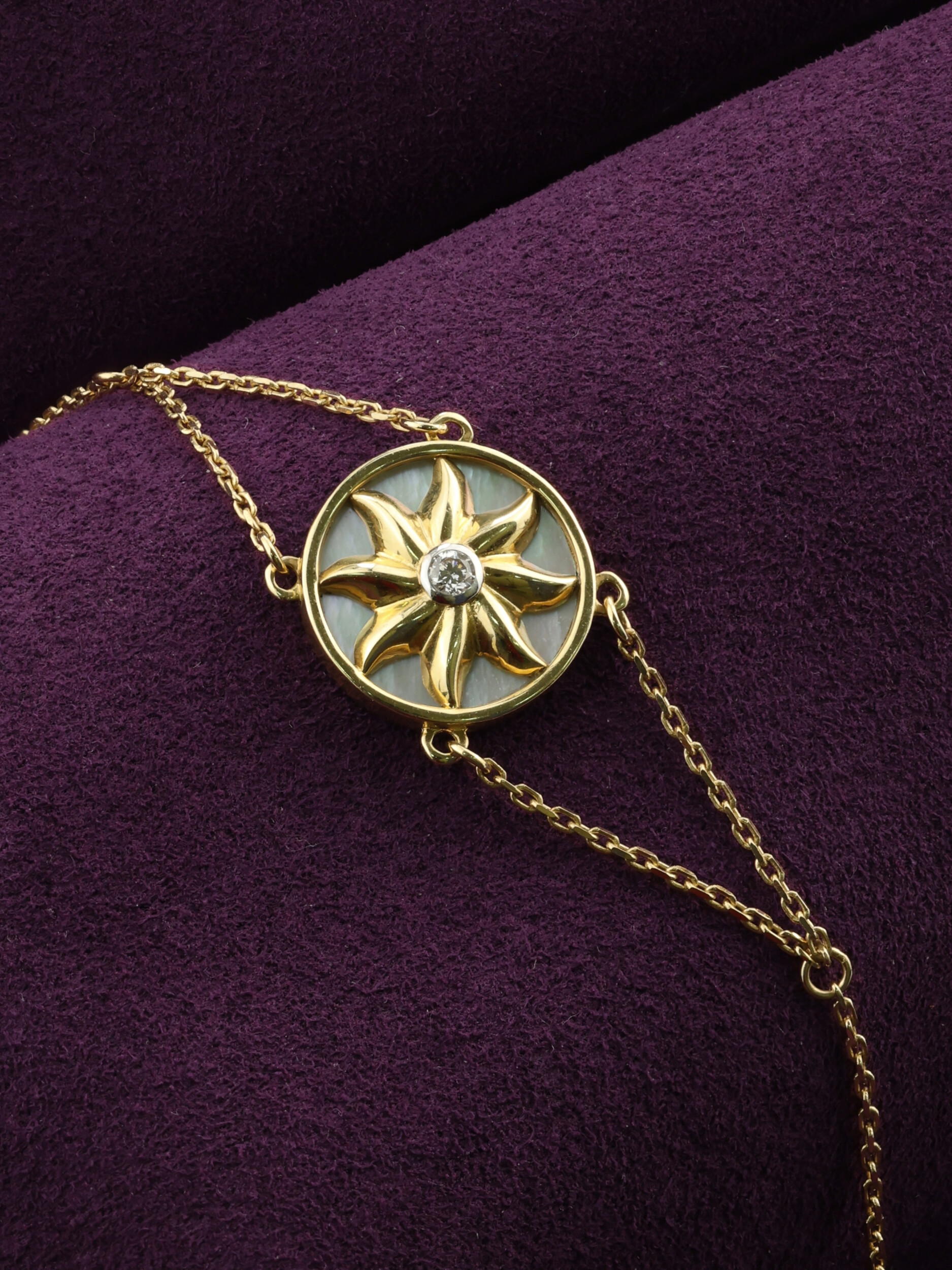 В центре композиции расположен круглый бриллиант, который притягивает взгляд своим холодным белым блеском. Его сияние подчеркивает мягкая перламутровая вставка, создающая переливчатый фон и добавляющая изделию глубины. Гармоничное сочетание лимонного золота, сверкающего белого бриллианта и нежного перламутра делает этот браслет универсальным аксессуаром.