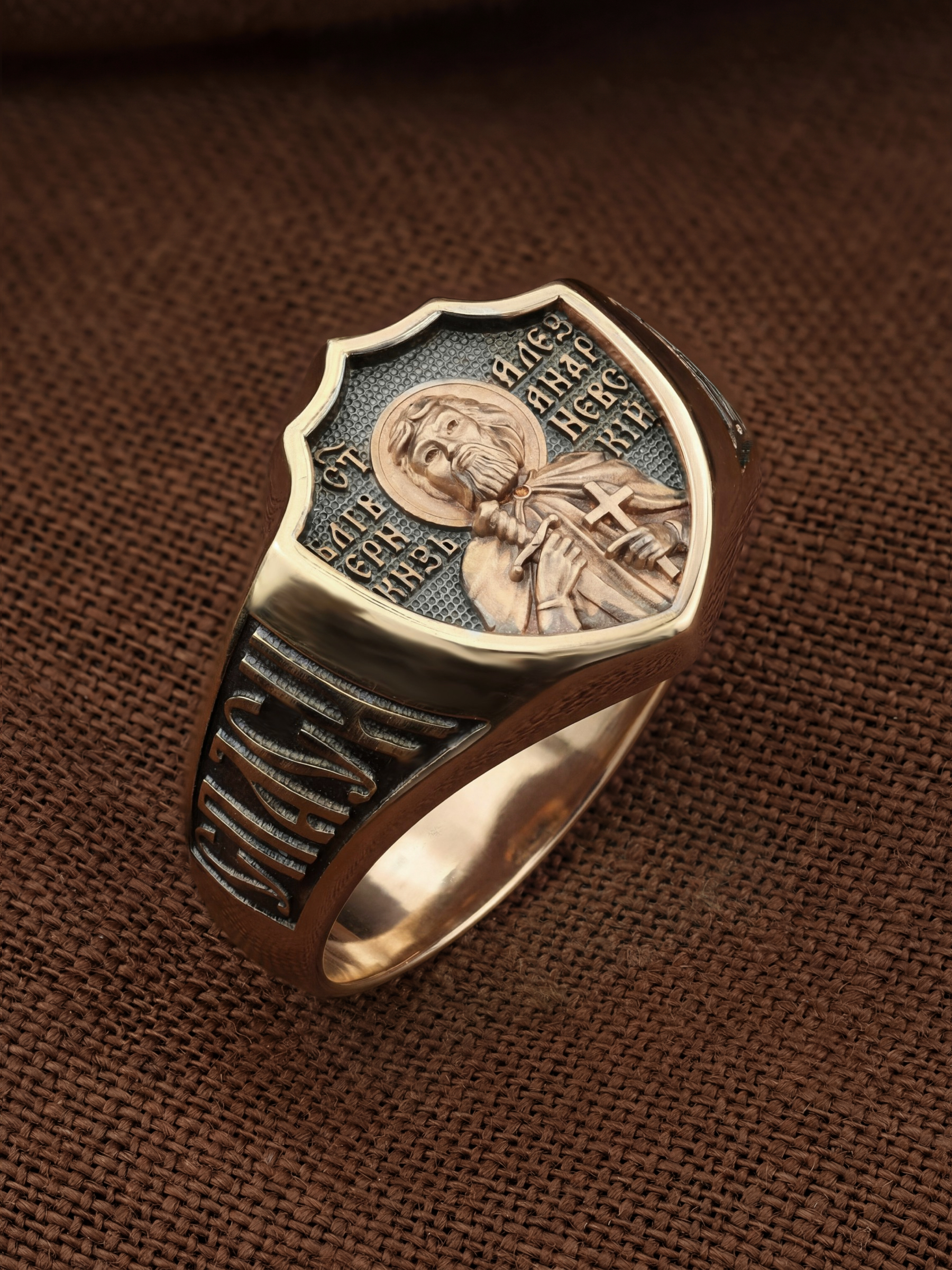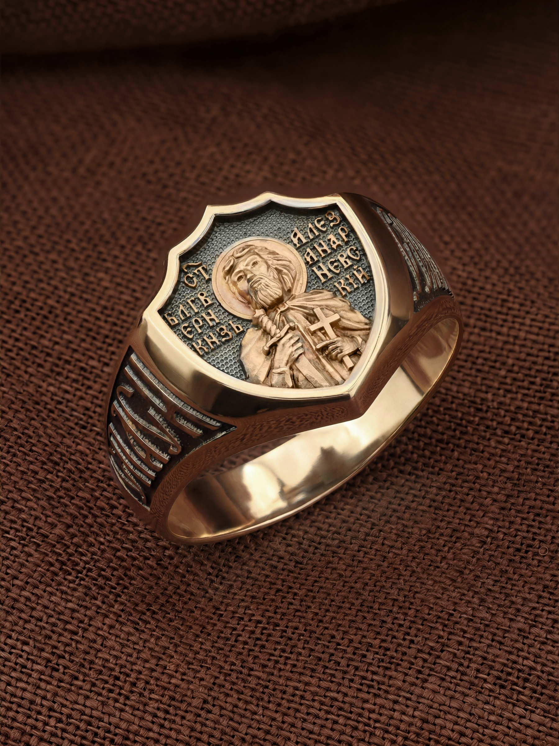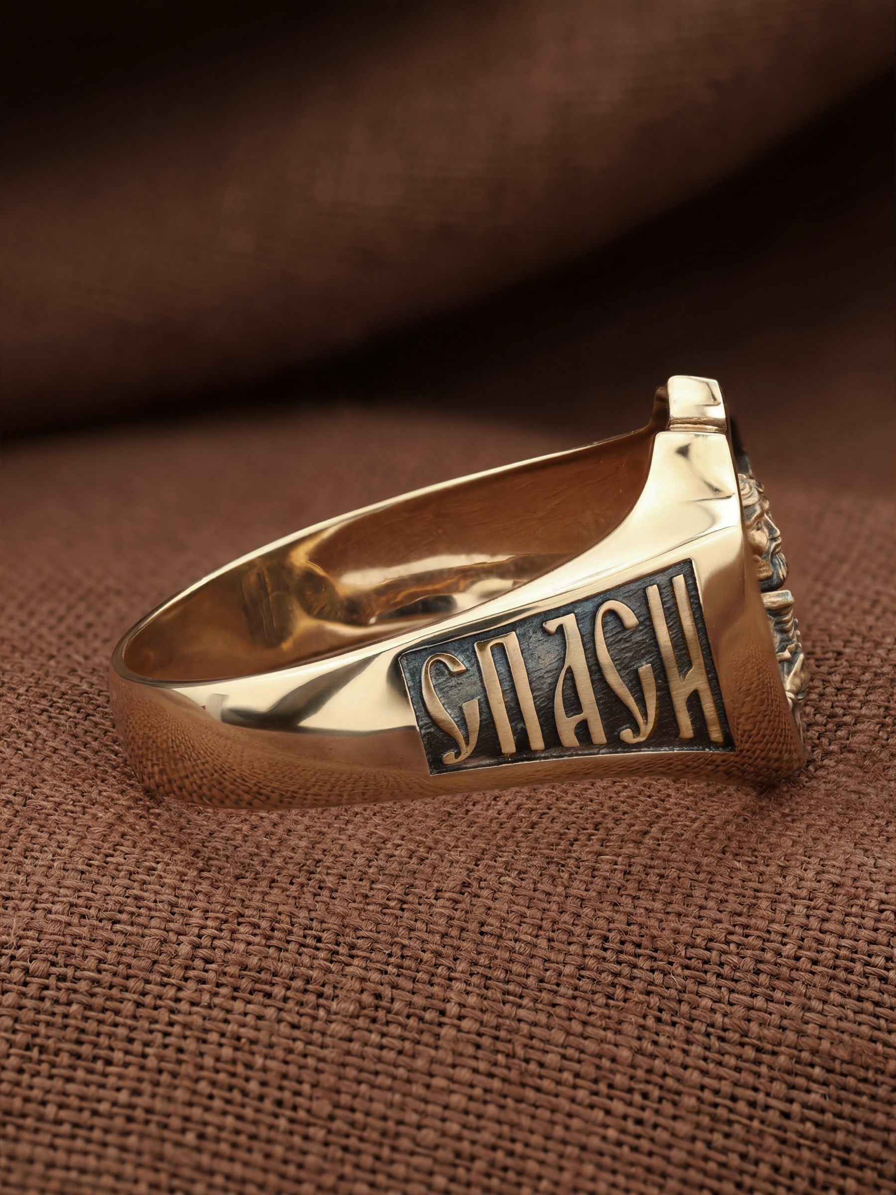 С внутренней стороны кольца изображен «Голгофский крест». Центральным и главным элементом композиции лицевой стороны является восьмиконечный крест — образ Честного и Животворящего Креста Господня, установленного на горе Голгофе. В основании креста изображена гора Голгофа, на которой был распят Спаситель и череп Адама, чьи кости по приданию омыла кровь Иисуса Христа. Перед головой располагаются лежащие кости рук, изображаются правая на левой, как при погребении или причащении. В XVI веке на Руси около изображения Голгофы появились обозначения «М.Л.Р.Б.» — Место Лобное Рай Бысть (Голгофа в переводе с еврейского — Лобное место). Чуть ниже справа и слева буквы «Г.Г.» — гора Голгофа.