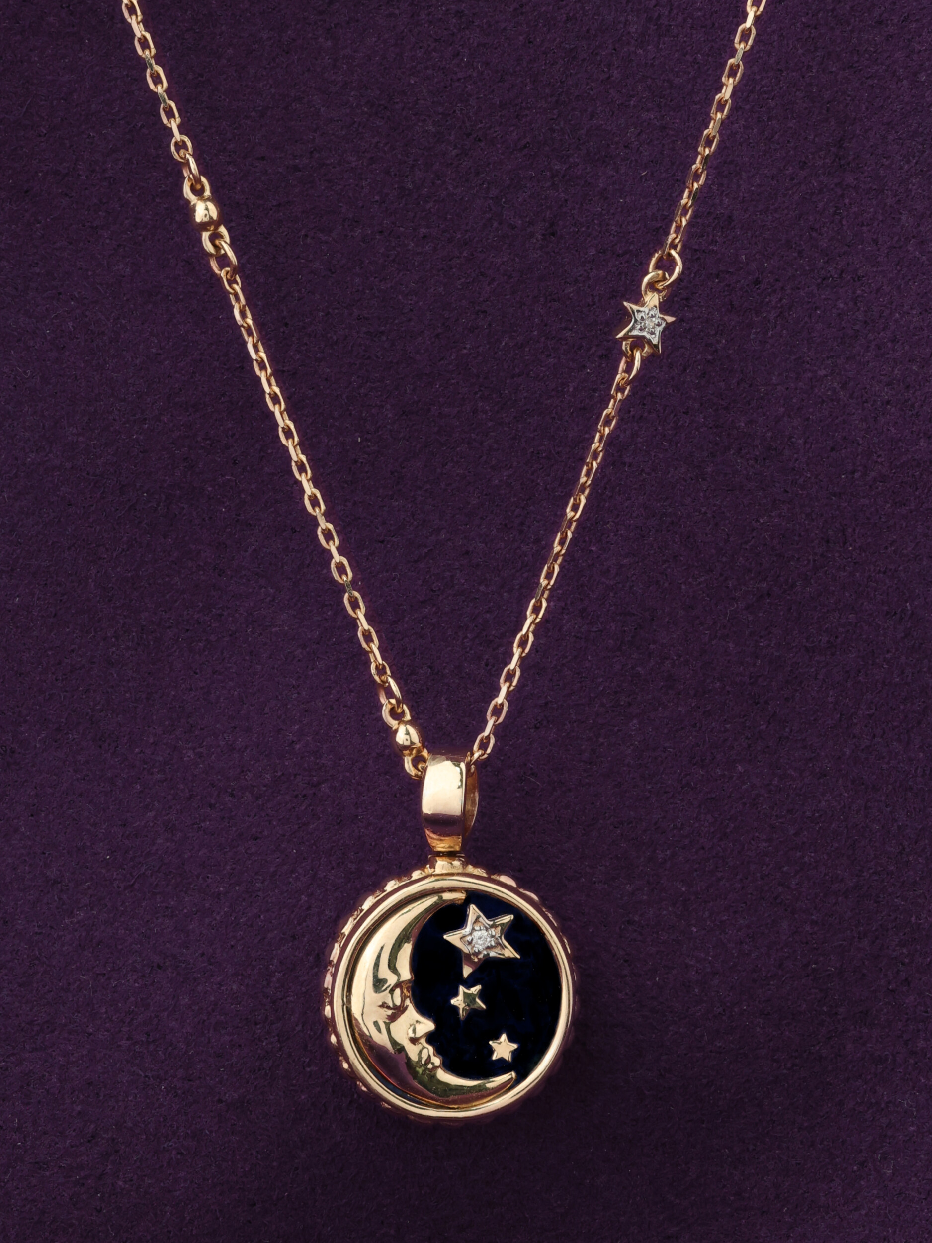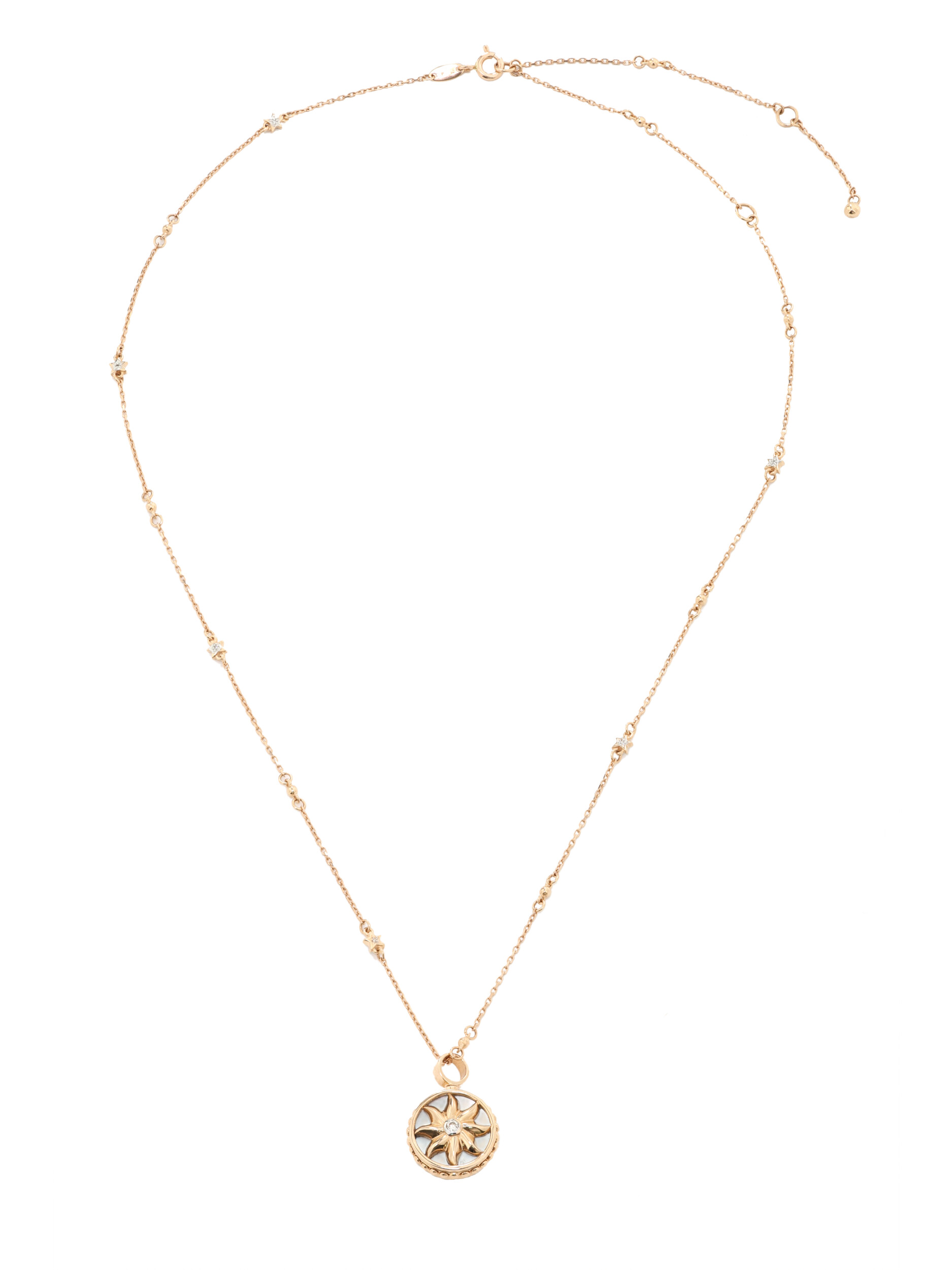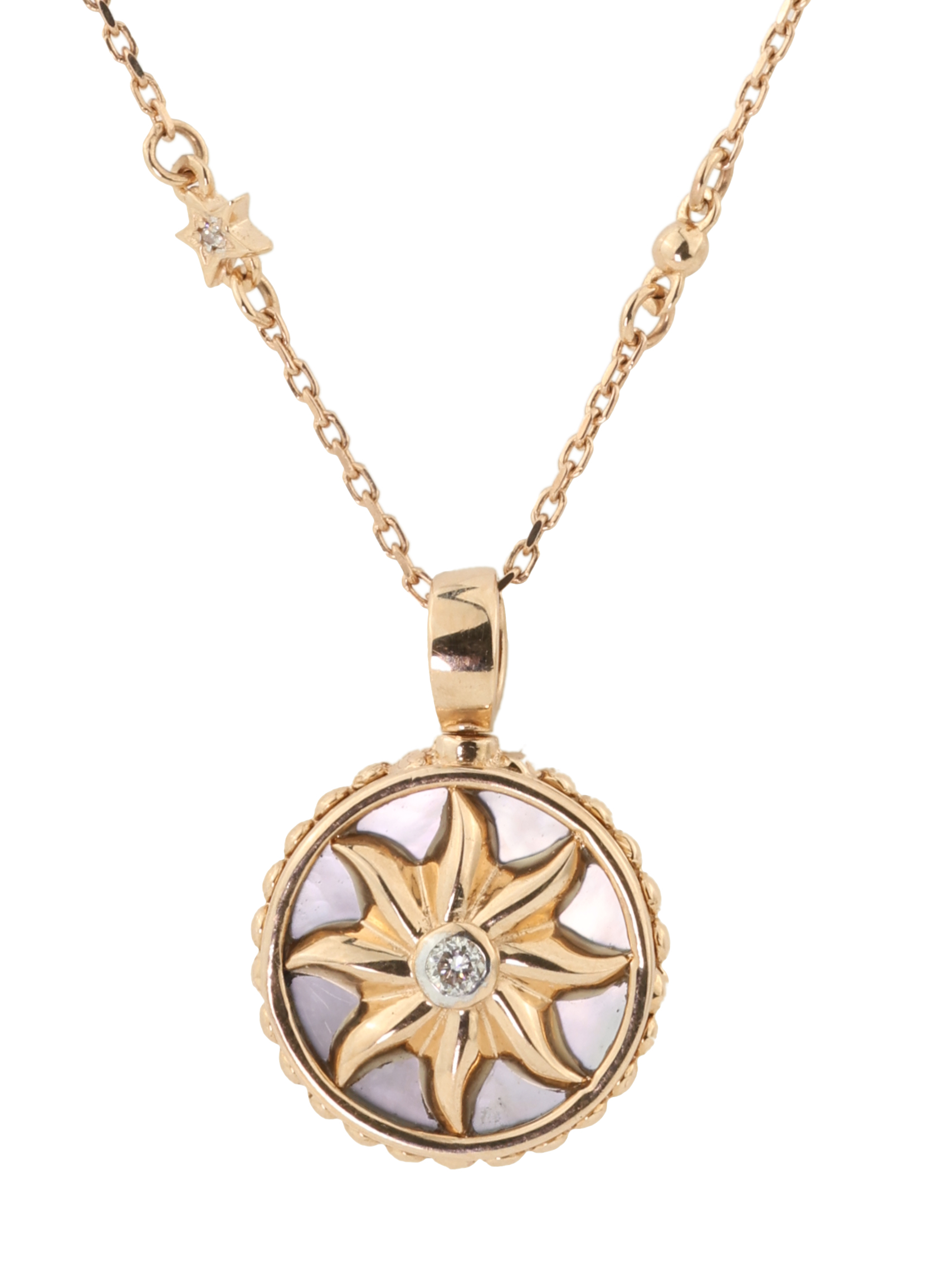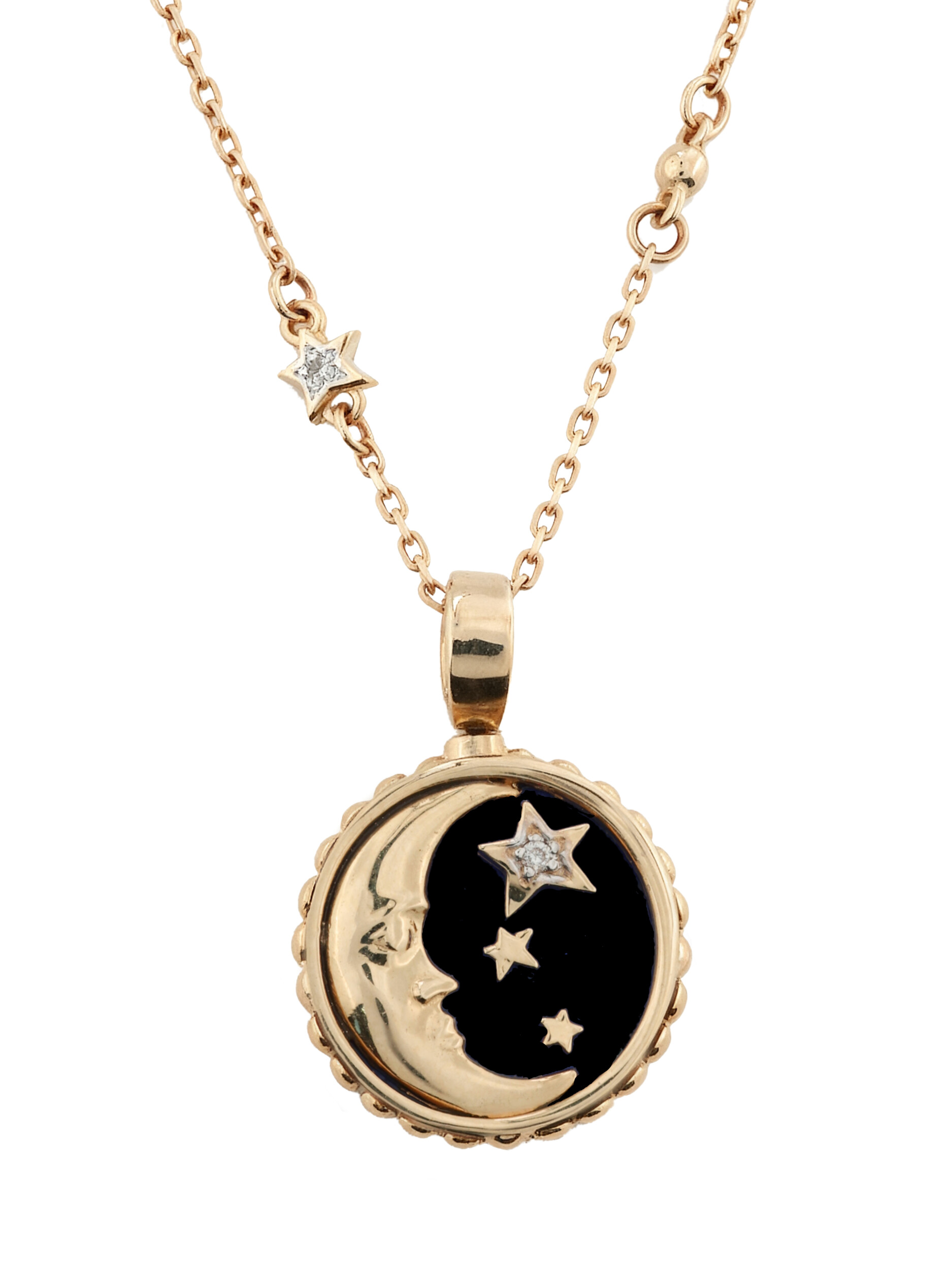 Колье из красного золота 585 пробы из коллекции De Luxe — Солнце и Луна станет утонченным дополнением вашего образа. Дизайн украшения, вдохновленный небесными светилами, обыгрывает тему солнца и луны, создавая загадочный и притягательный визуальный акцент. Центральная подвеска круглой формы выполнена с искусной детализацией: контрастное сочетание черного оникса и нежного перламутра подчеркивает сияние драгоценных камней. Изделие инкрустировано 15 вставками, среди которых чистые бриллианты, создающие эффект звездного неба.