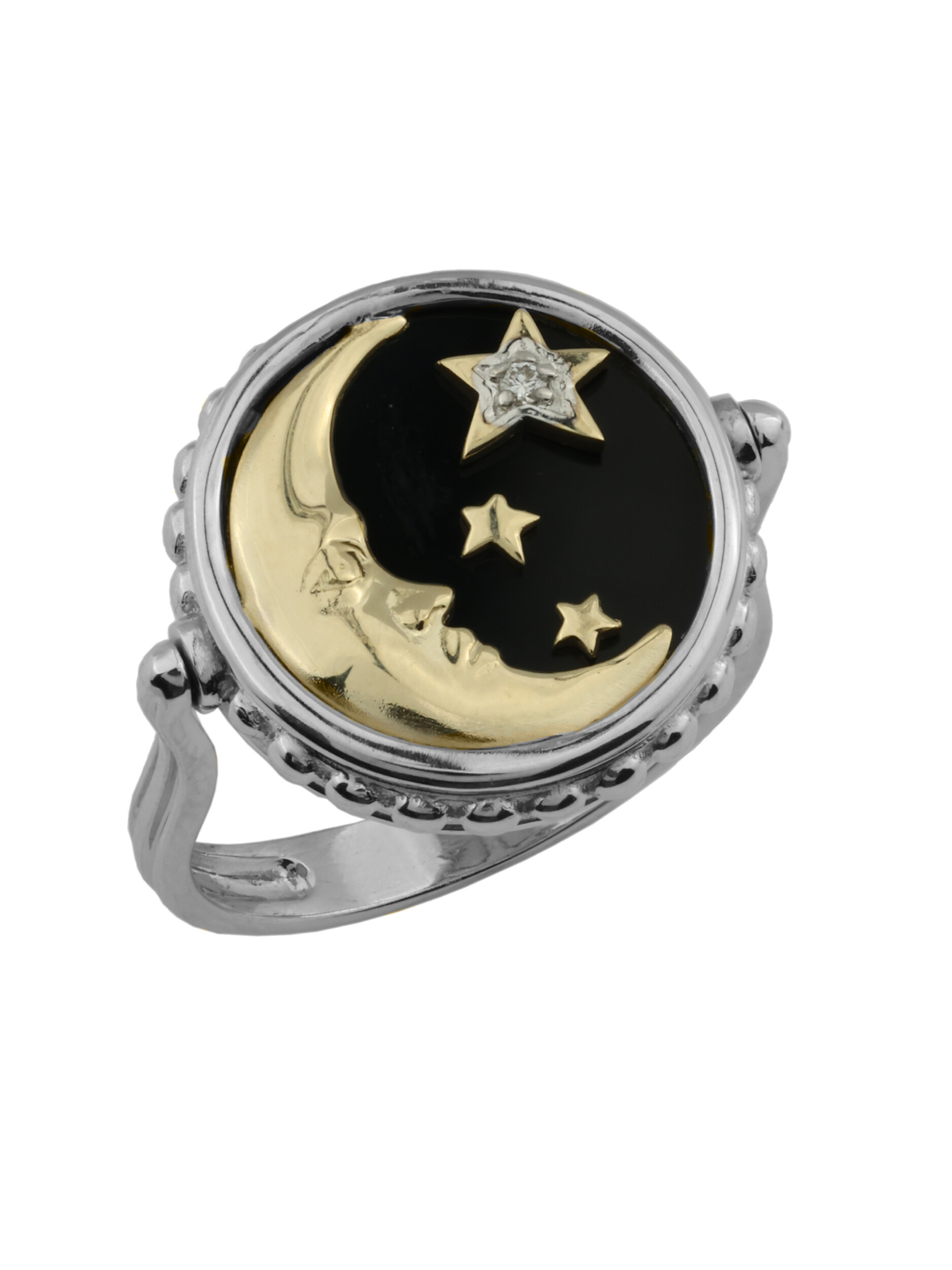 В центре композиции расположен глубокий черный оникс, на фоне которого сияет золотой полумесяц и изящные звезды. Инкрустация включает 3 вставки: сверкающий бриллиант, классический оникс и нежный перламутр круглой формы. Цветовое сочетание вставок — белый, перламутровый и черный — придает аксессуару особую выразительность и статусность.