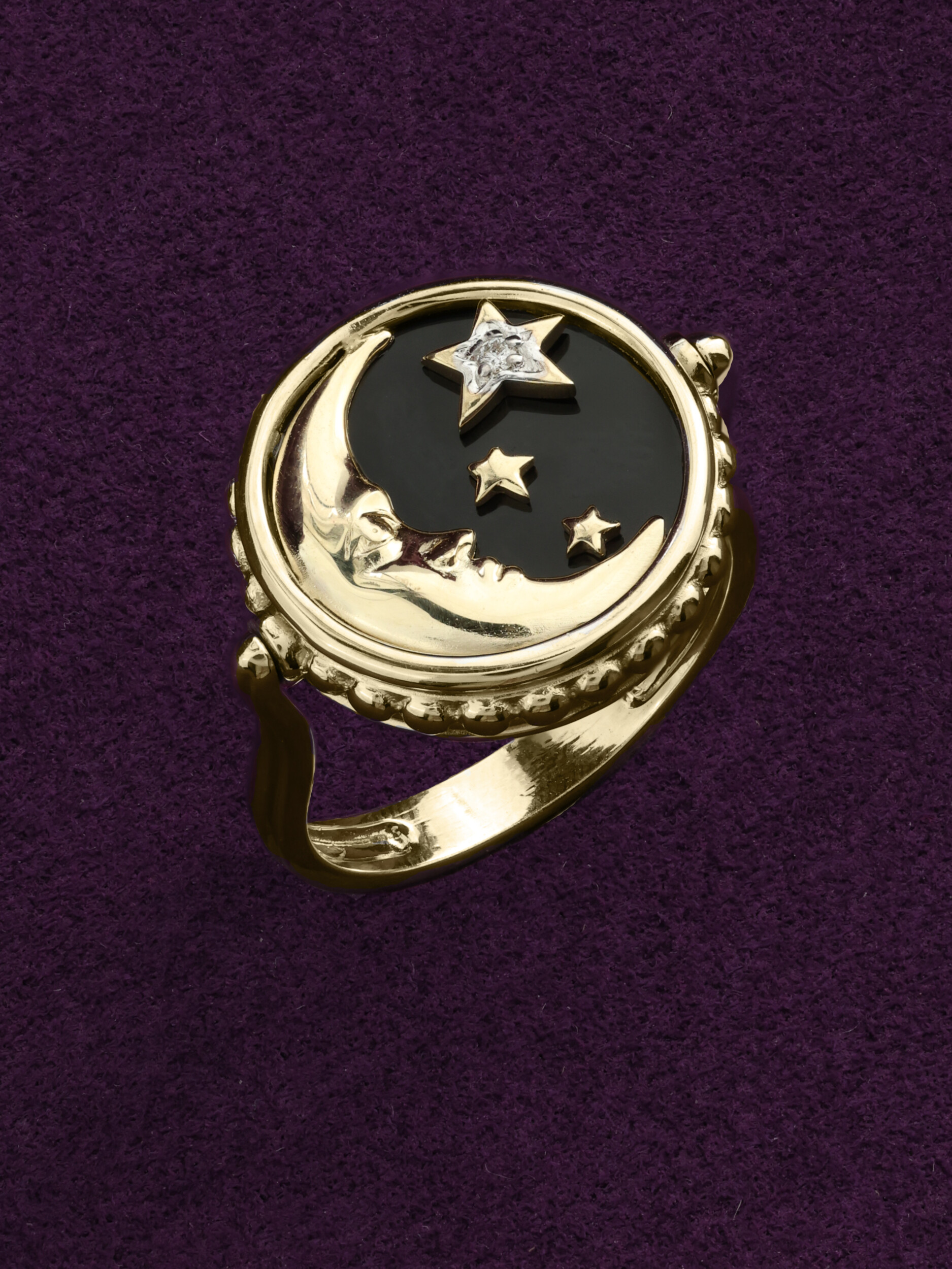 Кольцо из лимонного золота 585 пробы из коллекции De Luxe — Солнце и Луна воплощает в себе мистическую эстетику и высокое ювелирное мастерство. Дизайн украшения, вдохновленный образом Солнца и Луны, притягивает взгляд своей символичностью и глубиной. Центральная часть изделия выполнена в виде композиции с ониксом черного цвета, на фоне которого сияет золотой лик луны и три звезды. Изысканная игра контрастов дополняется блеском вставок: в изделии использовано 3 вставки круглой формы — бриллиант, оникс и перламутр, создающие переливчатое сочетание белого, перламутрового и черного оттенков.