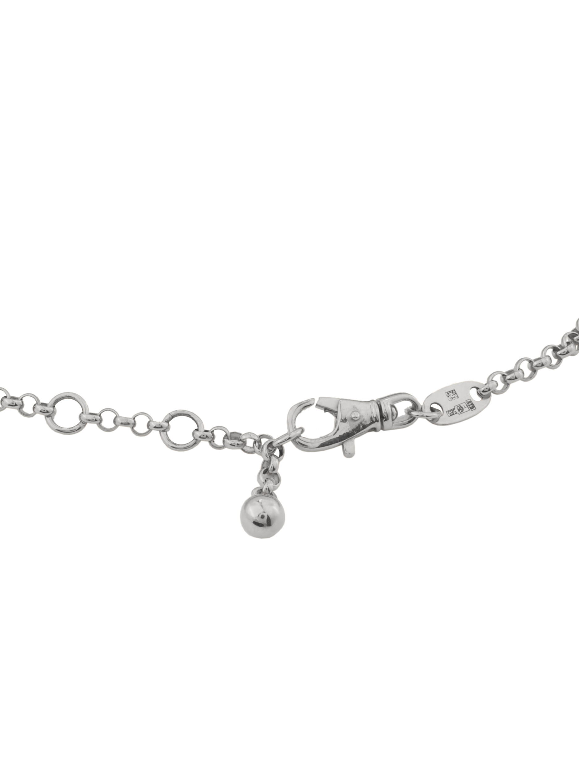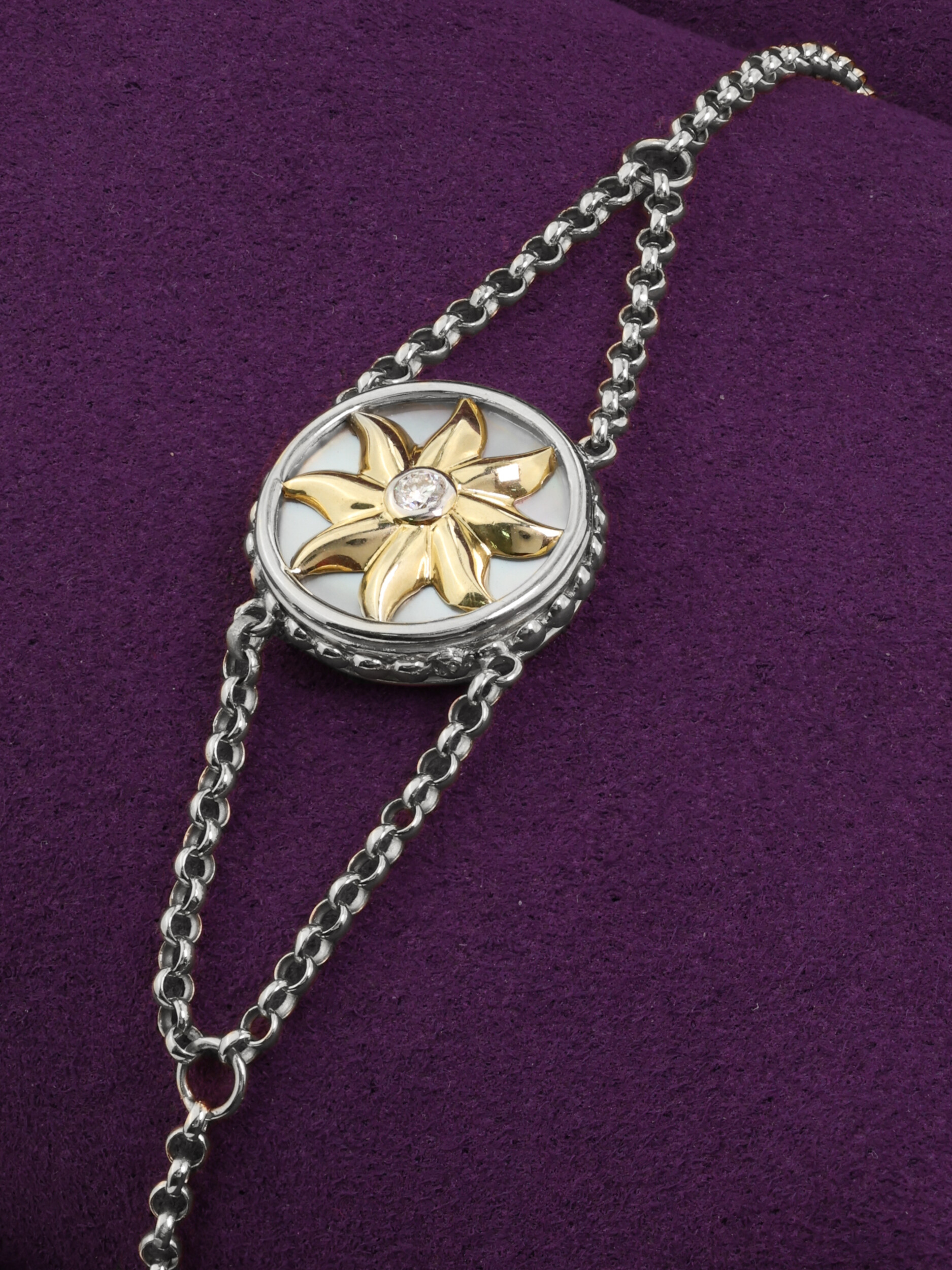В центре композиции расположены три вставки круглой формы: таинственный черный оникс, нежный перламутр и сверкающий бриллиант, которые создают завораживающую игру света и цвета. Белое золото идеально обрамляет каждый камень, усиливая блеск и сияние. Тонкая, прочная цепочка обеспечивает комфортную посадку на запястье, делая это украшение подходящим как для повседневного ношения, так и для торжественных выходов.
