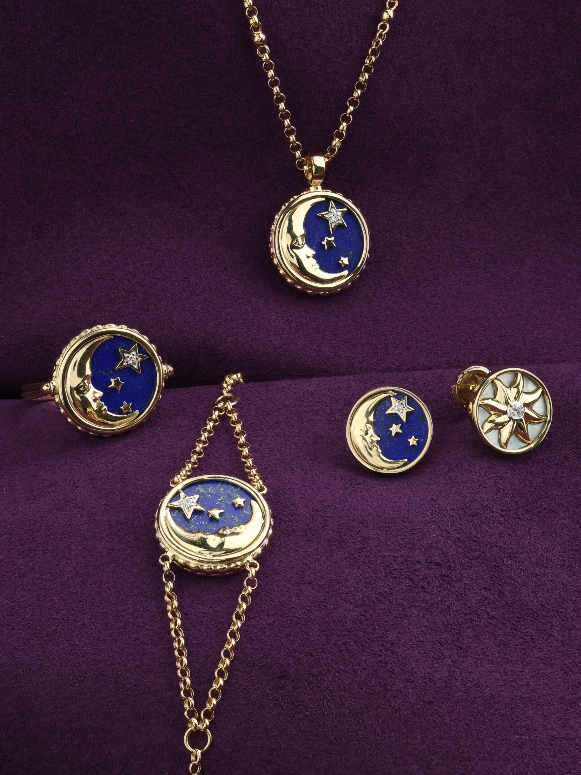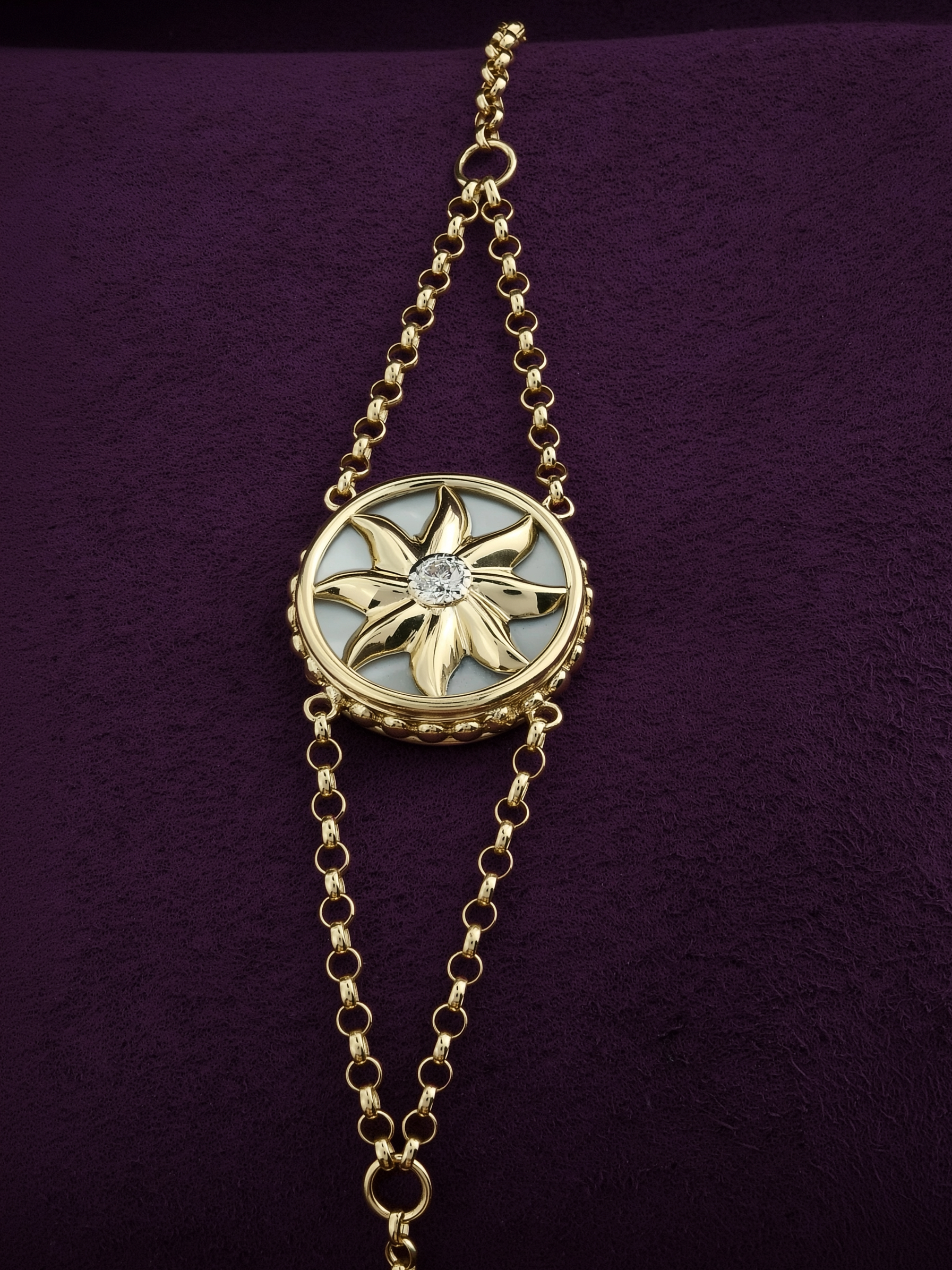 Эффектный браслет из лимонного золота 585 пробы — это украшение, в котором воплотилась магия ночного неба. Центральный элемент изделия выполнен в уникальном дизайне «Солнце/луна», который притягивает взгляд своей детализацией и глубиной. Насыщенный синий цвет лазурита в сочетании с нежным перламутром создает выразительный контраст, подчеркивающий благородный оттенок лимонного золота. Вставки круглой формы в количестве 3 штук гармонично дополнены сияющим бриллиантом, который расставляет яркие акценты на фоне глубокого цвета вставок.