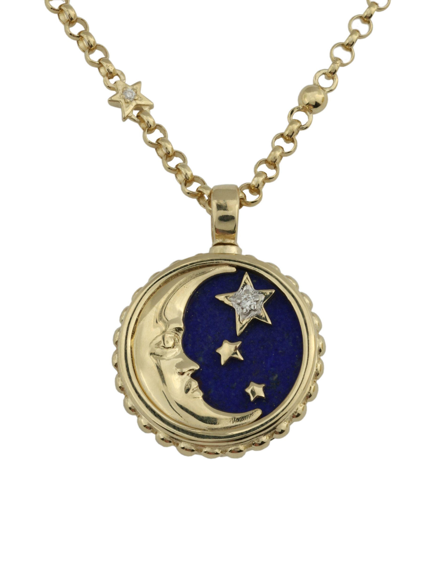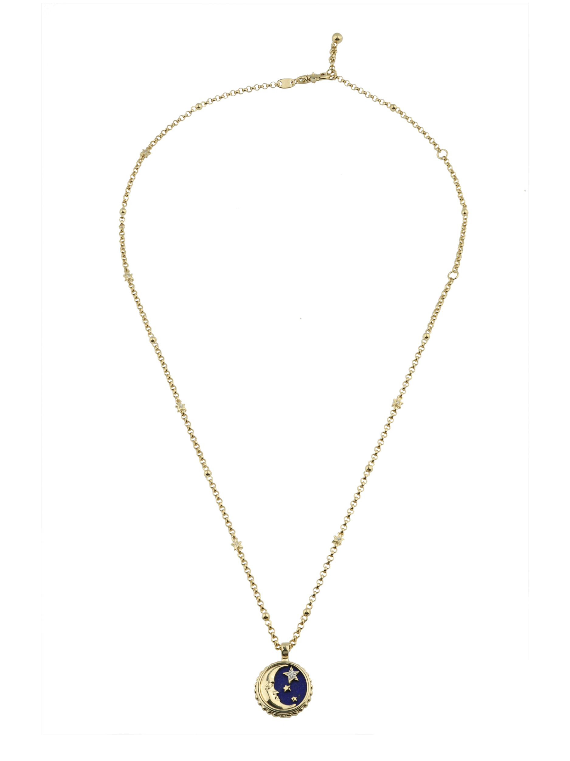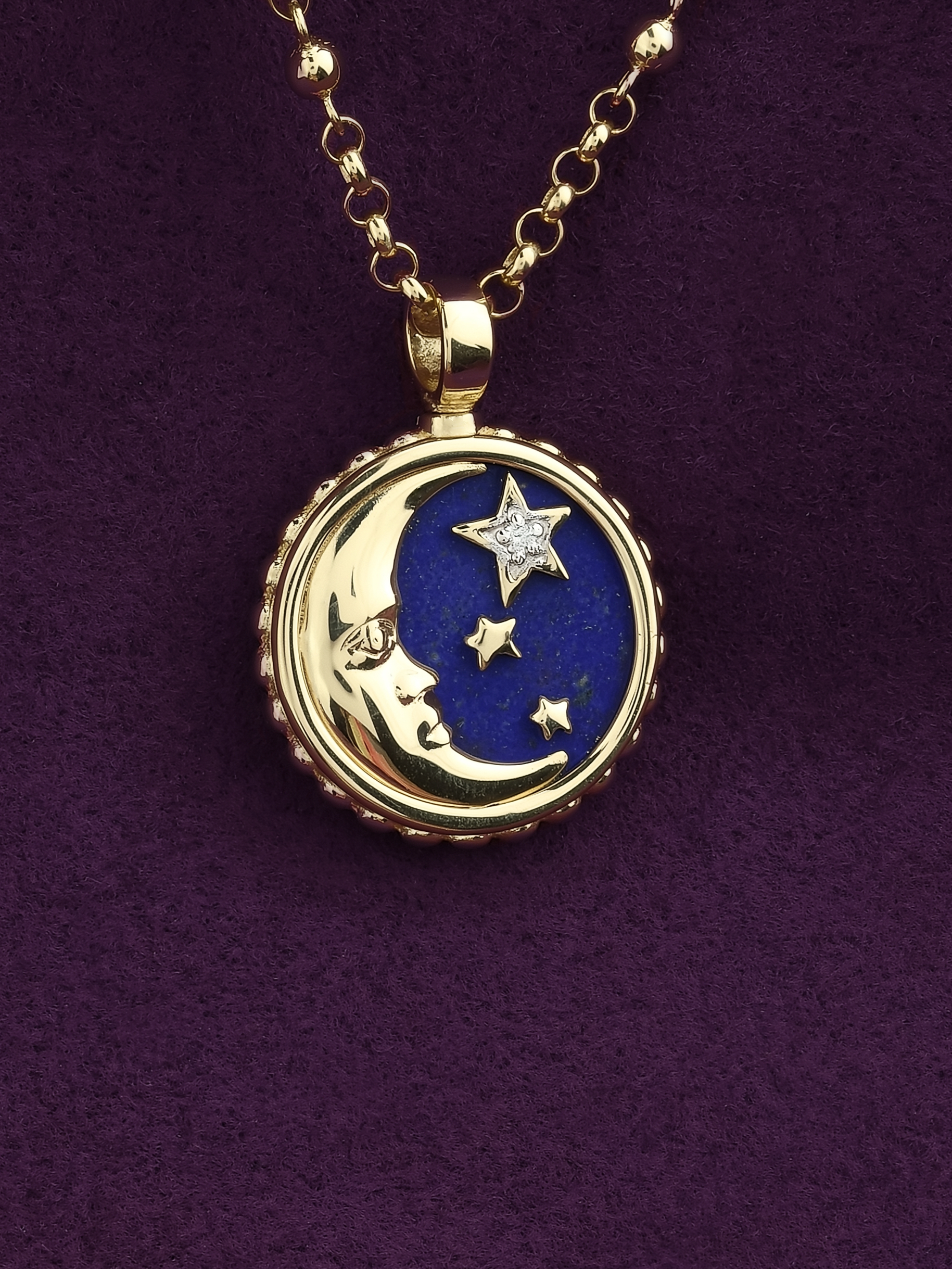 Колье из лимонного золота 585 пробы из коллекции De Luxe — Солнце и Луна станет изысканным акцентом вашего образа. Это украшение, воплощающее эстетику неба, притягивает взгляд своей необычной концепцией дизайна в виде солнца и луны. Основа колье выполнена из благородного лимонного золота, которое идеально сочетается с глубоким синим оттенком лазурита, создавая контрастное и глубокое ювелирное полотно.