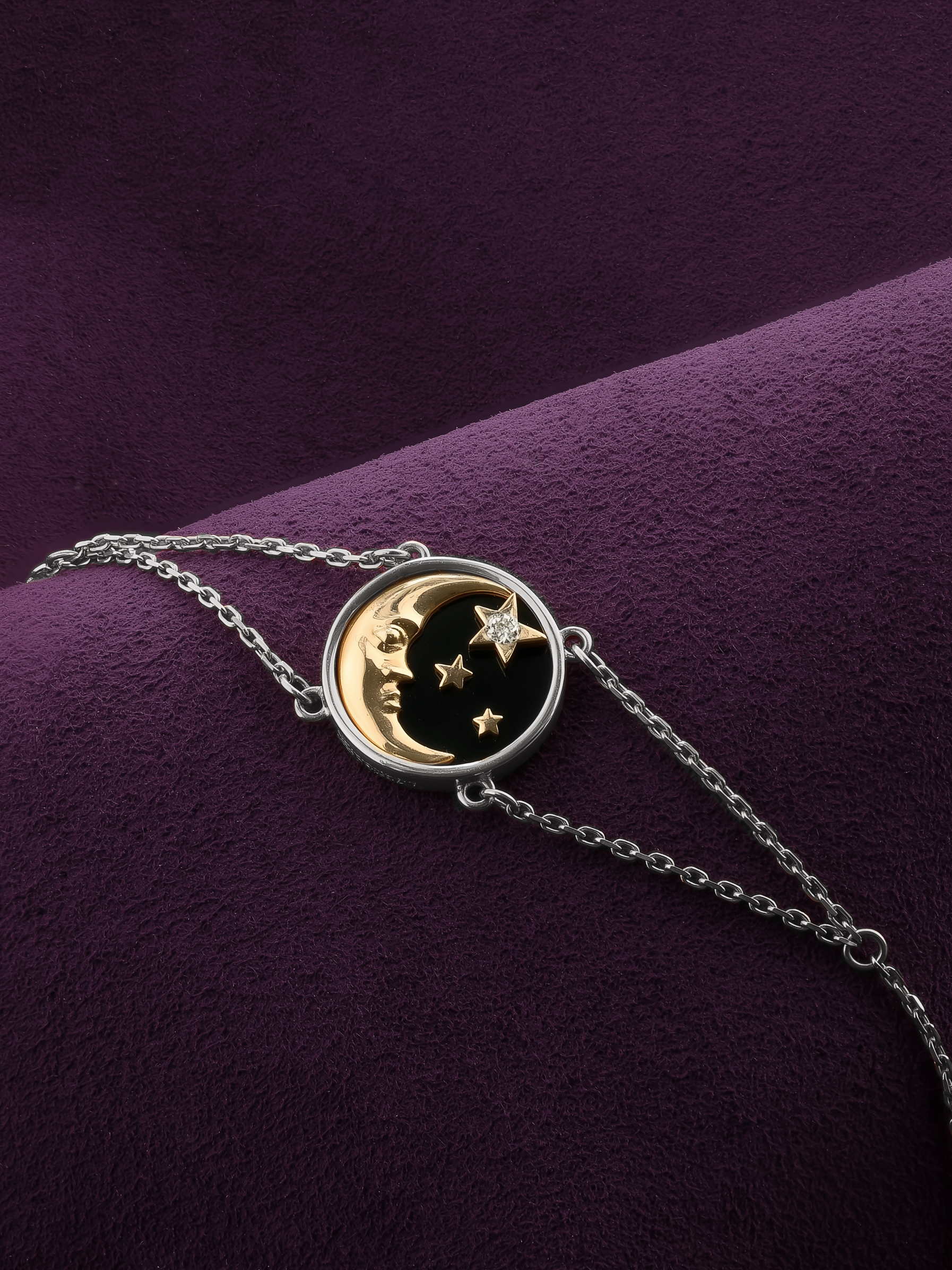 Это украшение разработано как для женщин, так и для мужчин, предпочитающих лаконичные, но глубокие по смыслу аксессуары. Браслет станет великолепным самостоятельным украшением или частью комплекта, поддерживающего единую стилистику образа. Каждая деталь подчеркивает мастерство исполнения, превращая изделие в timeless-аксессуар. Добавьте в свой гардероб частицу ночного неба, воплощенную в драгоценных металлах и камнях.