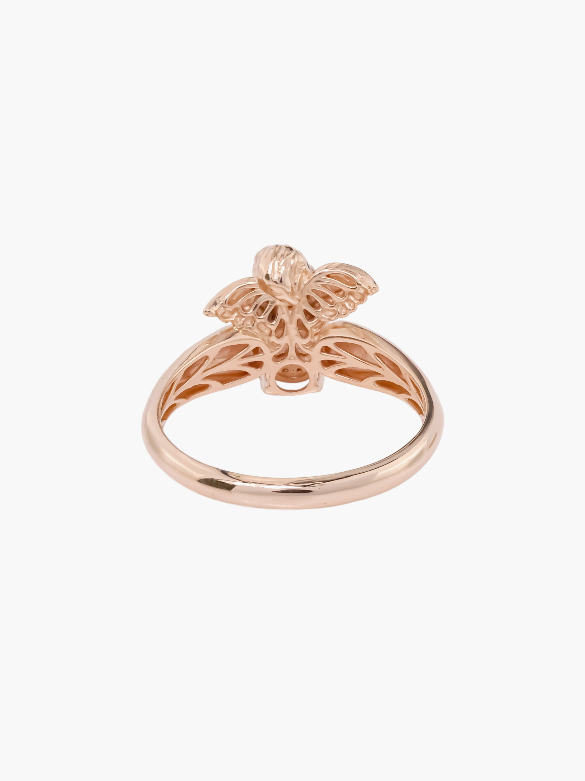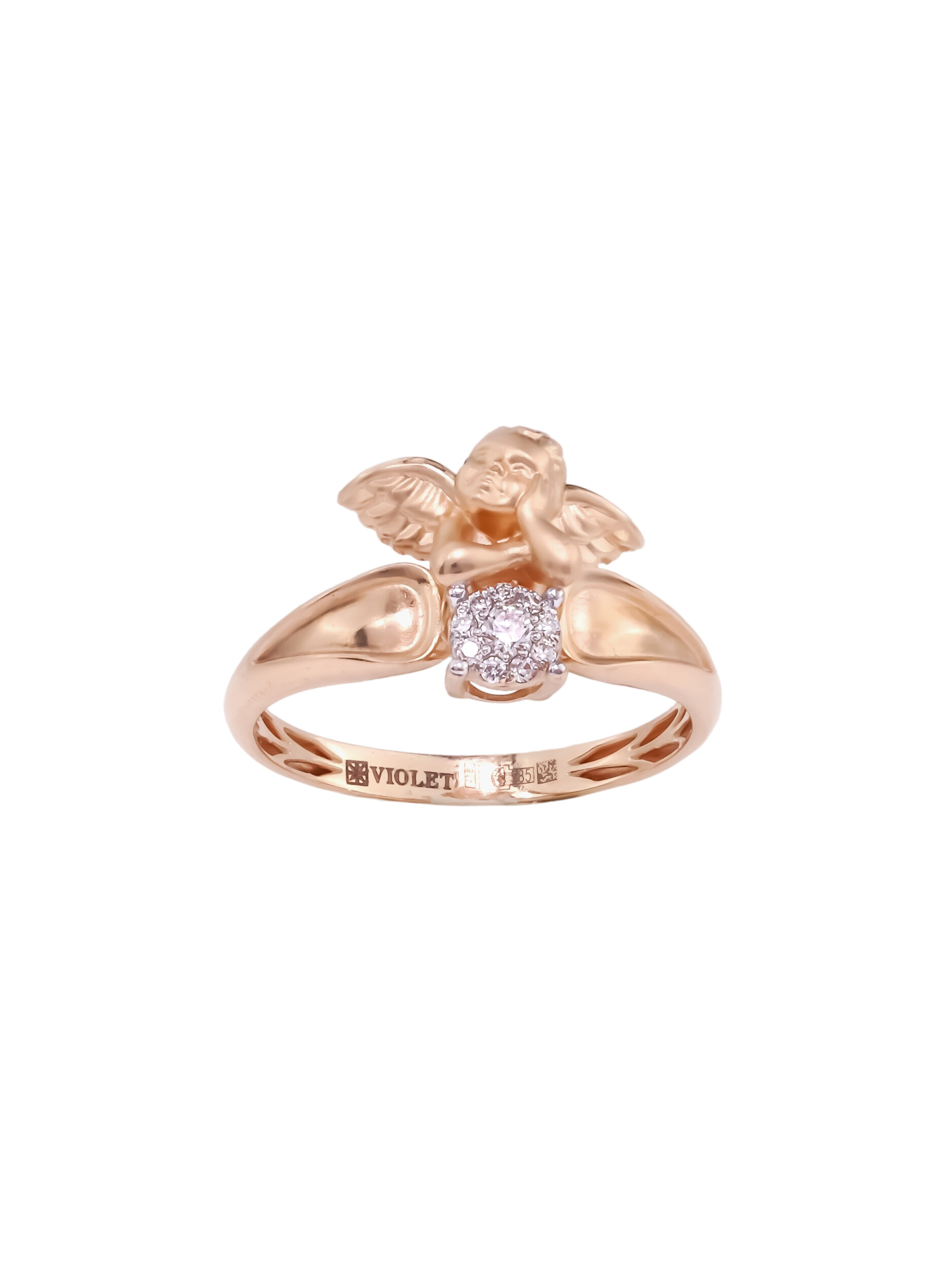 Изысканное кольцо из красного золота 585 пробы станет утонченным дополнением вашего образа или значимым подарком для близкого человека. Украшение из коллекции De Luxe — Купидоны отличается оригинальным дизайнерским решением: центральным элементом изделия является искусная фигурка купидона, символизирующая любовь и нежность. Гармоничный дуэт драгоценному металлу составляет композиция из 10 белых бриллиантов круглой формы, которые эффектно играют гранями, придавая кольцу особенное сияние.