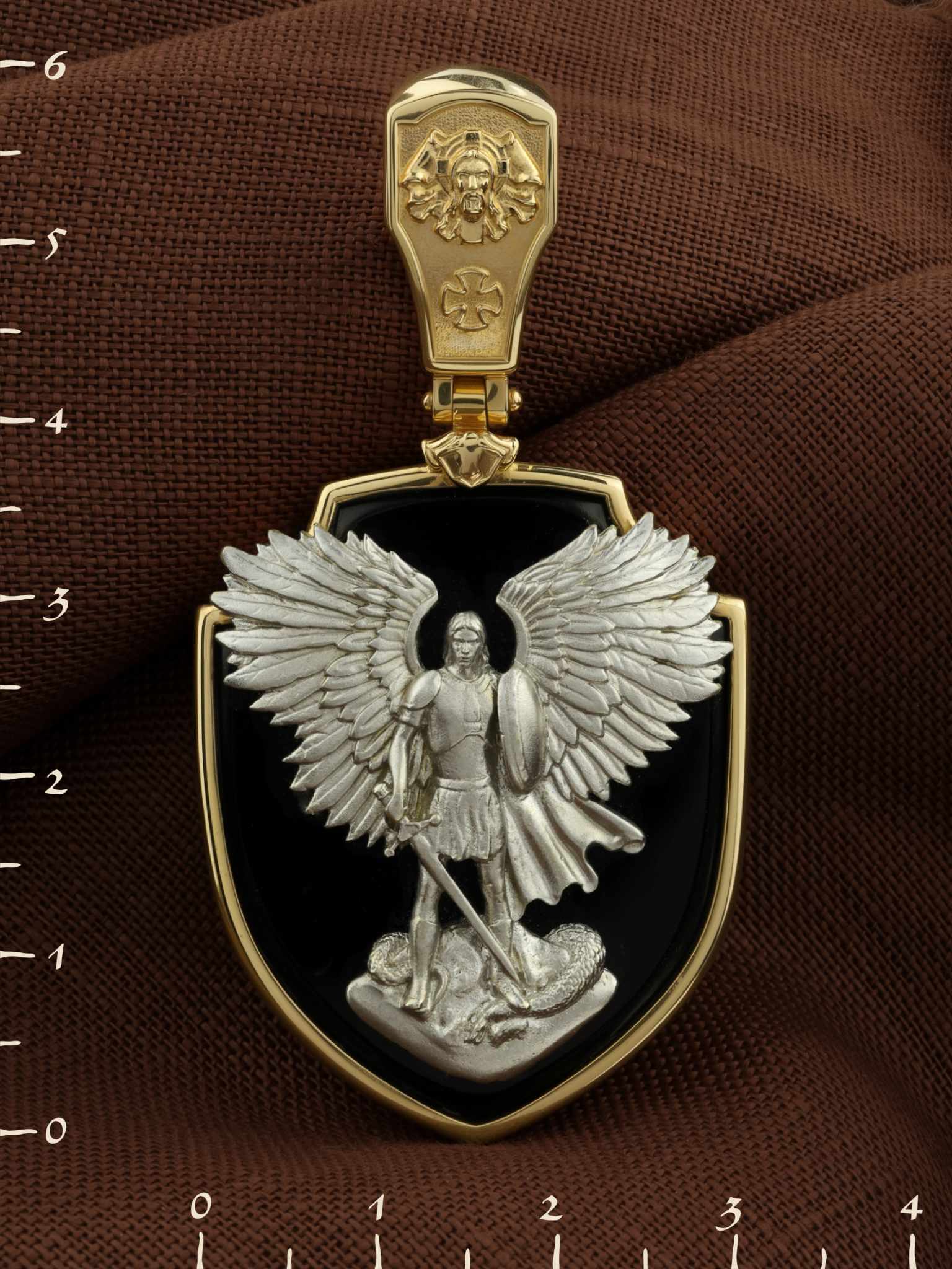 На лицевой стороне образка размещено изображение Архангела Михаила — верного служителя Божия, который низринул с Неба возгордившегося денницу с другими павшими духами. В Православии его называют Архистратигом, что означает глава святого воинства Ангелов и Архангелов. Образок сделан в виде воинского щита. Архангел Михаил изображен в воинственном виде с огненным мечом в правой руке и щитом в левой поражающим змея. Змей символизирует собою сатанинские силы. Архангел почитается, как покровитель воинов и всех верных Богу и ведущих борьбу против сил зла, борец против ересей, а также защитник душ умерших, страж райских врат. С древних времен прославлен своими чудесами Архангел Михаил на Руси. Примеров явления и помощи Архистратига Михаила в русской истории бессчетно. Архангел Михаил не перестает ратоборствовать за славу Творца и Господа всяческих, за дело спасения рода человеческого, за церковь и чад ее. И, согласно, Откровению Иоанна Богослова во время последней битвы небесных и дьявольских сил Михаил и его ангелы опять низвергнут люцифера вместе с его войском: «Михаил и Ангелы его воевали против дракона, и дракон и ангелы его воевали [против них], но не устояли, и не нашлось уже для них места на небе. И низвержен был великий дракон, древний змий, называемый диаволом и сатаною, обольщающий всю вселенную, низвержен на землю, и ангелы его низвержены с ним» (Откр.12:7−9). На кулонном кольце изображен Нерукотворный образ Господа и Спасителя нашего Иисуса Христа, чудесно отпечатавшийся на плате, которым Христос вытер свой лик.