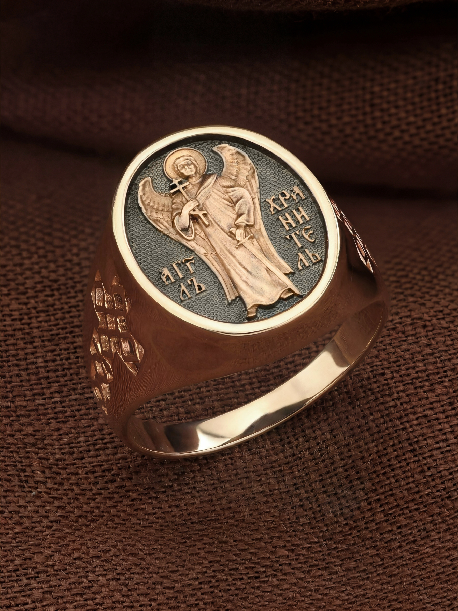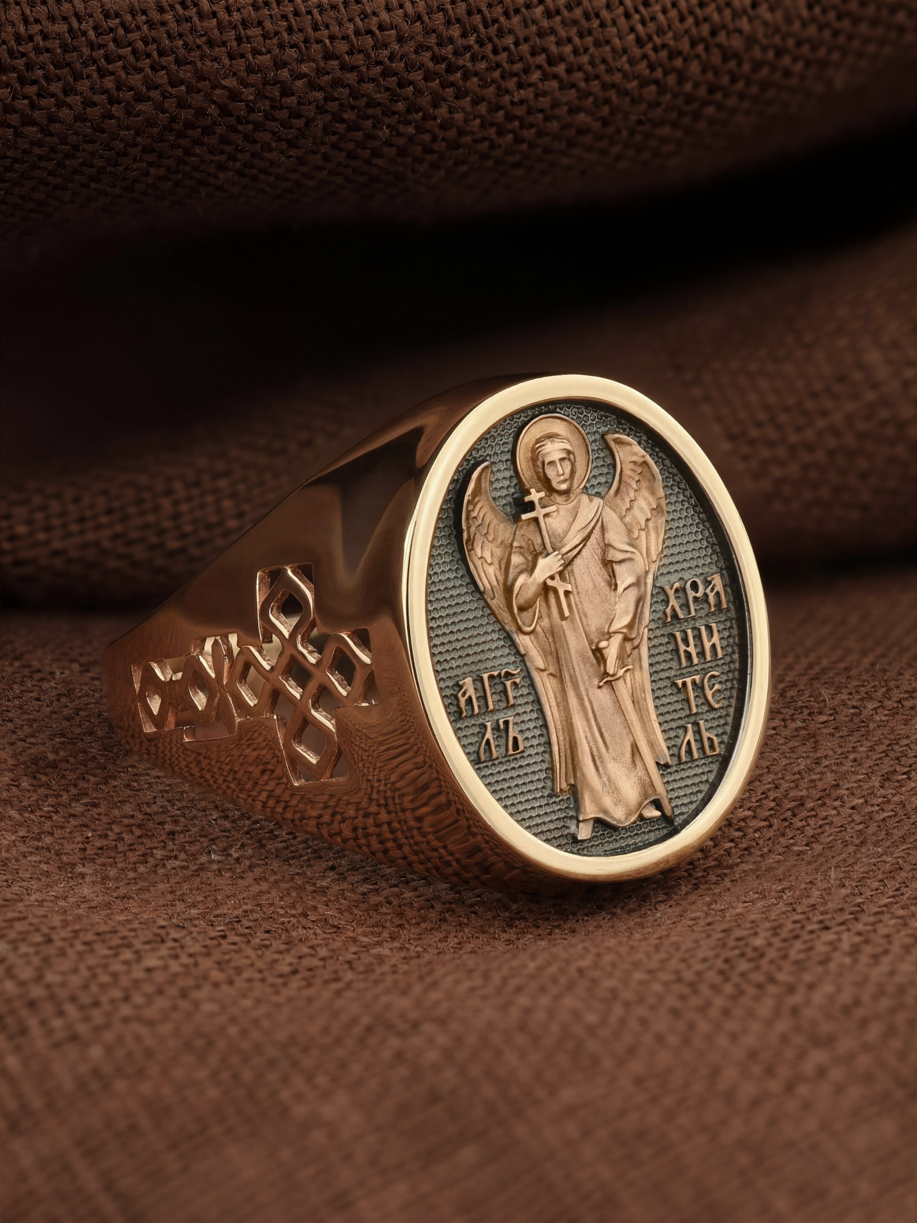Кольцо «Святой Ангел-Хранитель " выполнено в древних христианских традициях. Ангел-Хранитель — это Ангел приставляемый Богом к человеку при крещении для охраны и помощи в добрых делах. Он невидимо находится при человеке на протяжении всей его жизни, если человек сохраняет в себе любовь к Богу и истинную веру перед Ним. Ангел-Xранитель делают для нас все, что служит к истинному нашему благу и спасению. Невидимо пребывая при нас постоянно, он, руководствуя нас ко спасению, не только по нашему желанию таинственно наставляет нас на все доброе и полезное, не только возносит наши молитвы к Богу, но еще и сам от себя охраняют и защищают нас от врагов видимых и невидимых и ходатайствует за нас пред Богом. Ангел-Хранитель так любит нас, как никто на земле любить не может. Ангел-Хранитель — присный друг наш, незримый тихий собеседник, пресладостный утешитель. Одного лишь каждому из нас он желает — спасения души; к этому он направляет все свои заботы. И если видит нас также заботящимися о спасении, радуется, если же видит нас пребывающими в нерадении о душе своей, скорбит.