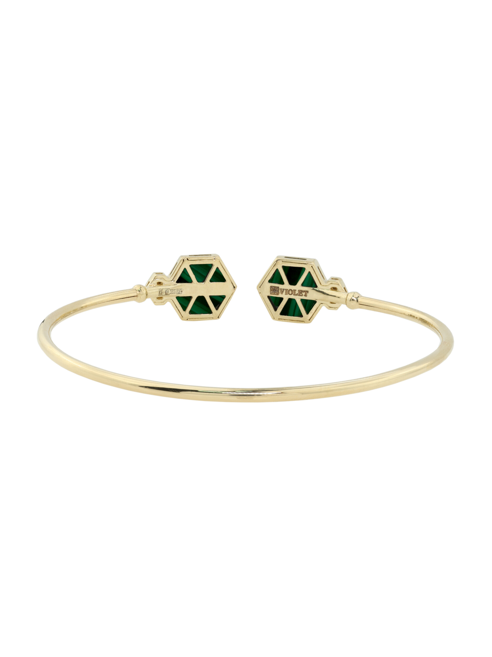 Центральными элементами композиции выступают девять вставок, выполненных в двух формах: строгие шестигранники и сияющие круги. Насыщенный зеленый цвет малахита великолепно сочетается с благородным лимонным оттенком золота, а чистые белые бриллианты добавляют браслету ослепительного блеска. Контрастное сочетание цветов и геометрических форм делает этот аксессуар поистине уникальным.