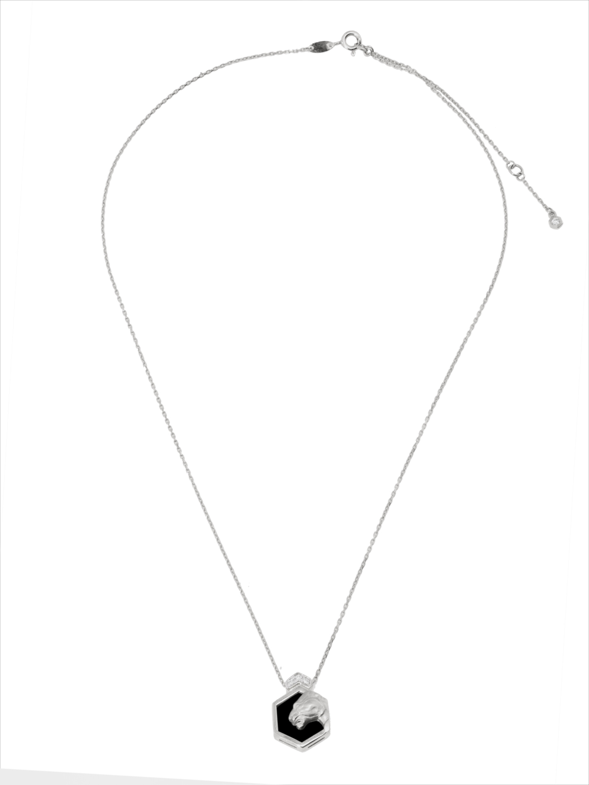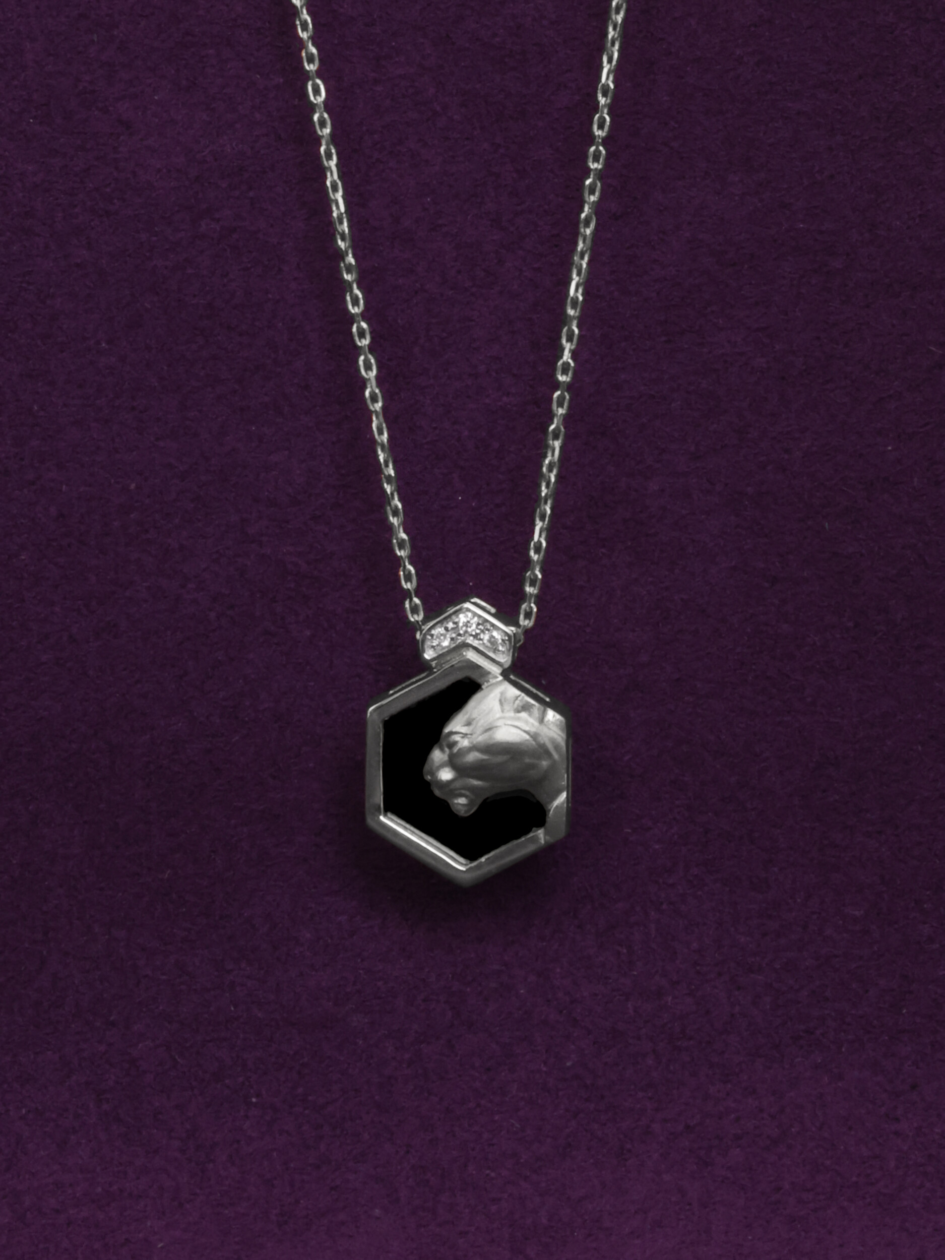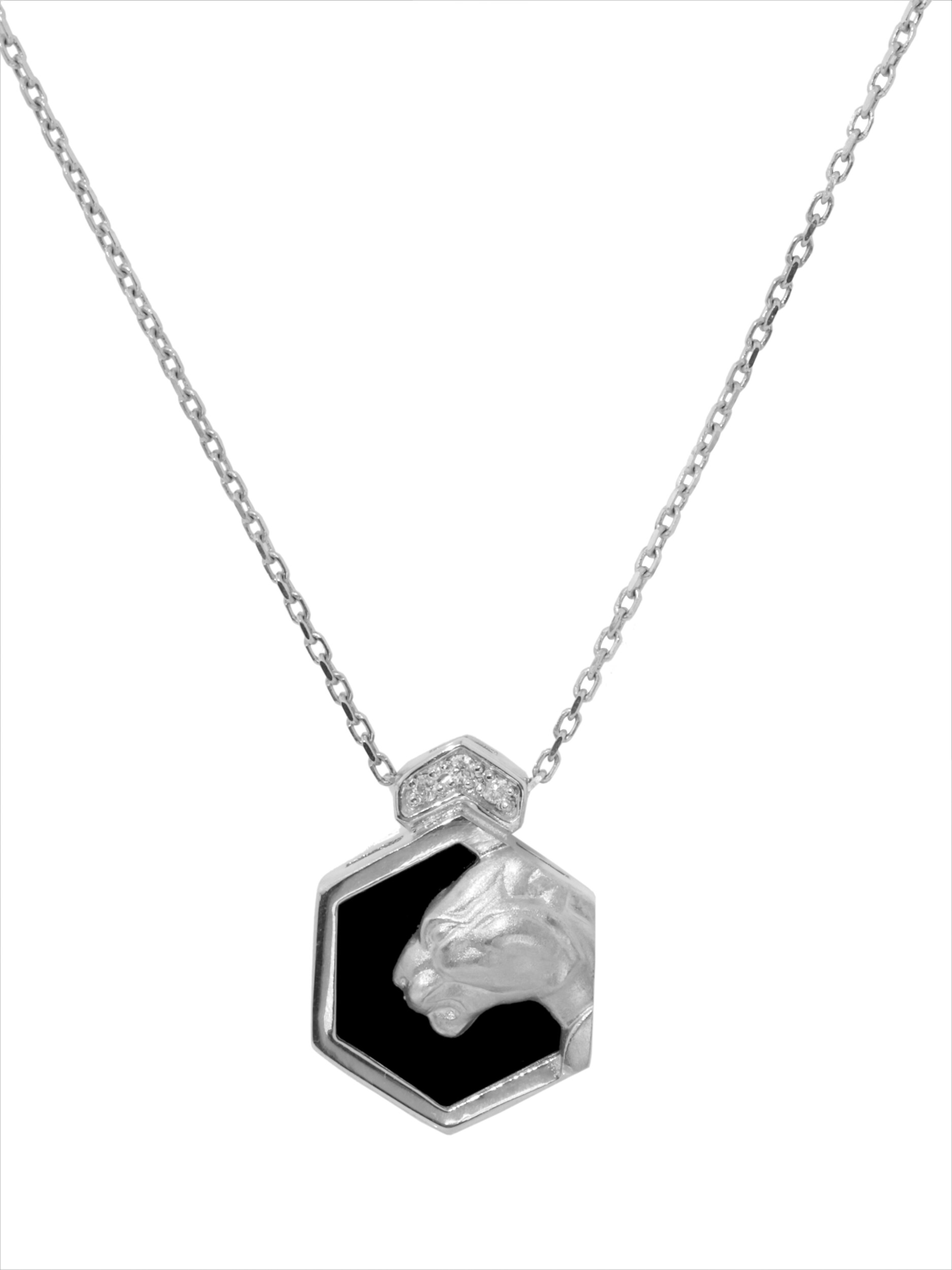 Элегантное колье из белого золота 585 пробы из коллекции De Luxe — Гексагон станет безупречным акцентом в вашем образе. Дизайн украшения воплощает грацию и силу: центральным элементом выступает выразительный силуэт пантеры, выполненный с ювелирной точностью. Геометрическая форма подвески-шестигранника придает изделию современный и динамичный вид, сочетая в себе строгость линий и роскошь материалов.