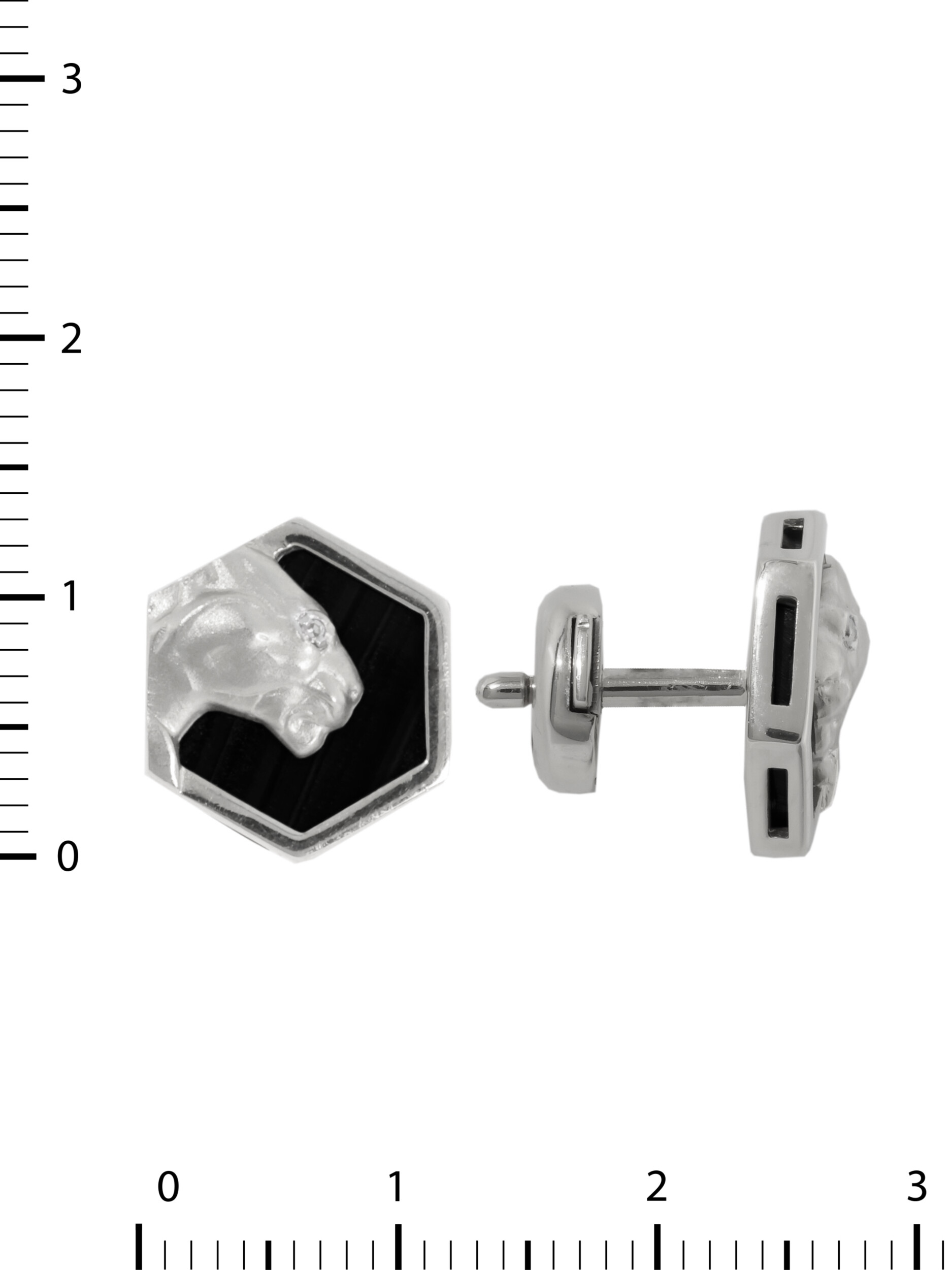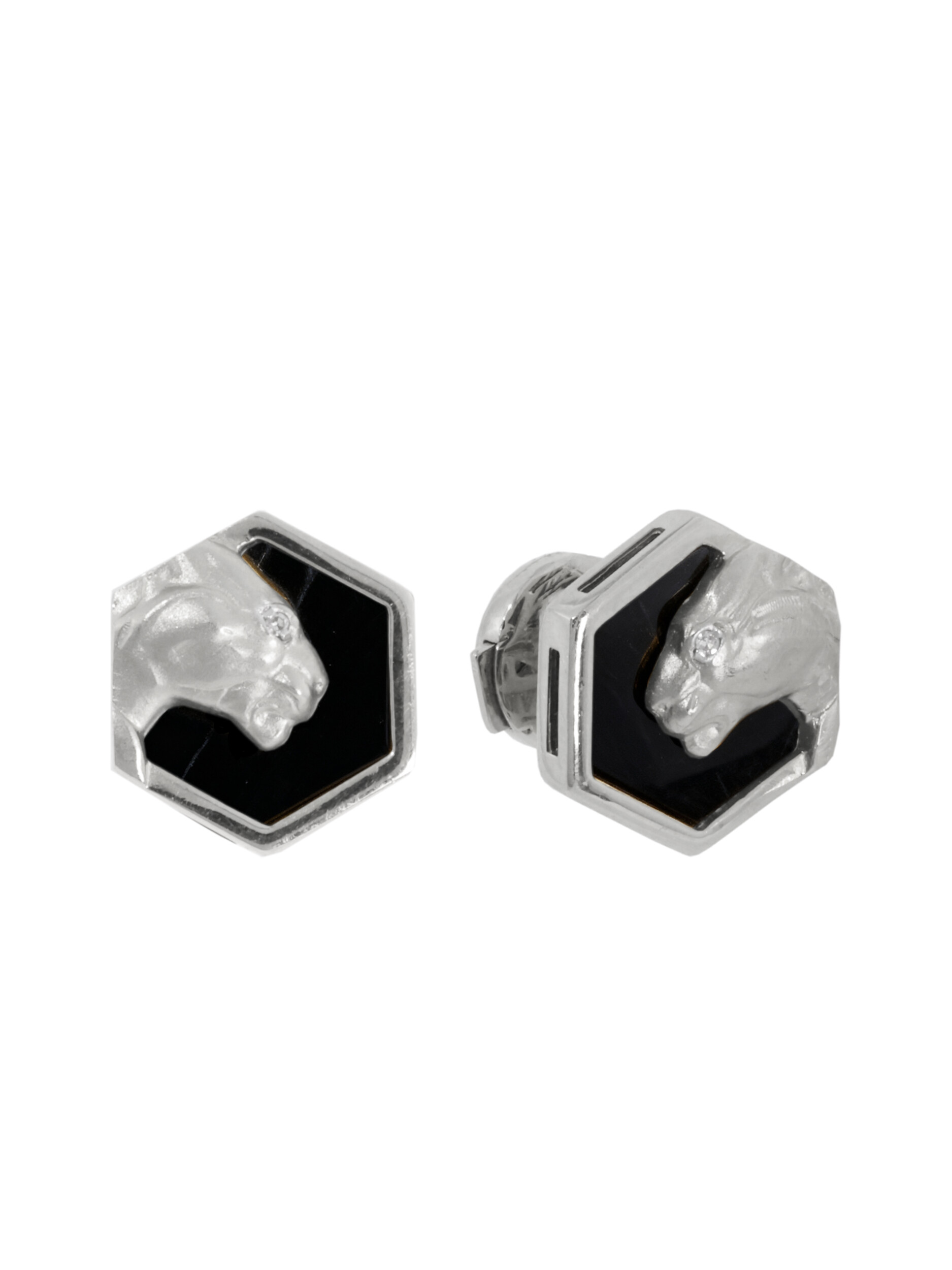 Основа изделия выполнена из благородного белого золота, создающего холодный и глубокий блеск, который подчеркивает контраст вставок. В центре композиции расположен черный оникс шестигранной формы, служащий идеальным фоном для объемного изображения пумы. Взгляд хищника акцентирован искристой чистотой круглого бриллианта, что добавляет изделию премиальности. Всего в модели использованы 4 вставки, создающие завершенный и выразительный облик.