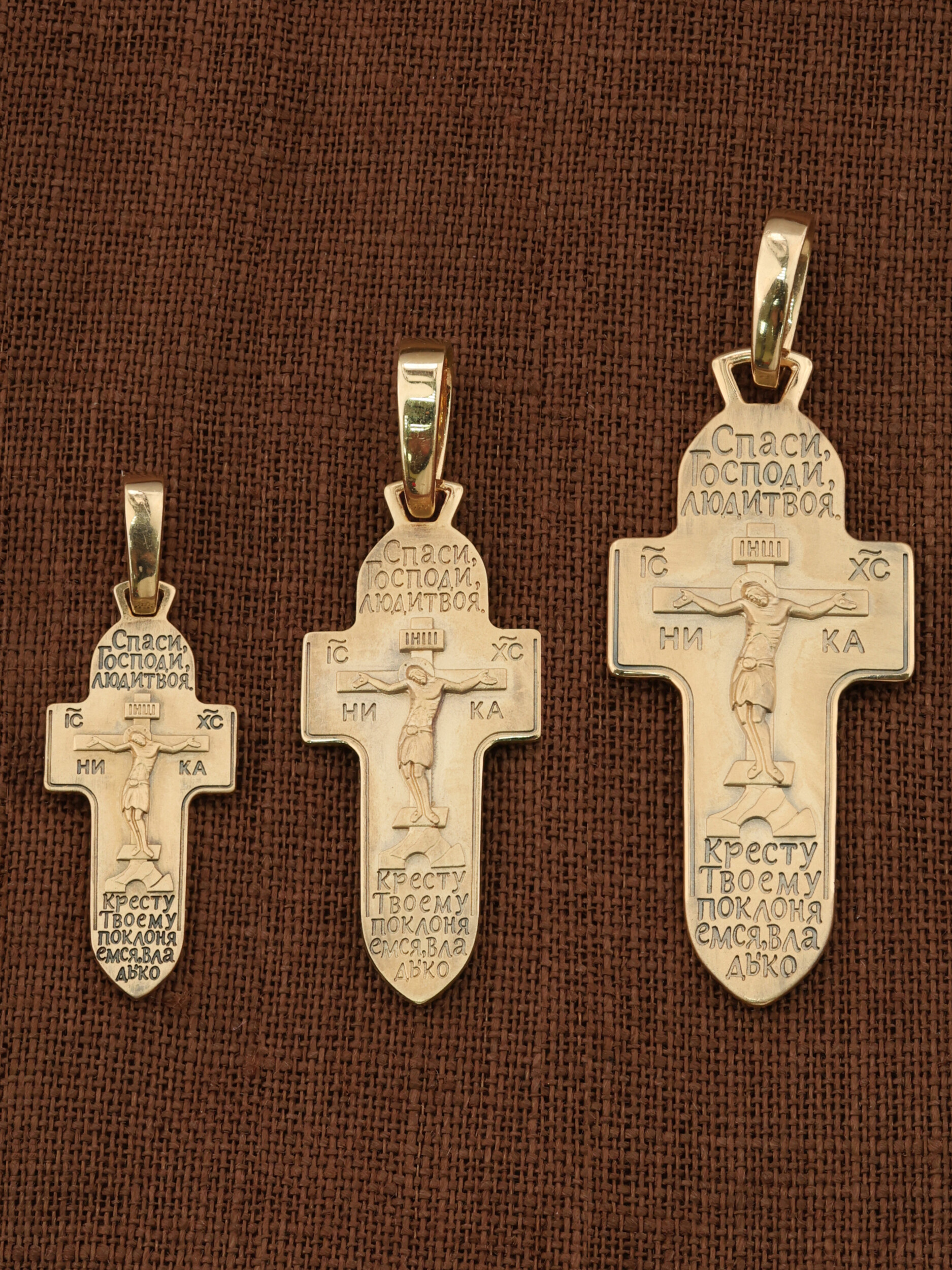 На лицевой стороне креста изображено Распятие Господа и Спасителя нашего Иисуса Христа. Крест- символ спасения и искупления рода человеческого, знамение победы над смертью и адом. Иисус Христос, как искупительная жертва освобождения человечества от власти греха, умер крестной смертью и в третий день воскрес. На верхней табличке, выше головы Иисуса, расположена надпись, составленная Понтием Пилатом — «IНЦI». Она означает «Иисус Назорей, Царь Иудейский». Надпись «IC» «ХC», означает Иисус Христос, помещается на разных сторонах поперечной перекладины креста. Под ней помещено слово «НIКА», что означает Победитель. Крест стоит на горе камней, символизирующих Голгофу.