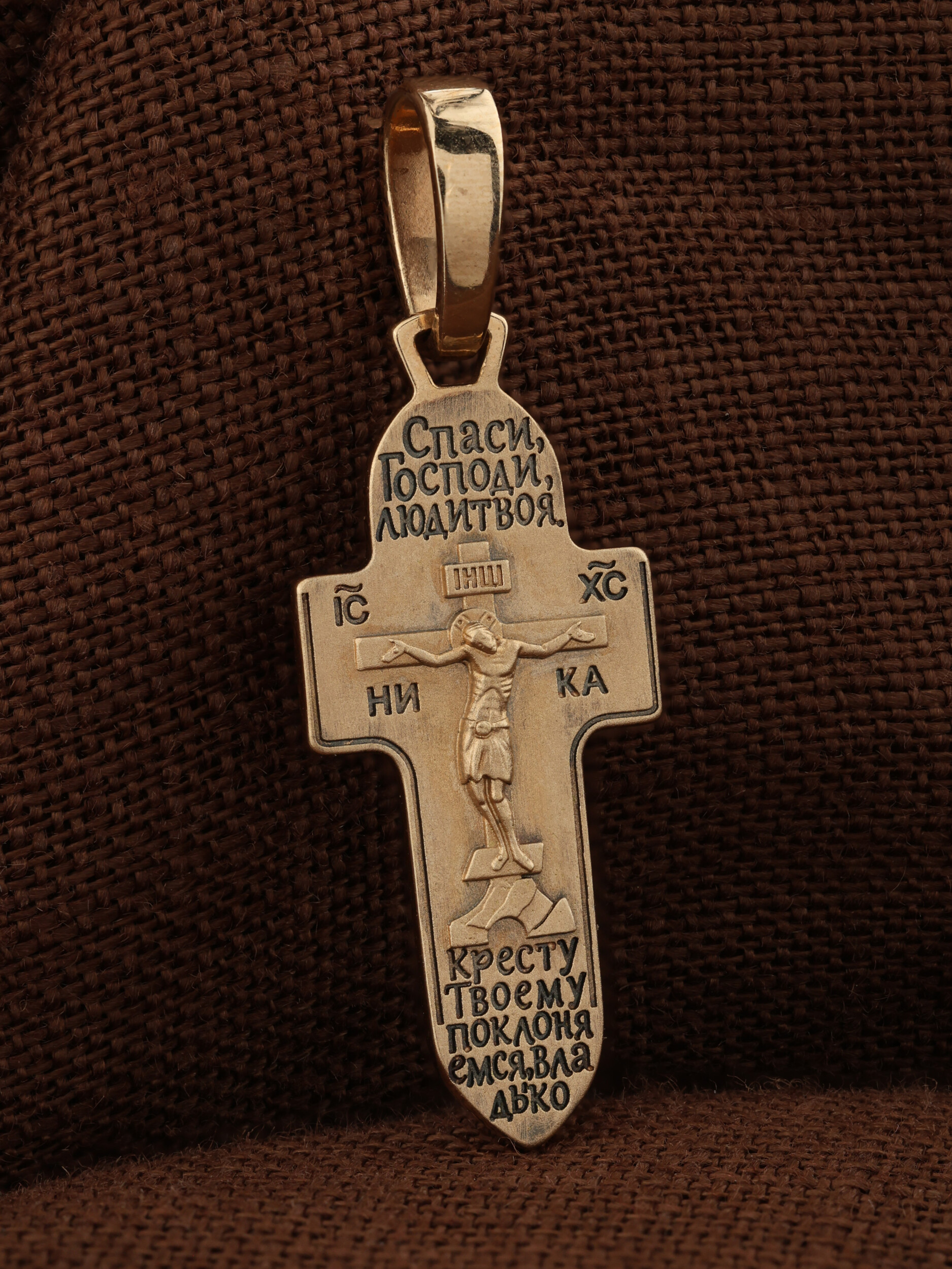 На лицевой стороне креста изображено Распятие Господа и Спасителя нашего Иисуса Христа. Крест- символ спасения и искупления рода человеческого, знамение победы над смертью и адом. Иисус Христос, как искупительная жертва освобождения человечества от власти греха, умер крестной смертью и в третий день воскрес. На верхней табличке, выше головы Иисуса, расположена надпись, составленная Понтием Пилатом — «IНЦI». Она означает «Иисус Назорей, Царь Иудейский». Надпись «IC» «ХC», означает Иисус Христос, помещается на разных сторонах поперечной перекладины креста. Под ней помещено слово «НIКА», что означает Победитель. Крест стоит на горе камней, символизирующих Голгофу.